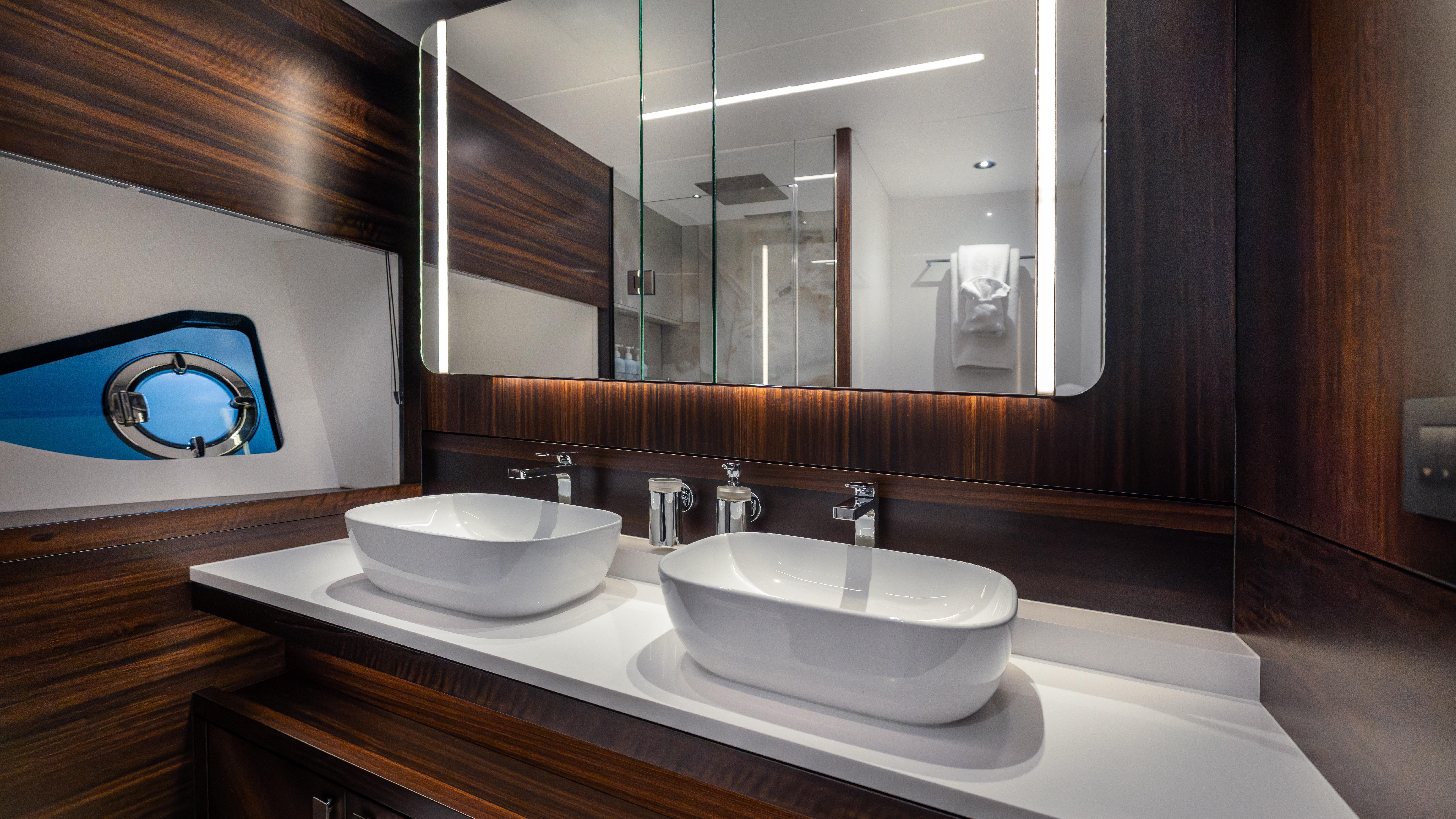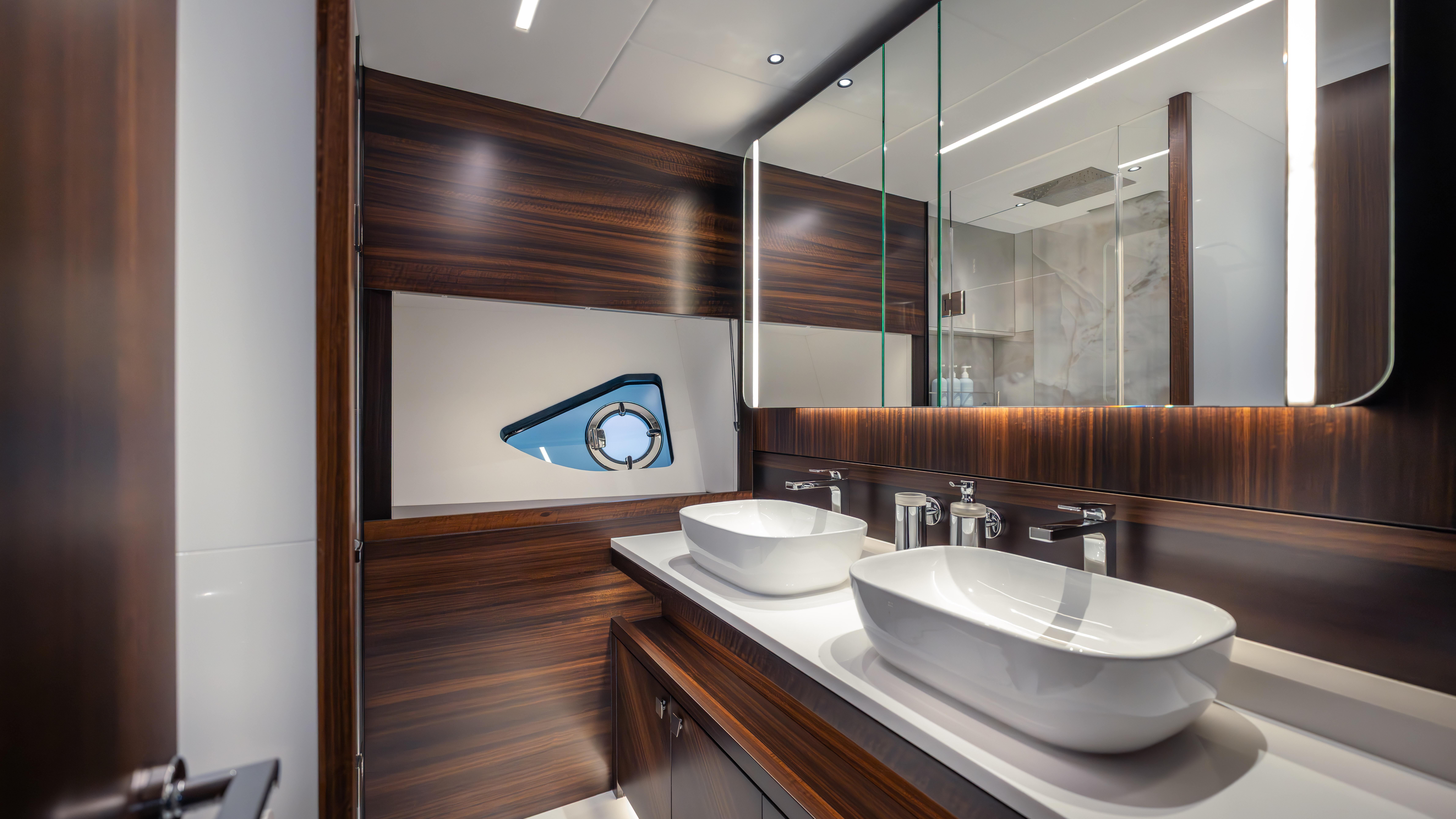 Main deck day head in lieu of standard cloakroom Wood flooring on the starboard side of the Master Stateroom in front of