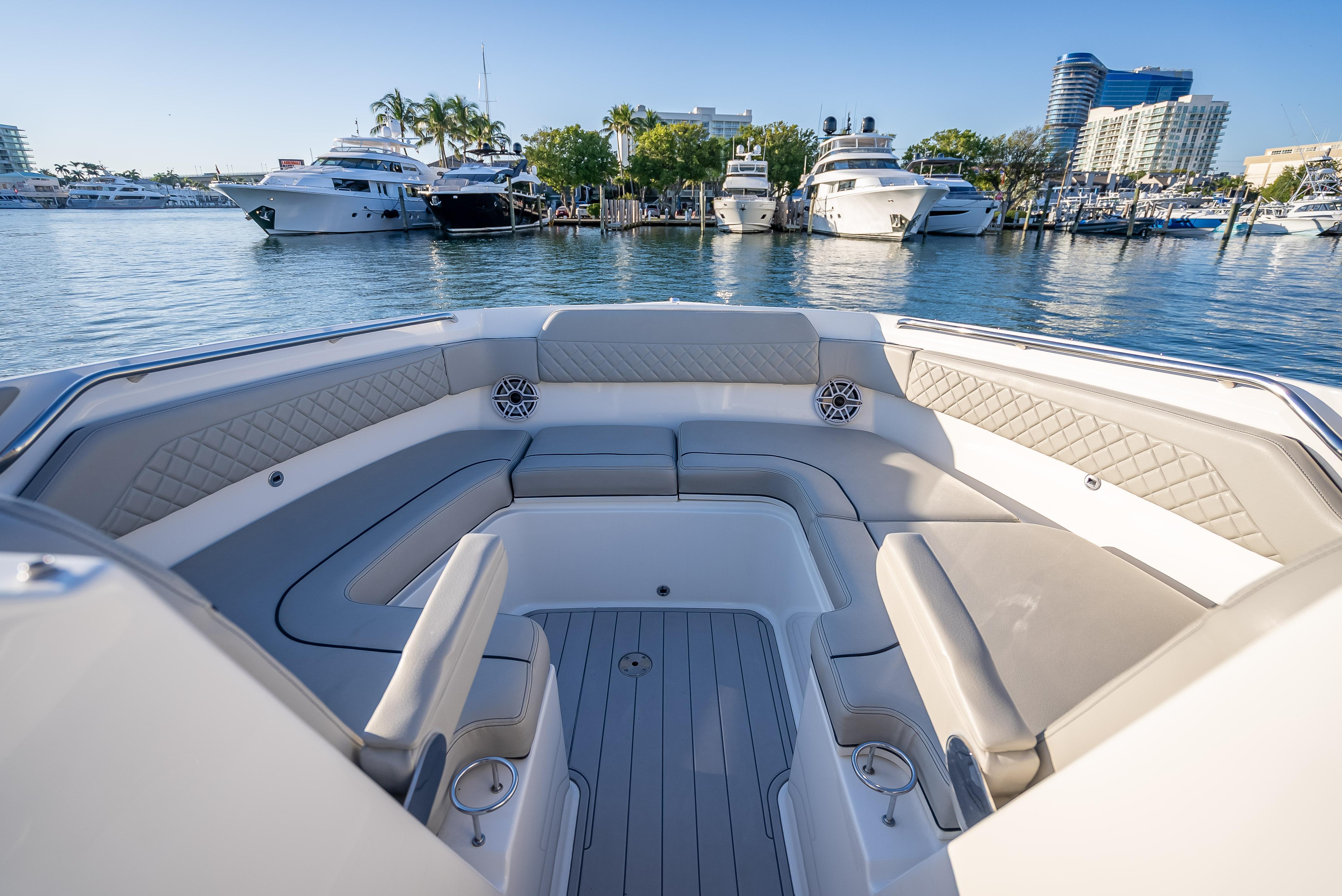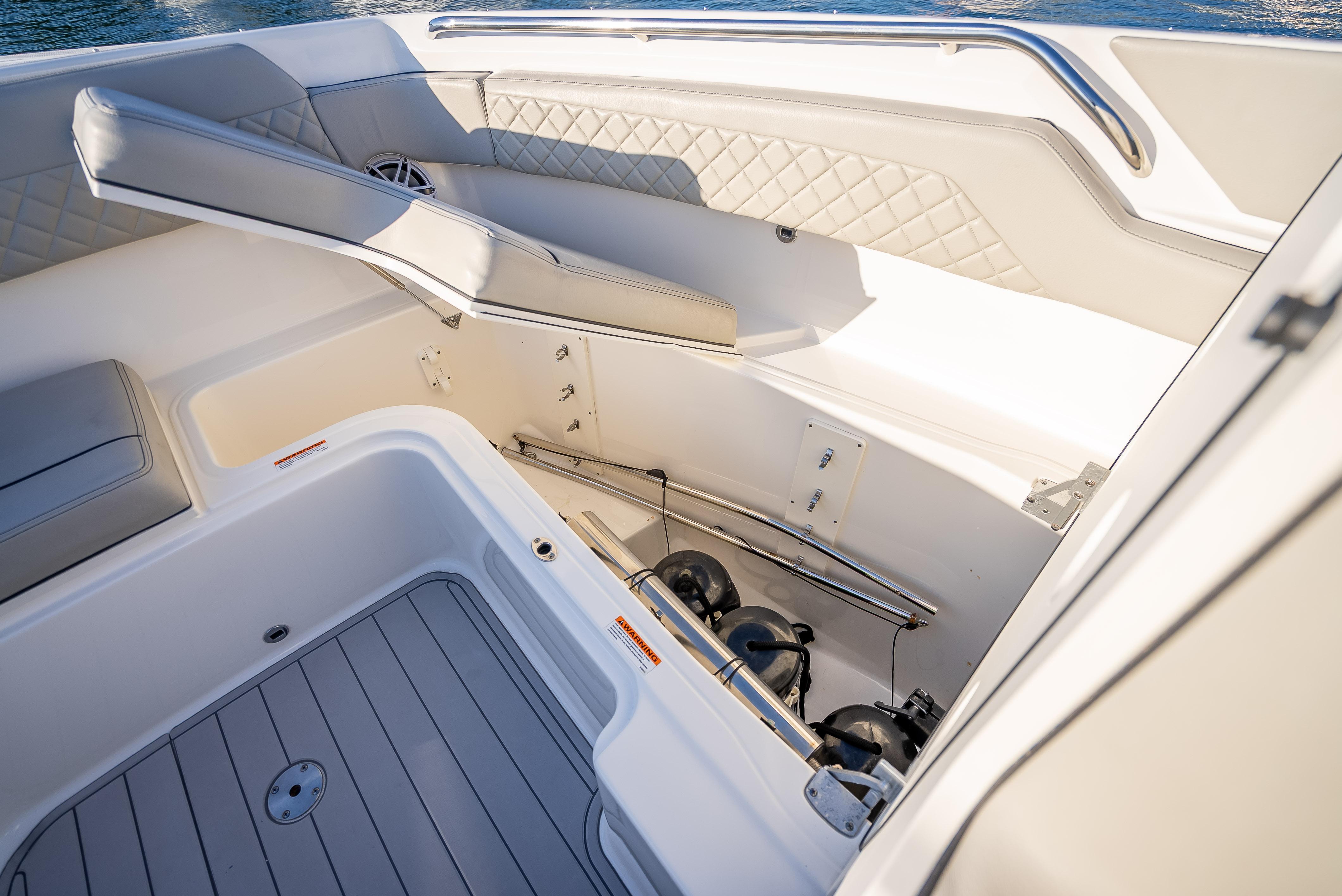 - Molded Stbd Forward Bow Seating with Flip-down Armrest, Lockable Dedicated Storage for Dive Tanks, Fenders, and Poles