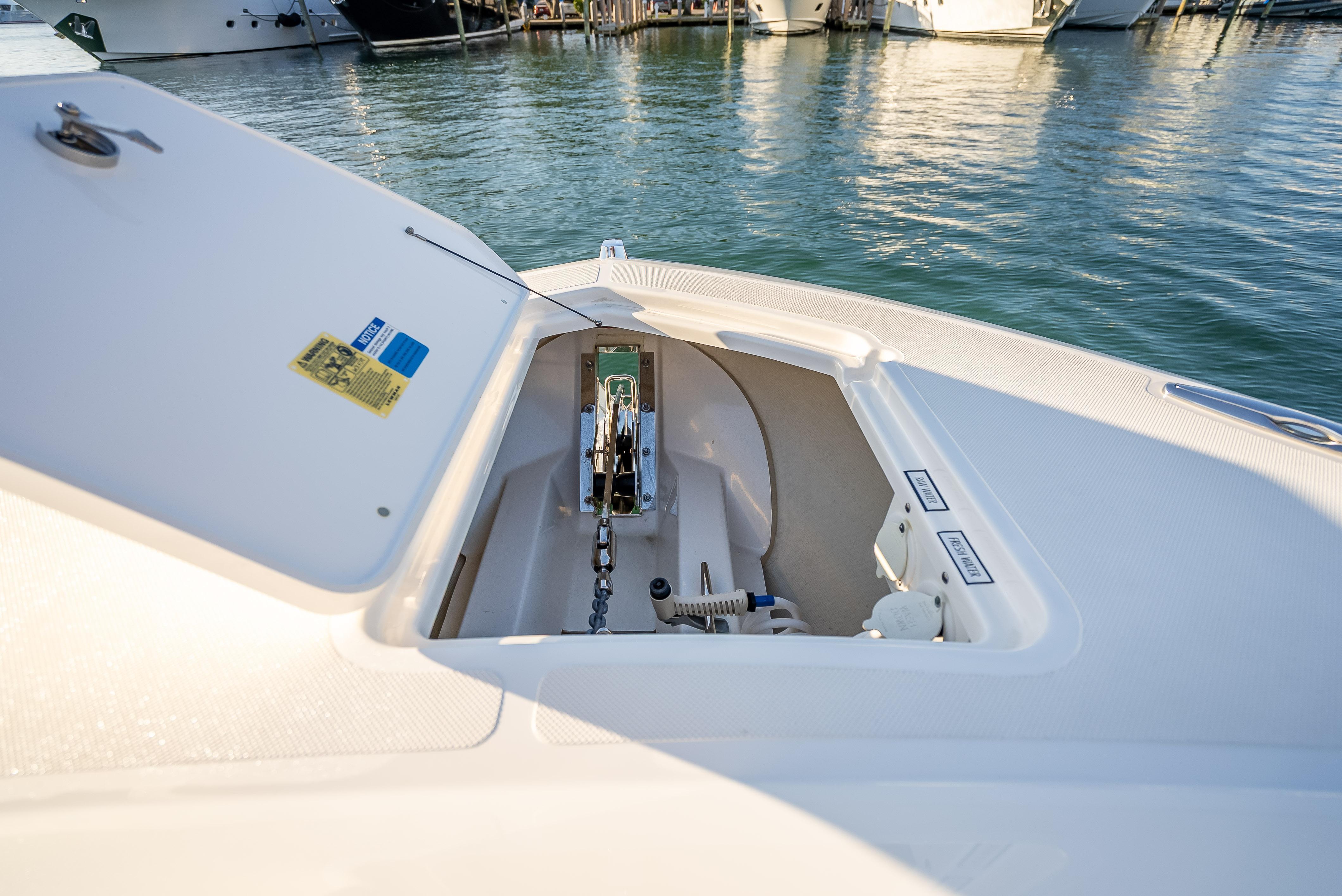 - Flush Mounted Integral Anchor Locker with Fiberglass Lid including: Horizontal Anchor Windlass with Switch at Helm and Remote Switch at Anchor Locker 316L Stainless Steel Through Stem Anchor Roller with 8" Mooring Cleat, Chain Binder 22lb 316L Stainless Steel Plow Style Anchor, Self-righting Shackle and 200' Rode (1/2" 8 Plait including 20' of ¼” G4 Chain)