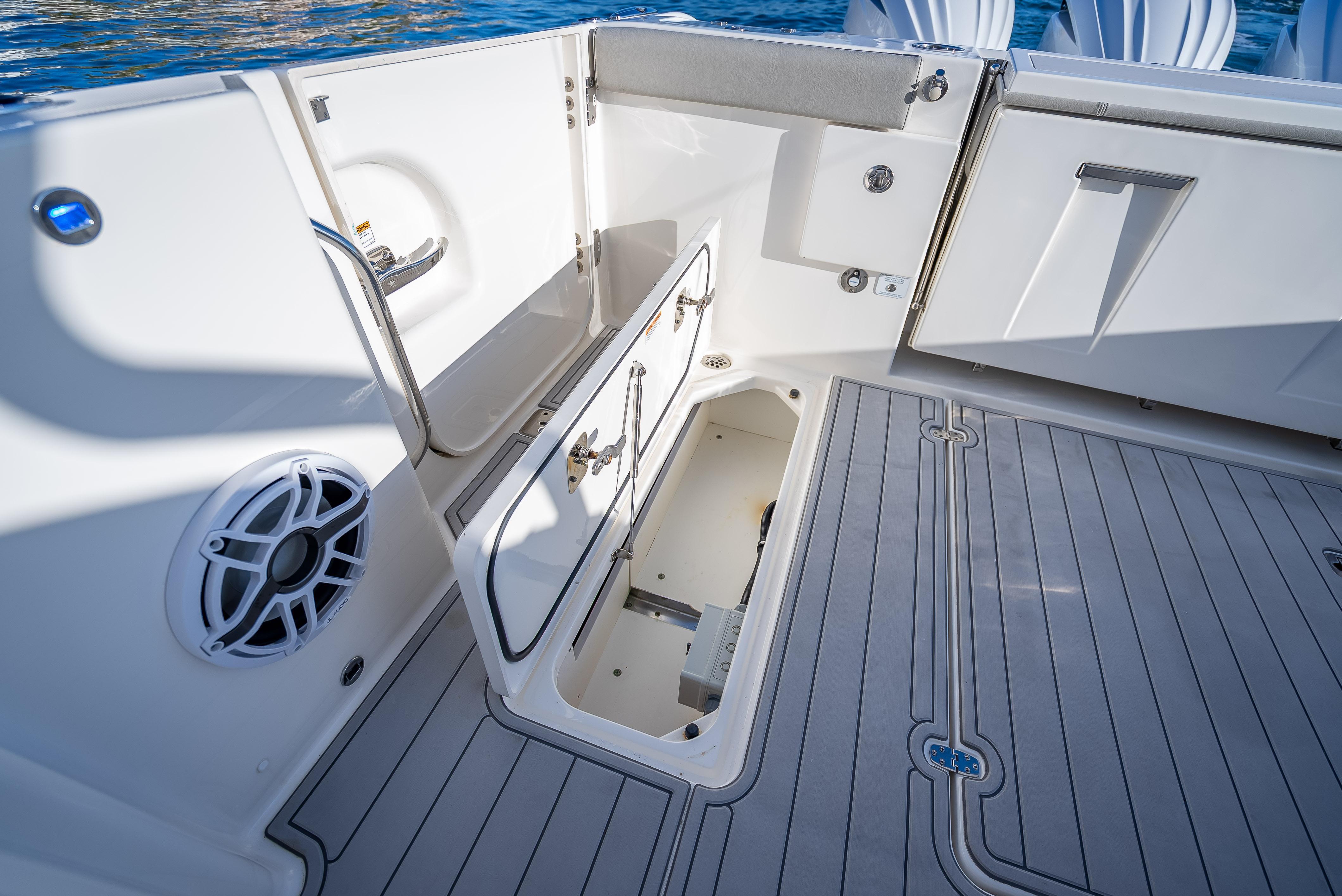 - Molded Transom Walkthrough with Hinged Transom Door, 316L Stainless Steel Latch and Magnetic Catch
