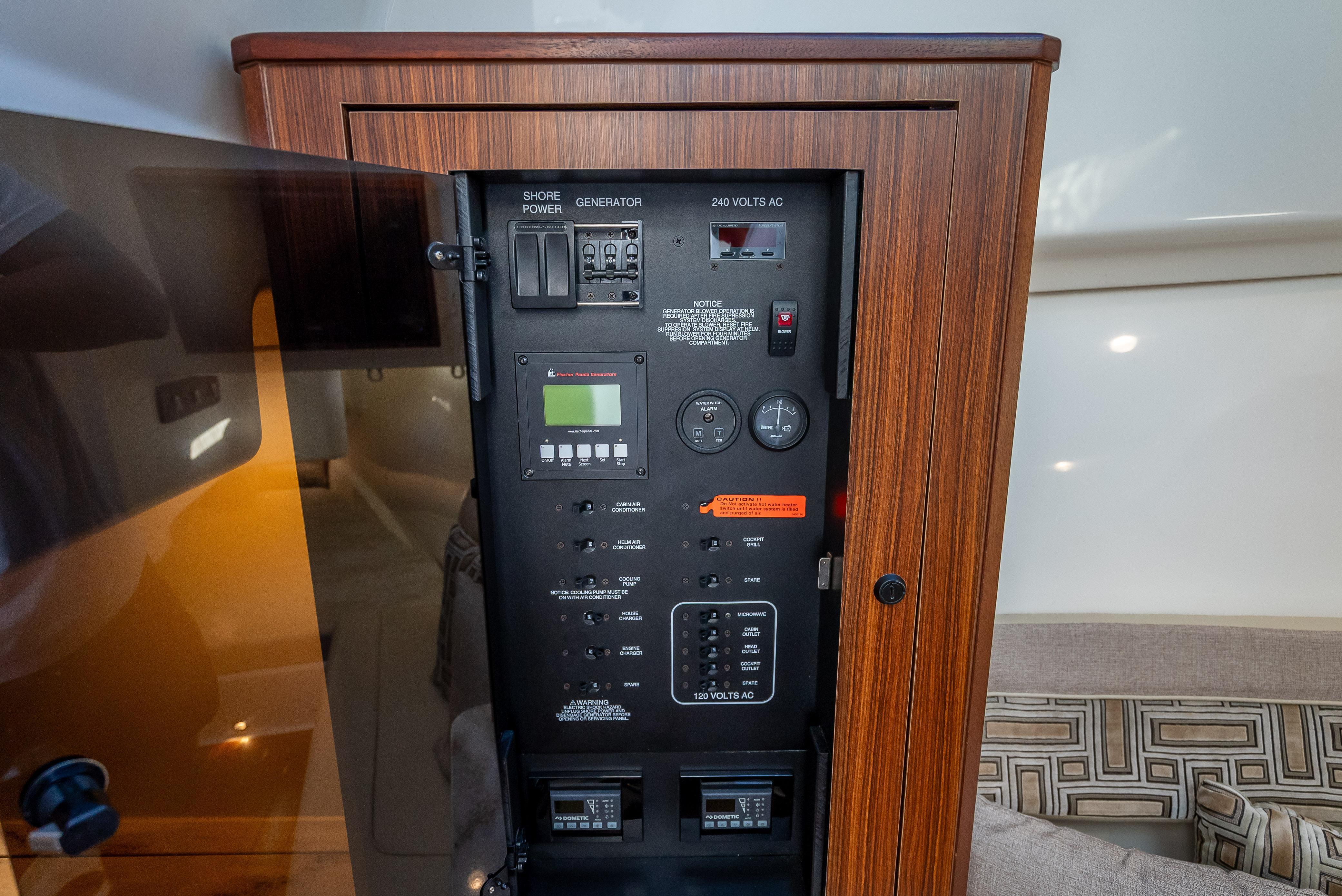 - Six Battery System with Service Slide: Port Engine (1), Center (1), Starboard Engine (1), Bow Thruster (1) (AGM), House (1) (AGM) and Electronics (1) (AGM)