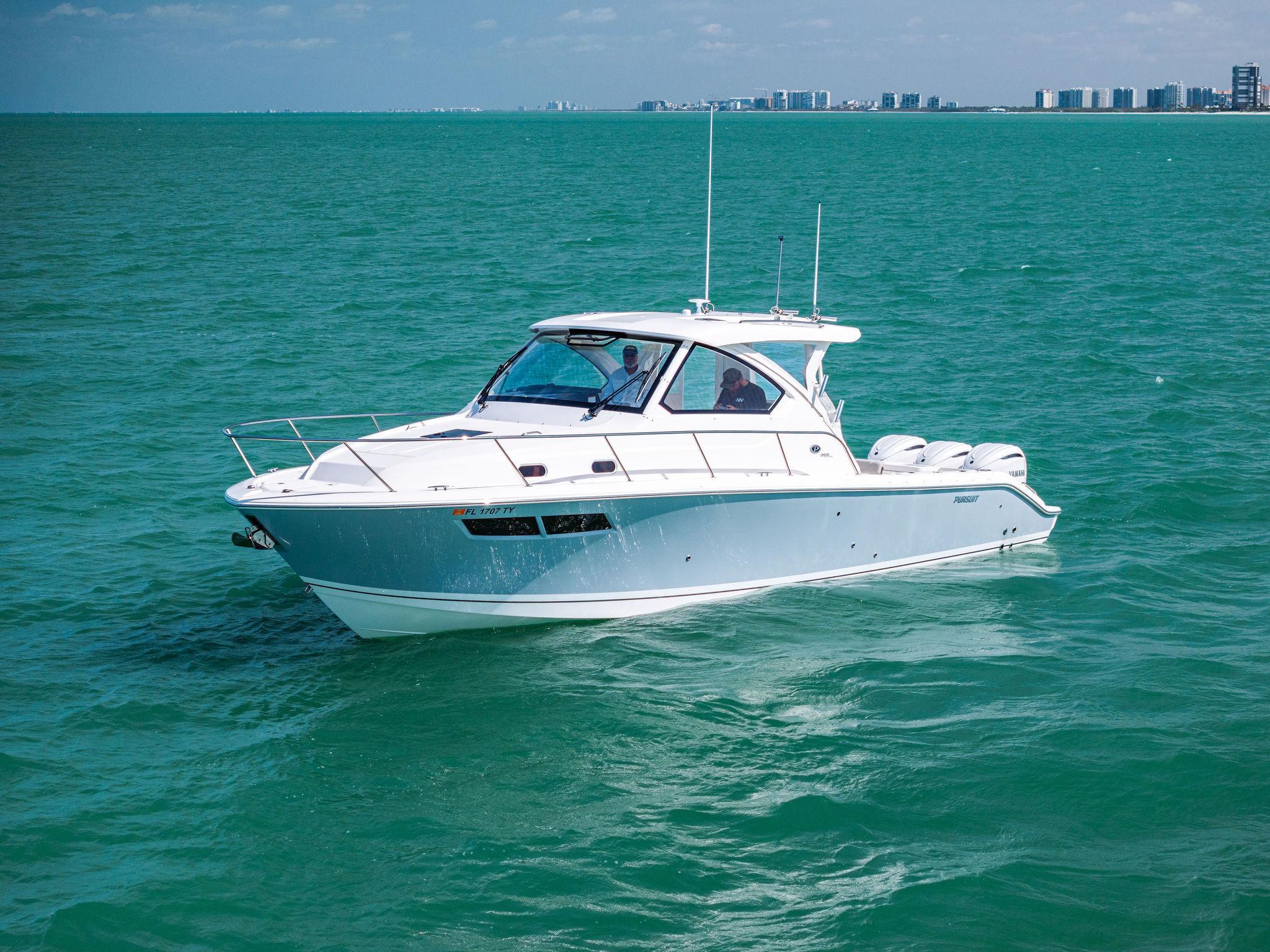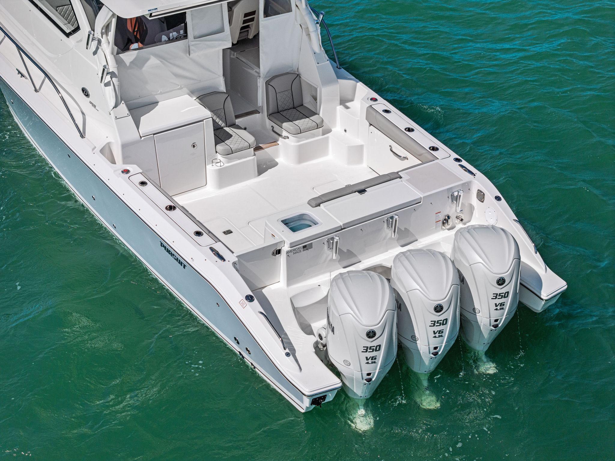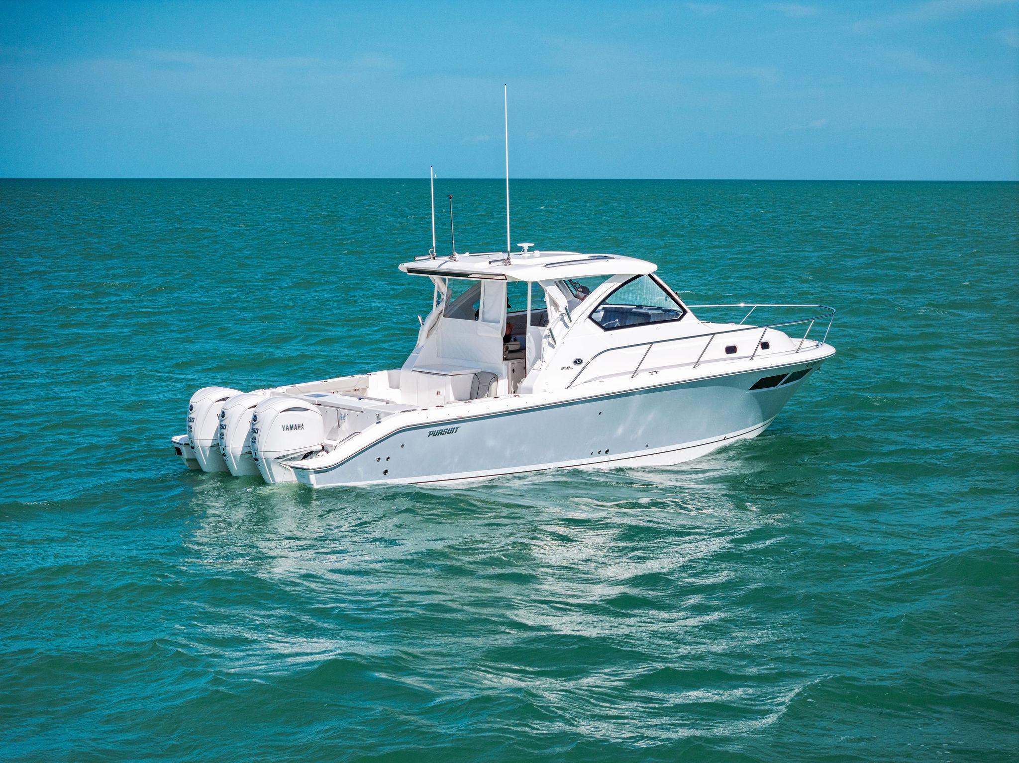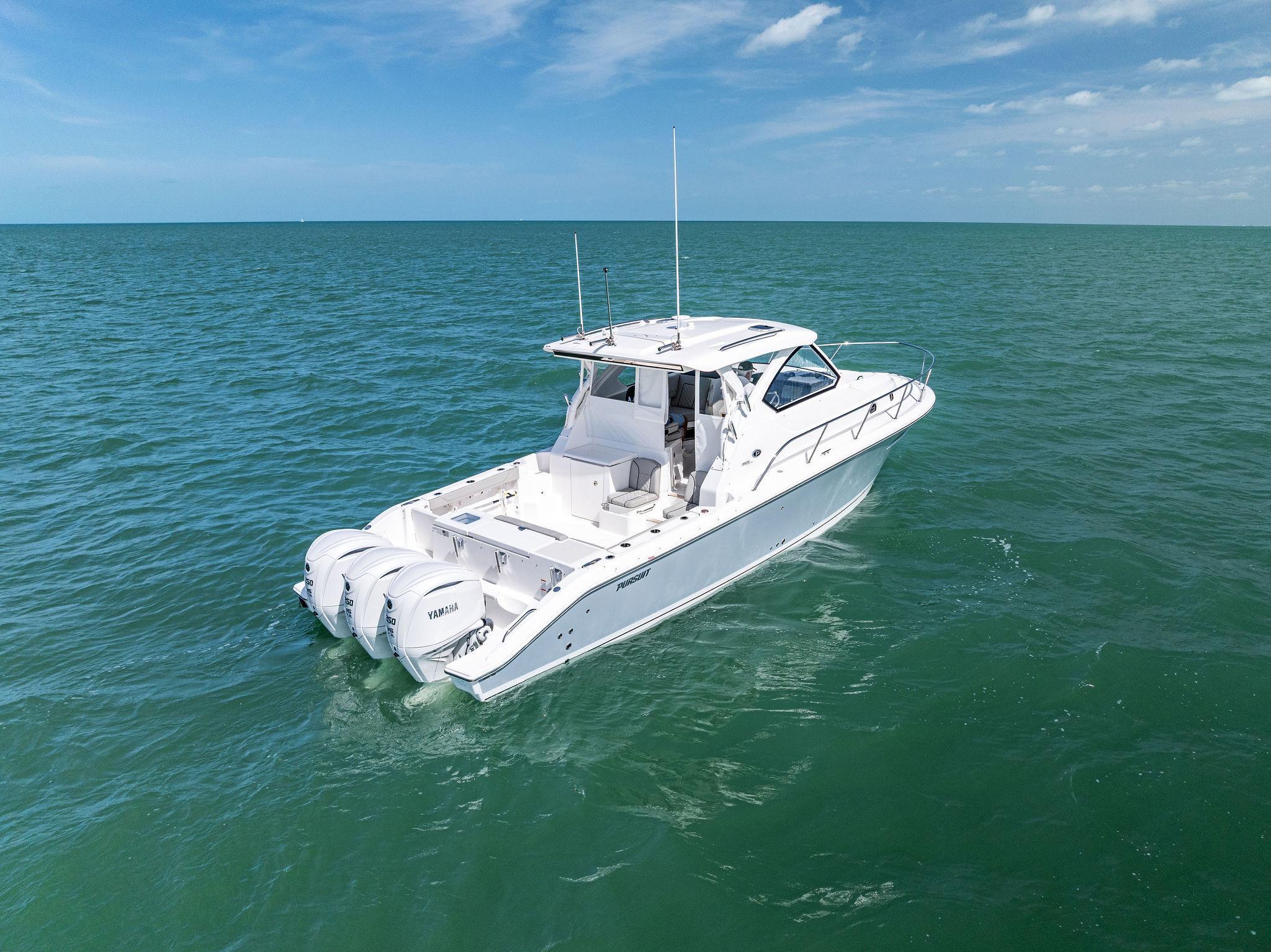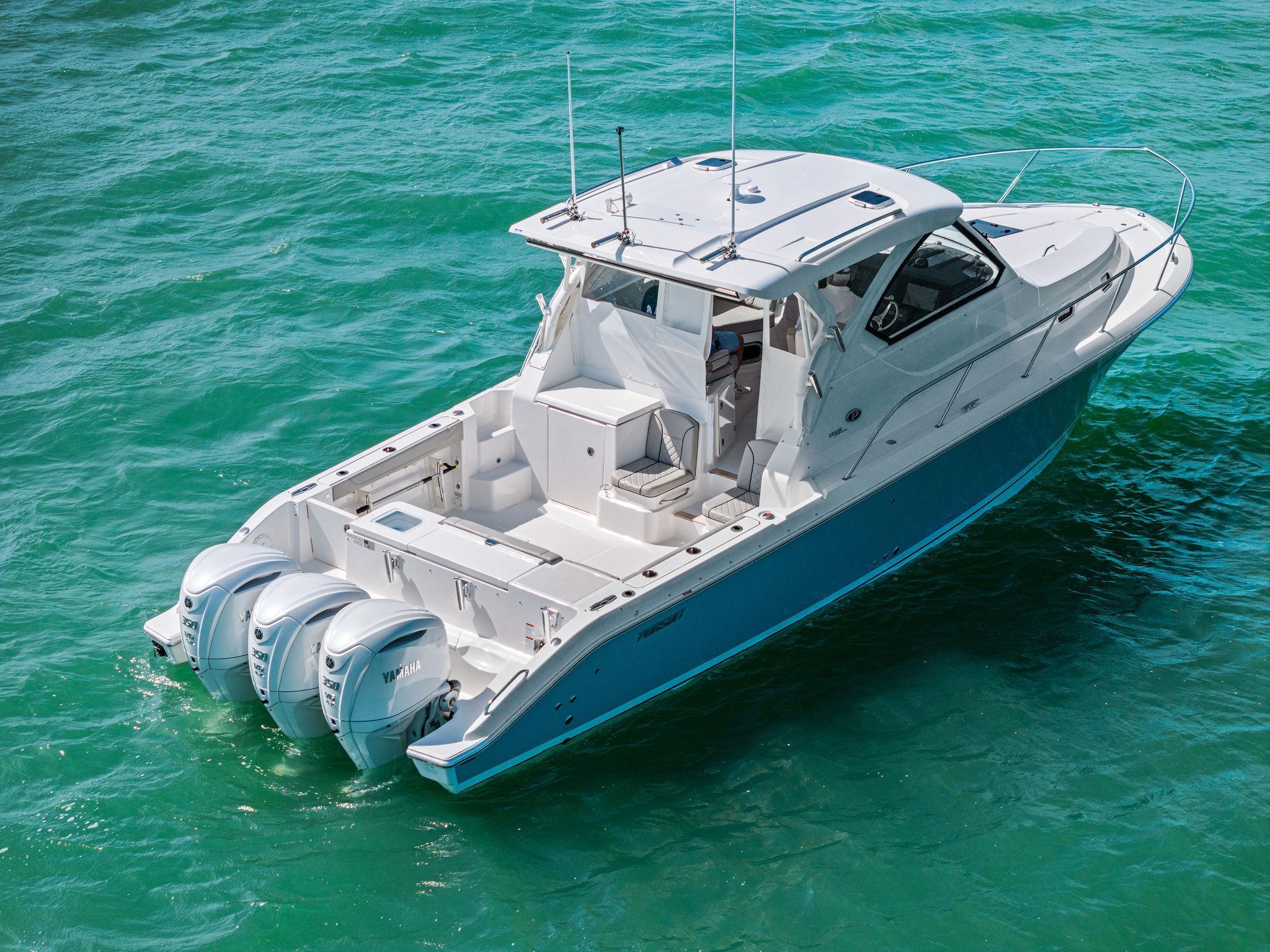 Manufacturer's DescriptionThe OS 355 encompasses the winning formula you’ve come to expect from Pursuit. A single-piece optically clear windshield, exterior fabrics and finishes with exciting seating arrangements give you every reason to dive into a Pursuit Offshore. Standard triple Yamaha F300 engines give you the power you’ve been looking for. The increased natural light through stylish hull-side windows, stainless-steel refrigerator and electrically actuated convertible berth/dinette are a few of the cabin features elevating this model with yacht-caliber appointments.