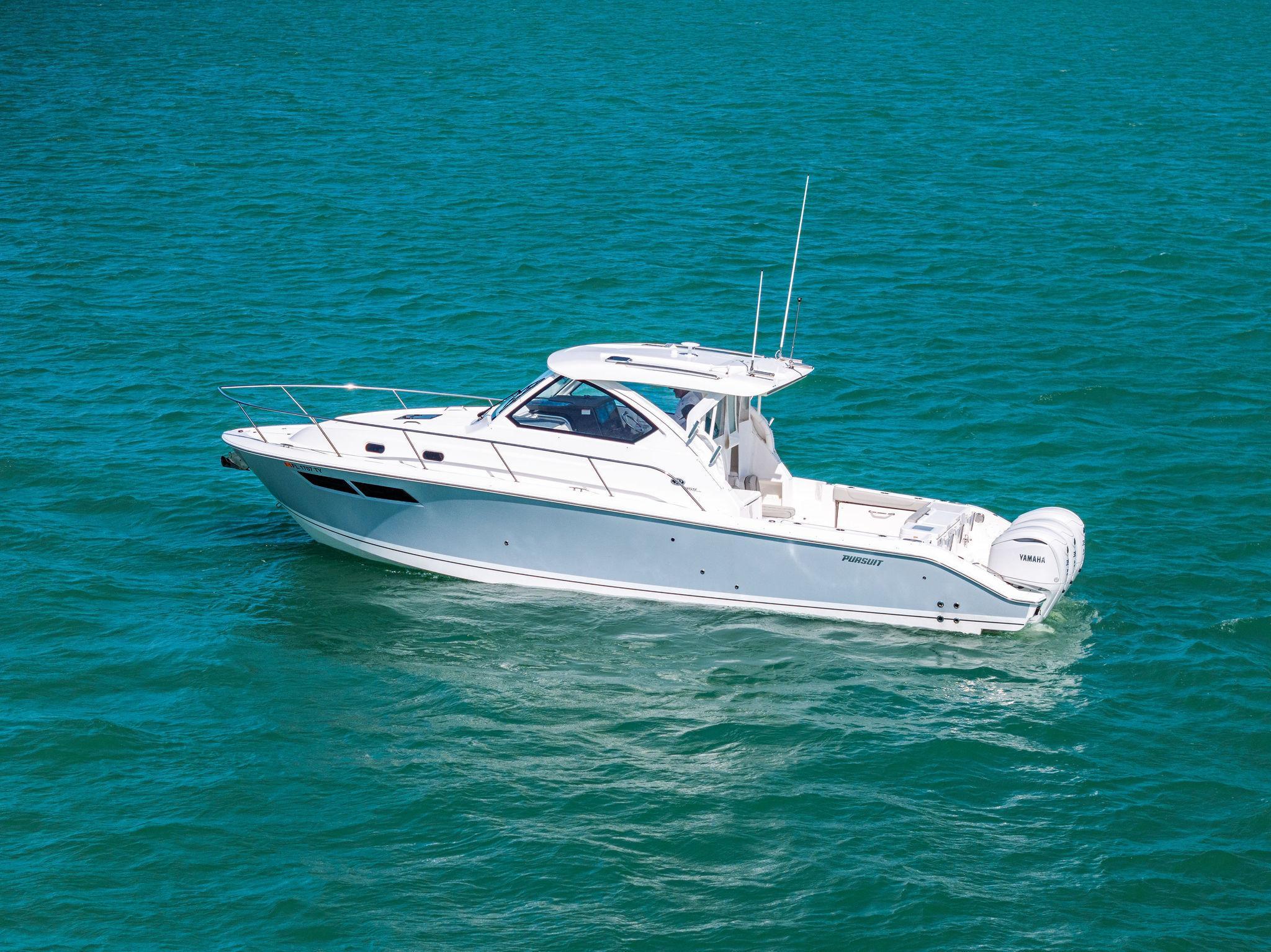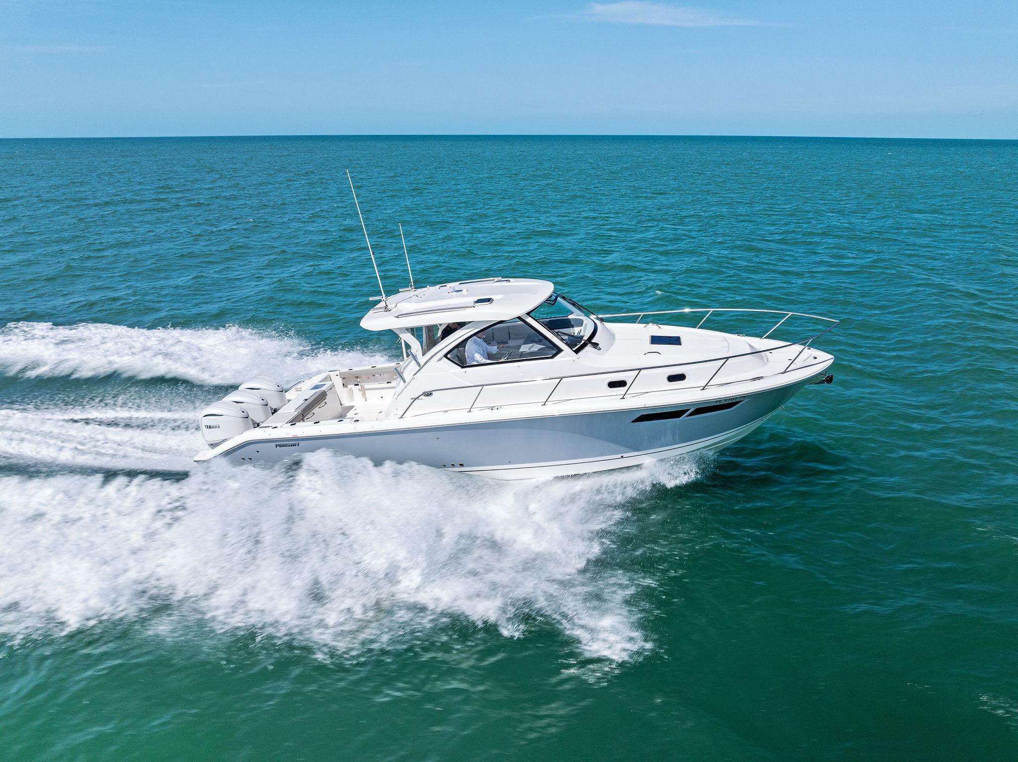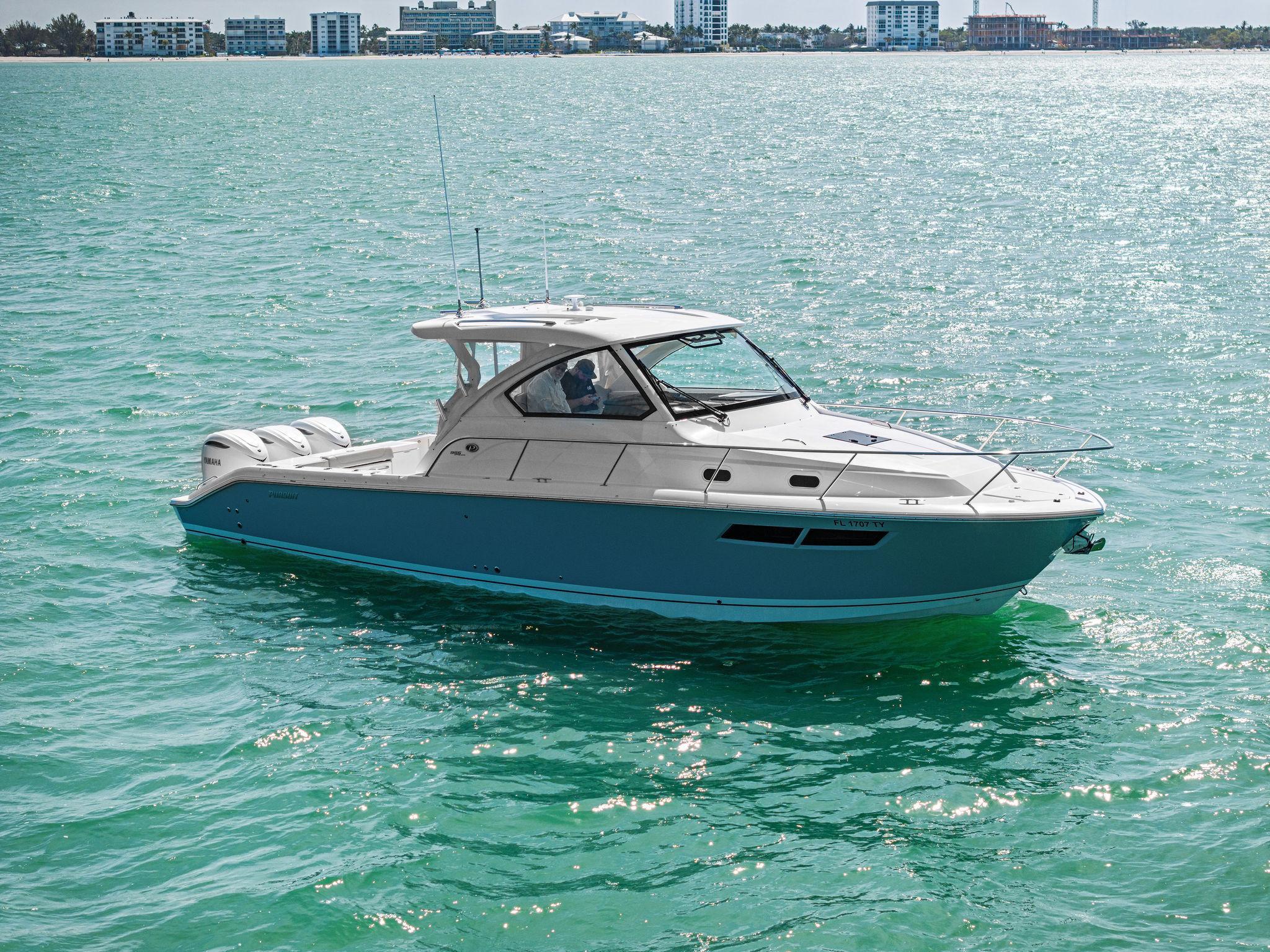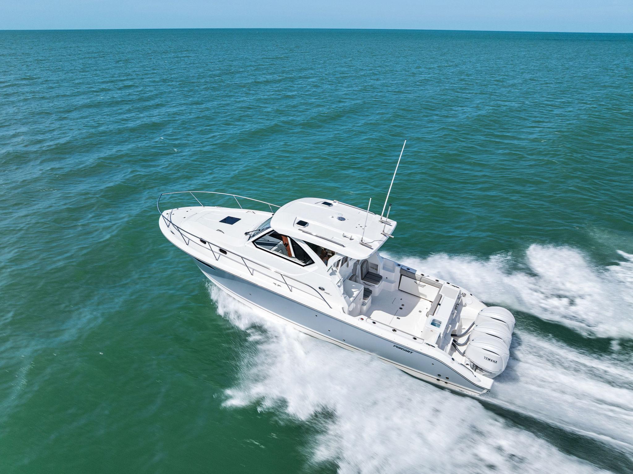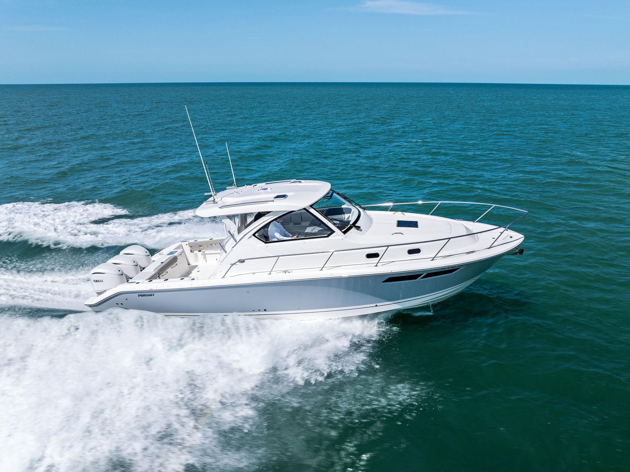 Manufacturer's DescriptionThe OS 355 encompasses the winning formula you’ve come to expect from Pursuit. A single-piece optically clear windshield, exterior fabrics and finishes with exciting seating arrangements give you every reason to dive into a Pursuit Offshore. Standard triple Yamaha F300 engines give you the power you’ve been looking for. The increased natural light through stylish hull-side windows, stainless-steel refrigerator and electrically actuated convertible berth/dinette are a few of the cabin features elevating this model with yacht-caliber appointments.