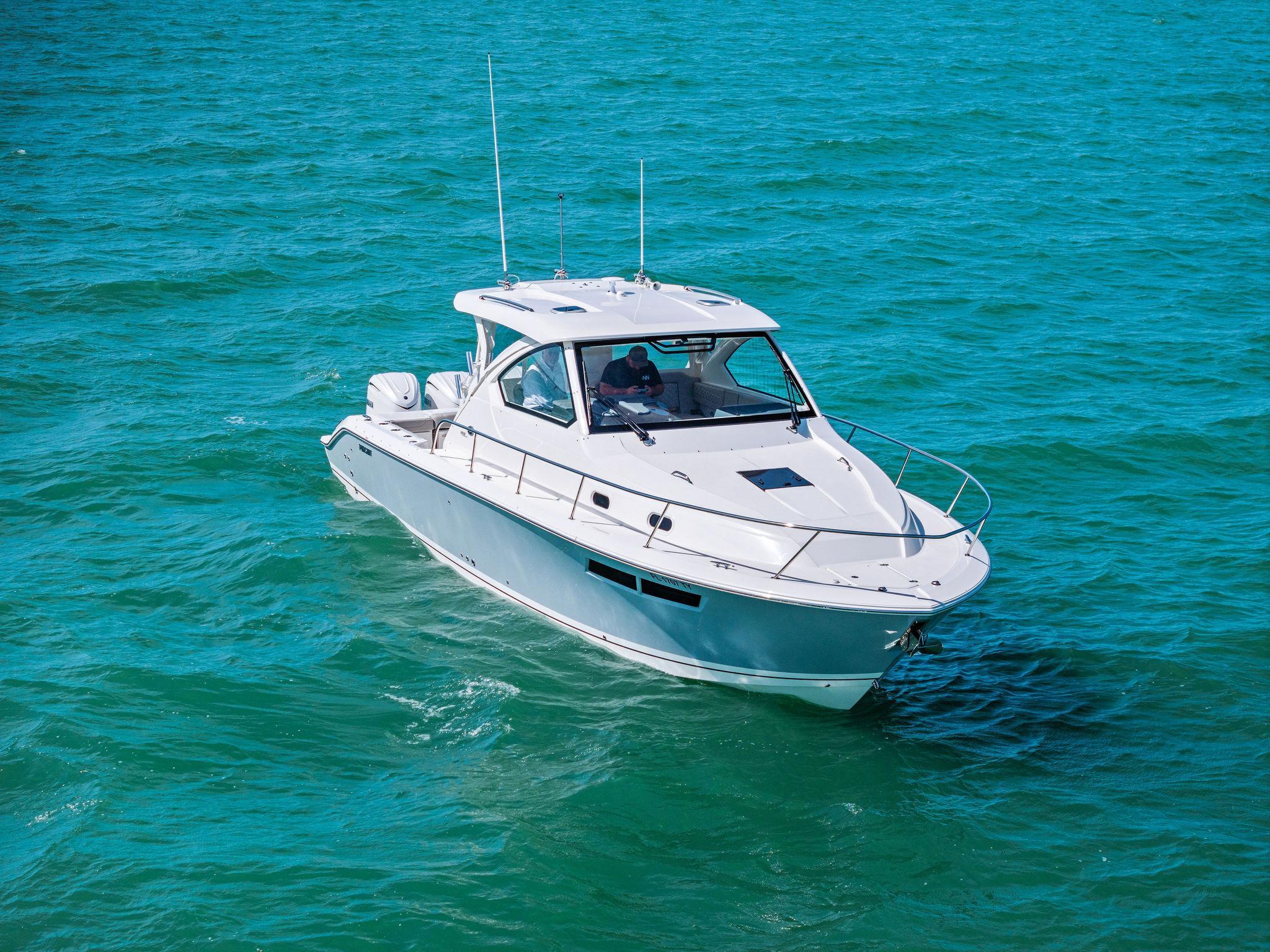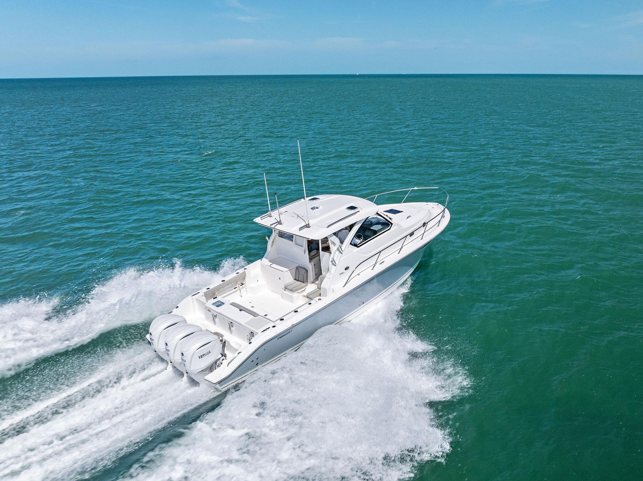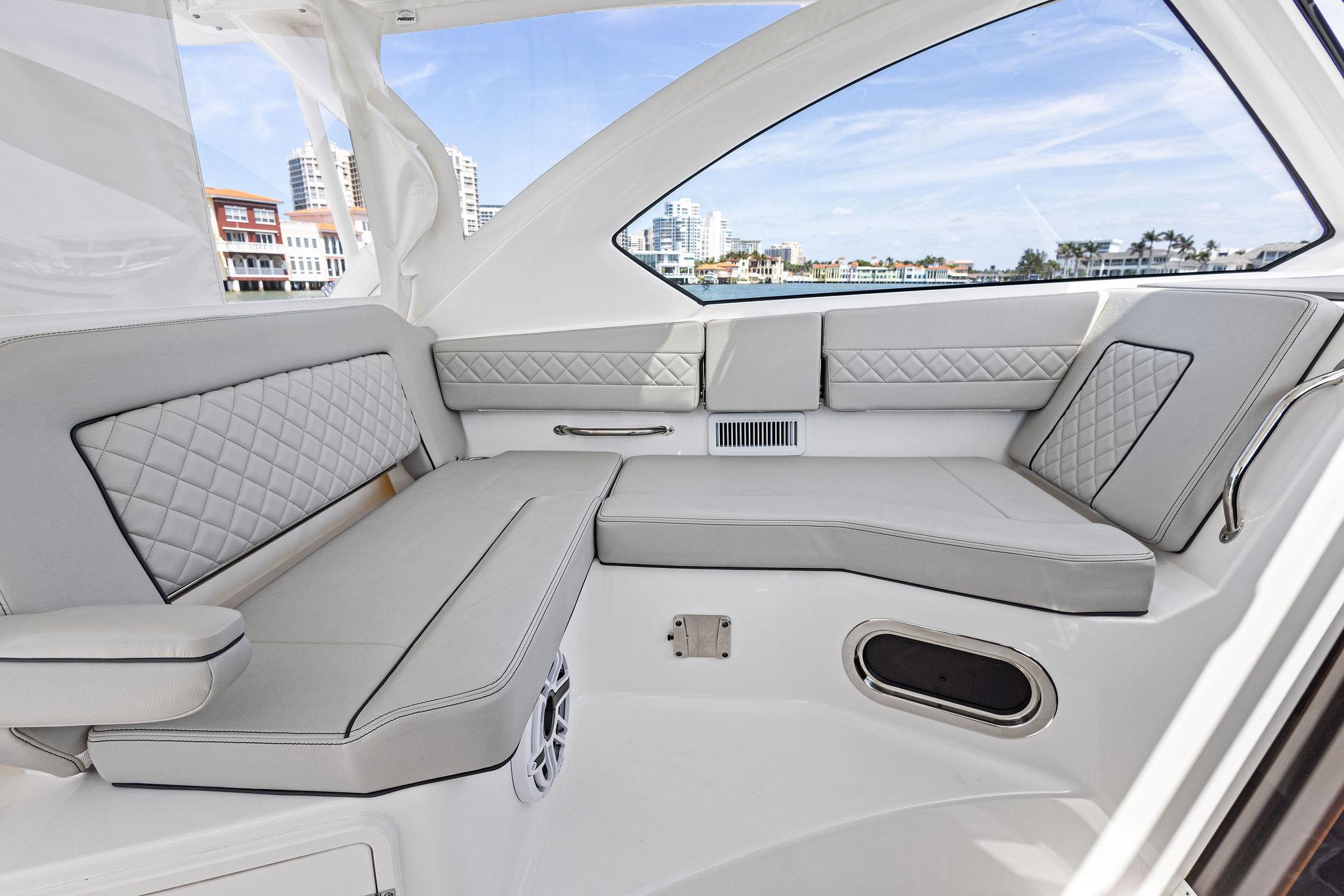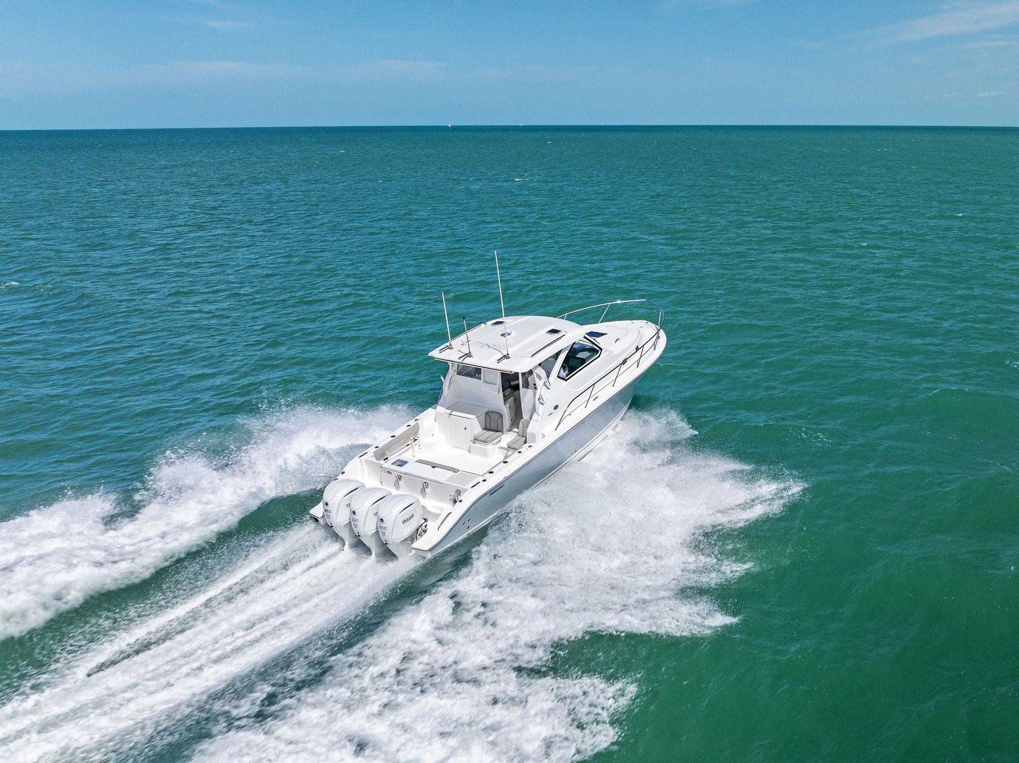 Manufacturer's DescriptionThe OS 355 encompasses the winning formula you’ve come to expect from Pursuit. A single-piece optically clear windshield, exterior fabrics and finishes with exciting seating arrangements give you every reason to dive into a Pursuit Offshore. Standard triple Yamaha F300 engines give you the power you’ve been looking for. The increased natural light through stylish hull-side windows, stainless-steel refrigerator and electrically actuated convertible berth/dinette are a few of the cabin features elevating this model with yacht-caliber appointments.