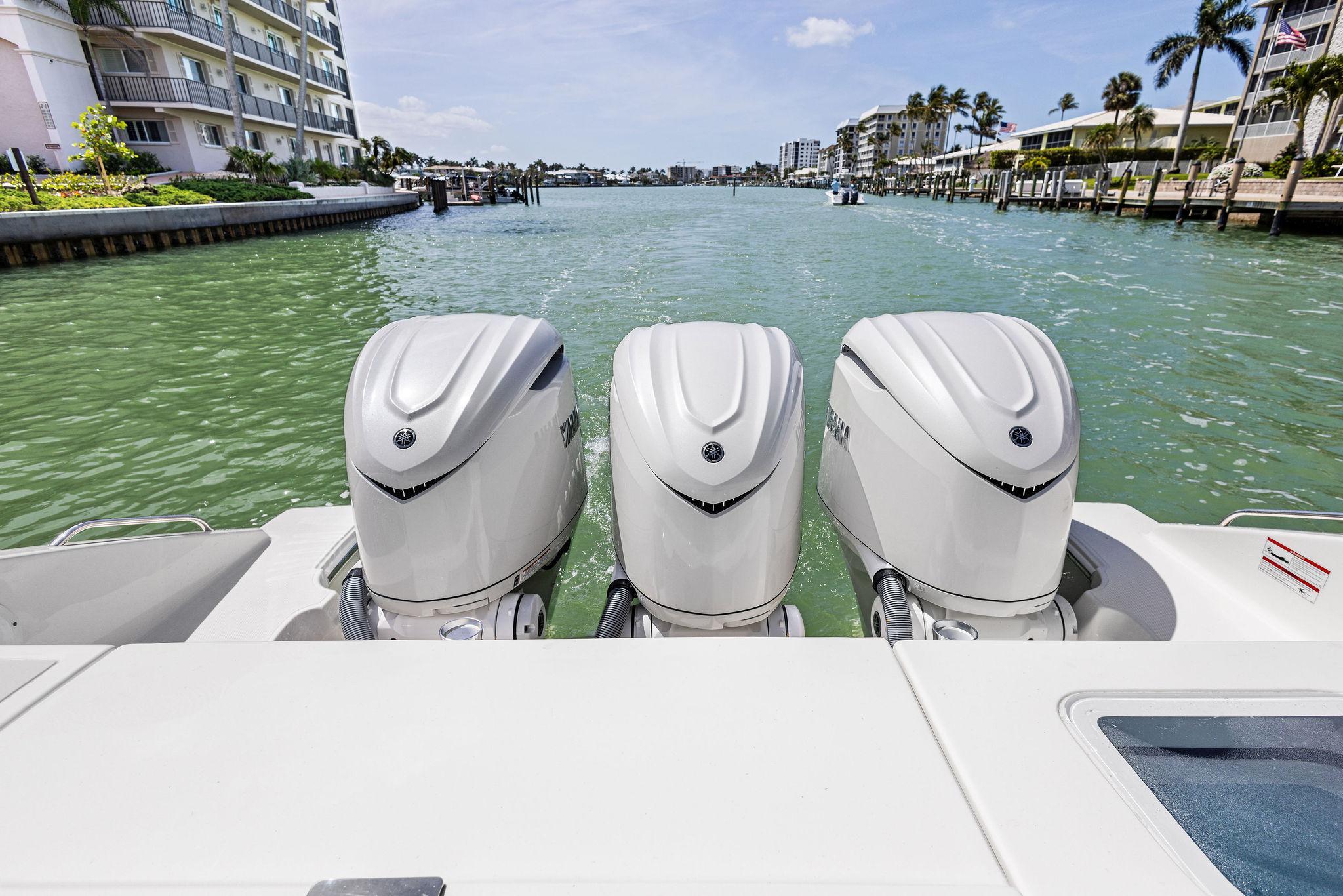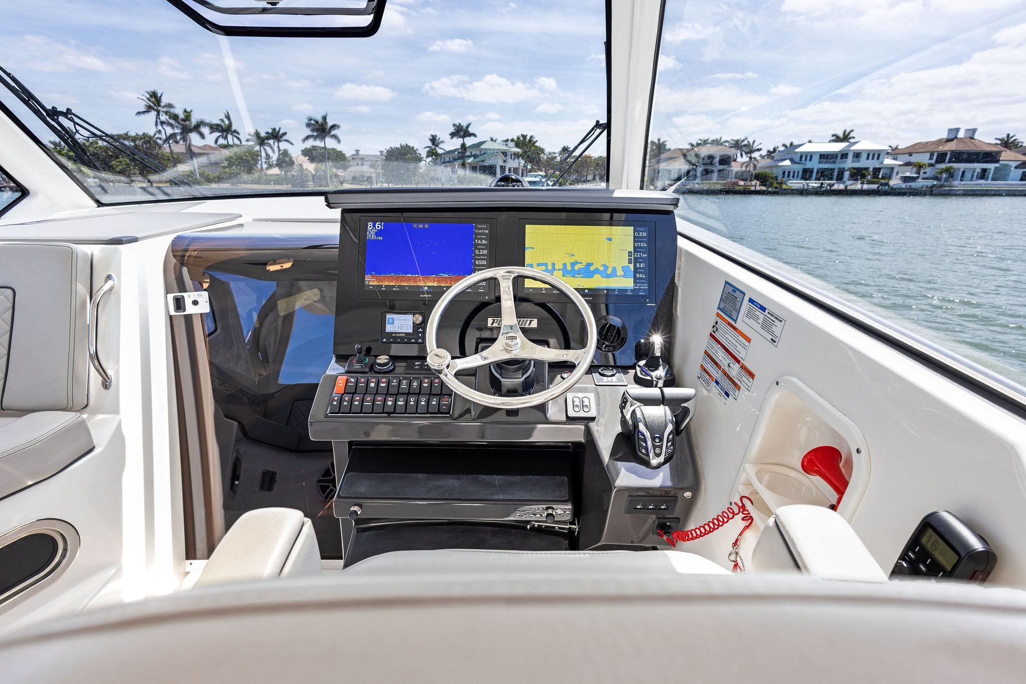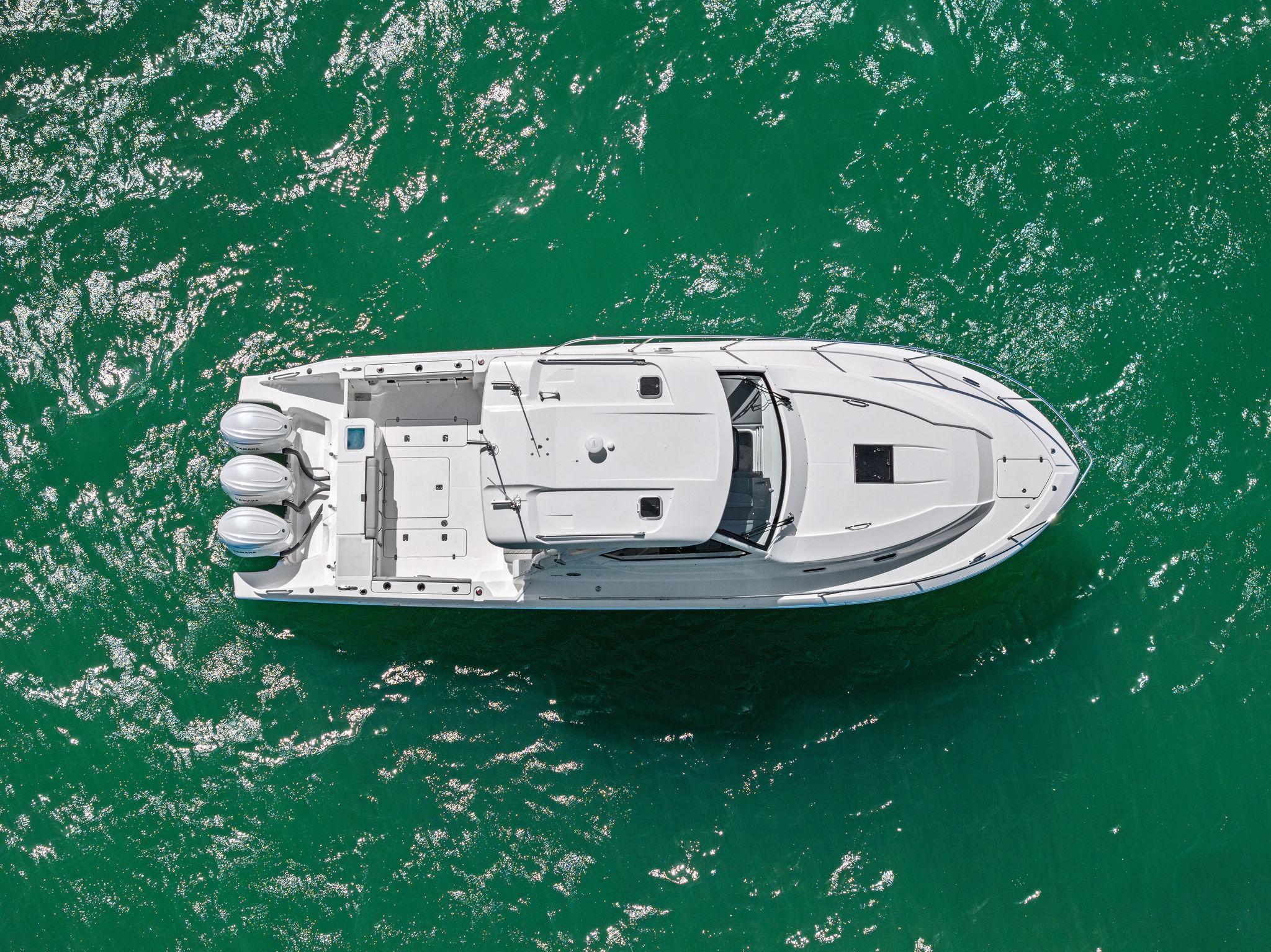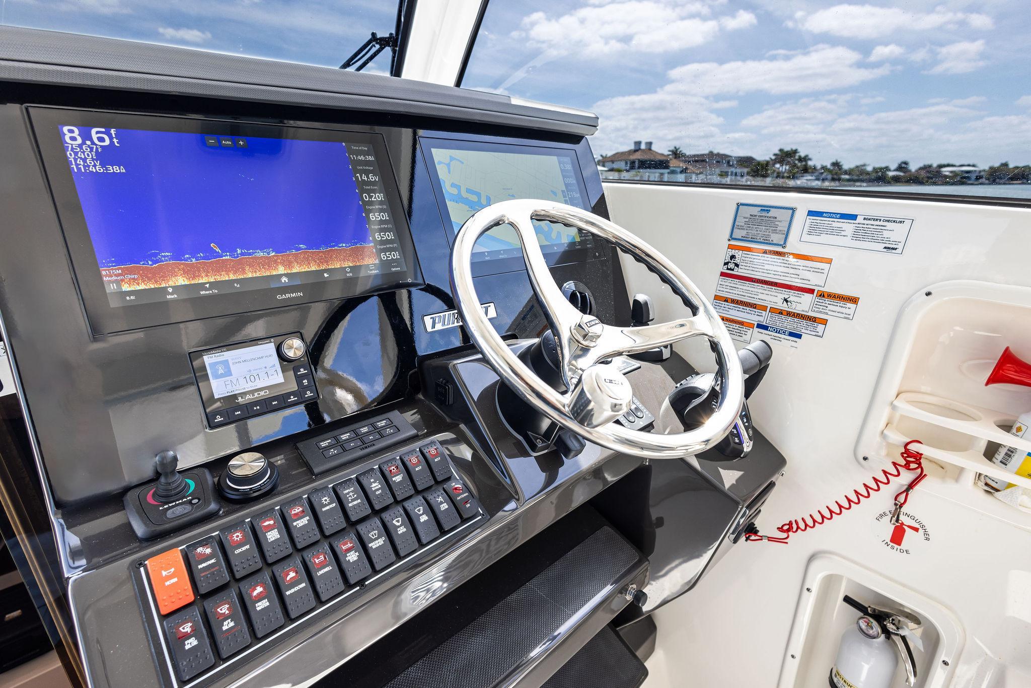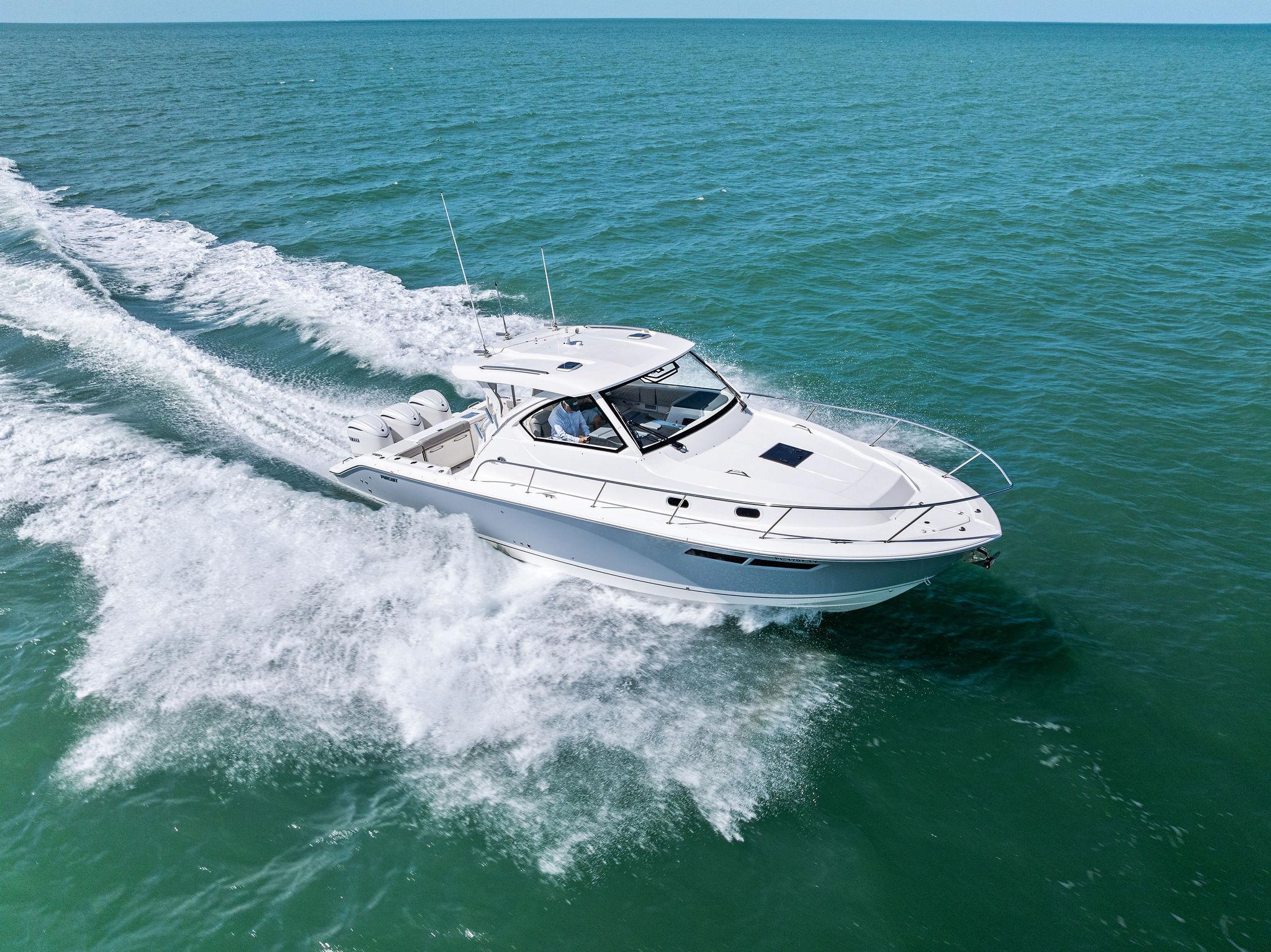 Manufacturer's DescriptionThe OS 355 encompasses the winning formula you’ve come to expect from Pursuit. A single-piece optically clear windshield, exterior fabrics and finishes with exciting seating arrangements give you every reason to dive into a Pursuit Offshore. Standard triple Yamaha F300 engines give you the power you’ve been looking for. The increased natural light through stylish hull-side windows, stainless-steel refrigerator and electrically actuated convertible berth/dinette are a few of the cabin features elevating this model with yacht-caliber appointments.