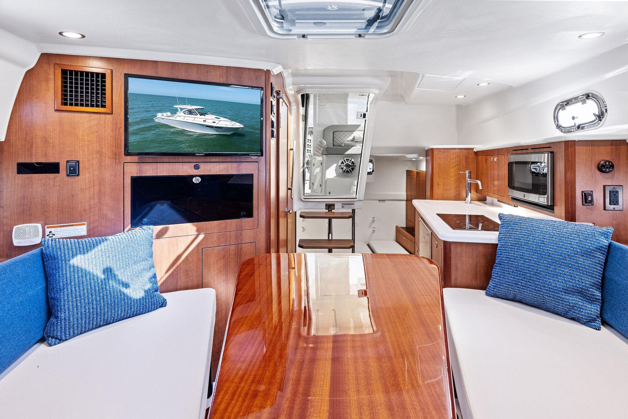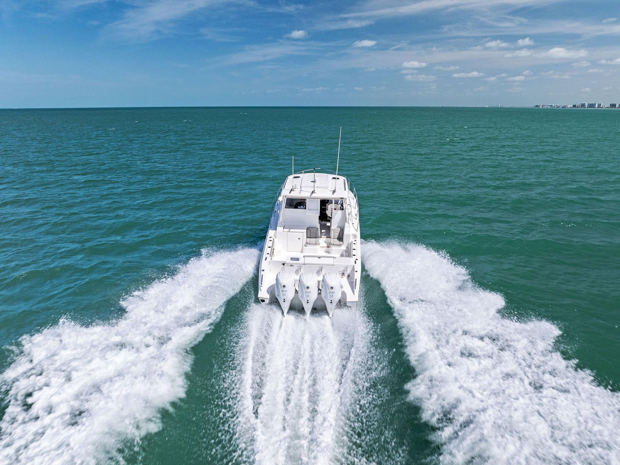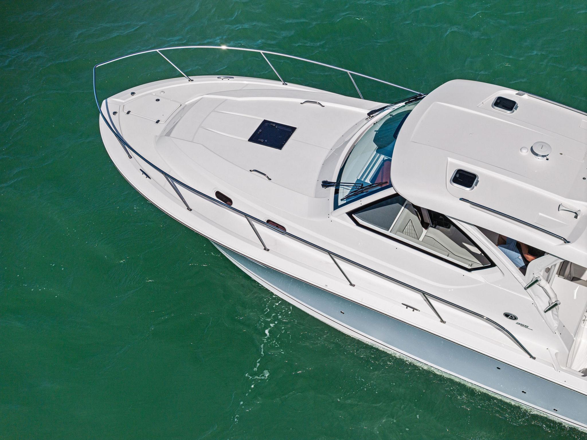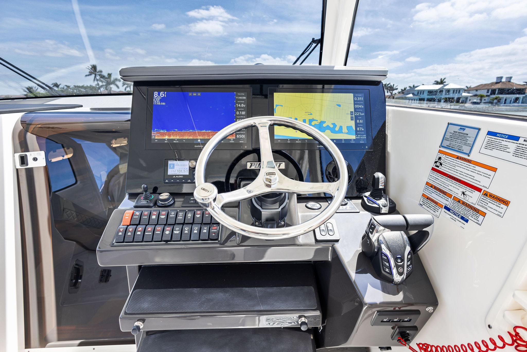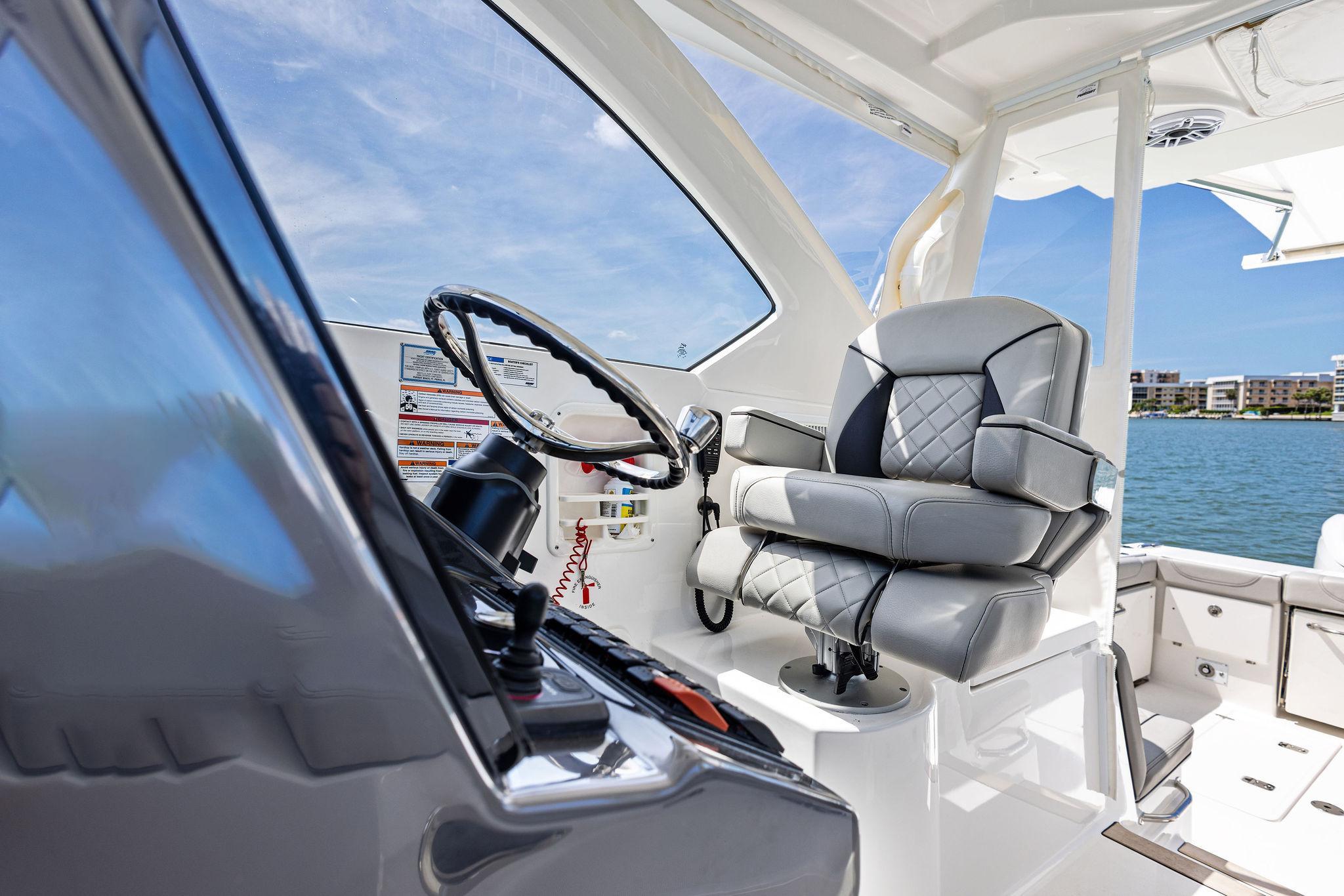 Manufacturer's DescriptionThe OS 355 encompasses the winning formula you’ve come to expect from Pursuit. A single-piece optically clear windshield, exterior fabrics and finishes with exciting seating arrangements give you every reason to dive into a Pursuit Offshore. Standard triple Yamaha F300 engines give you the power you’ve been looking for. The increased natural light through stylish hull-side windows, stainless-steel refrigerator and electrically actuated convertible berth/dinette are a few of the cabin features elevating this model with yacht-caliber appointments.