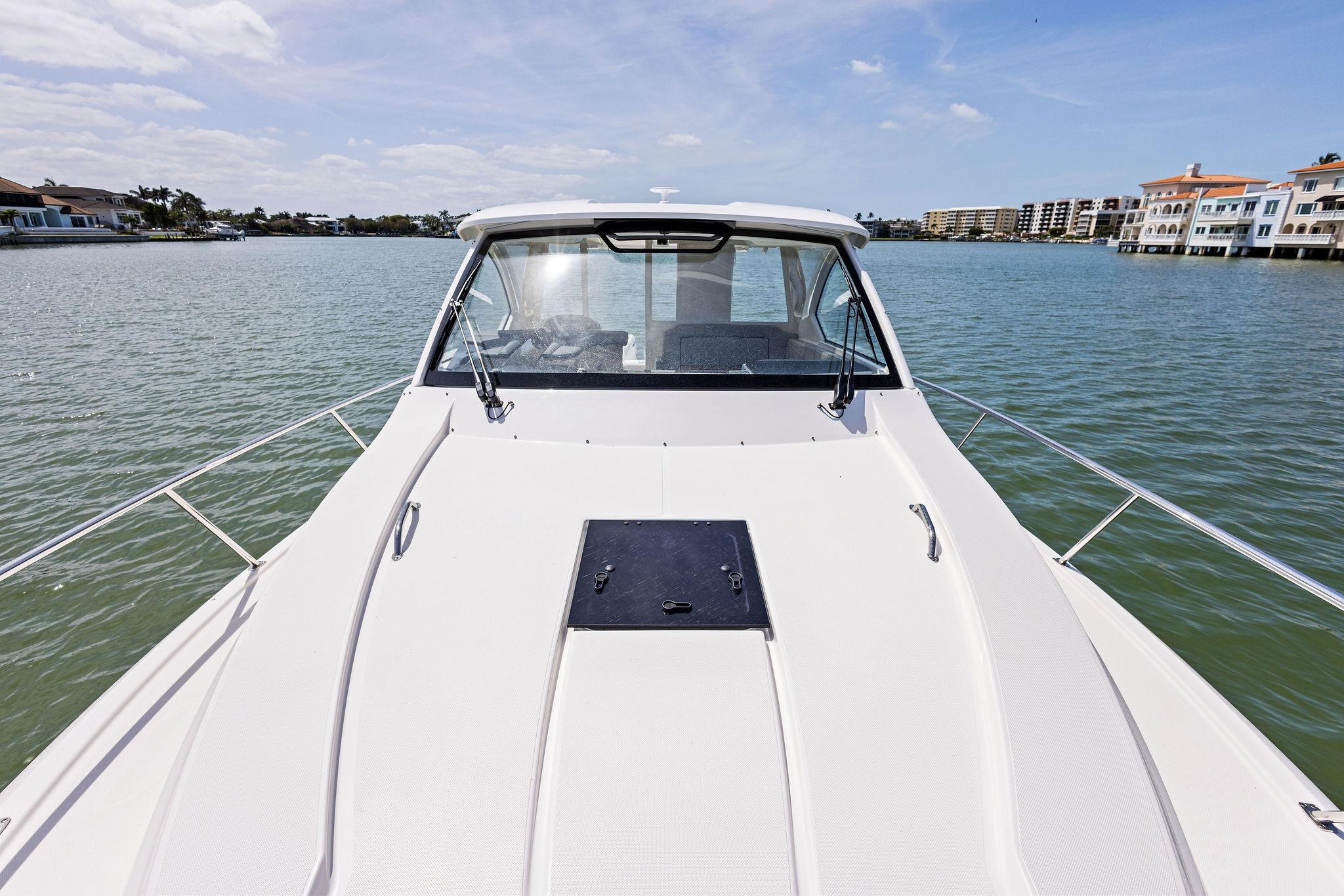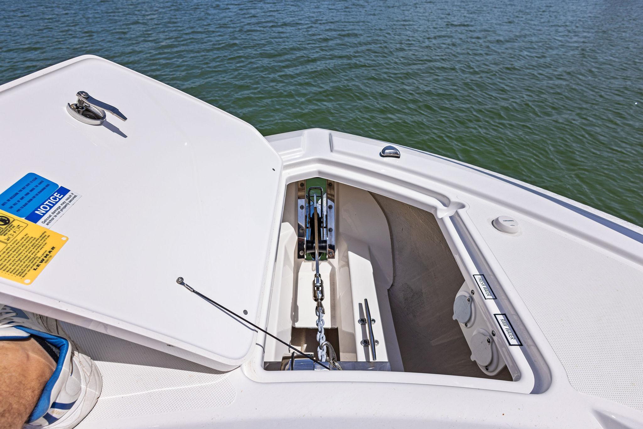 - Flush Mounted Integral Anchor Locker with Fiberglass Lid including: Horizontal Anchor Windlass with Switch at Helm and Remote at Anchor Locker