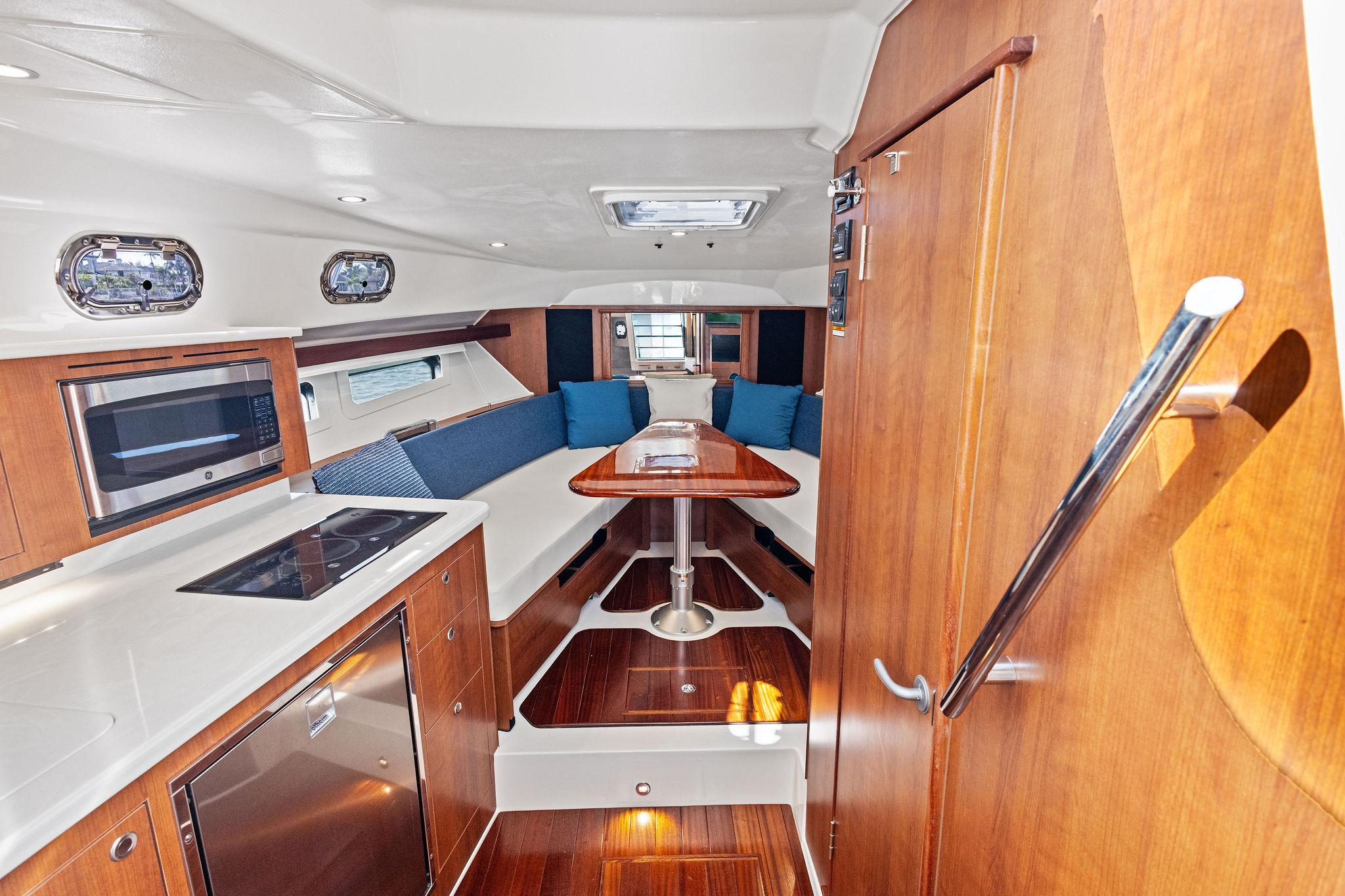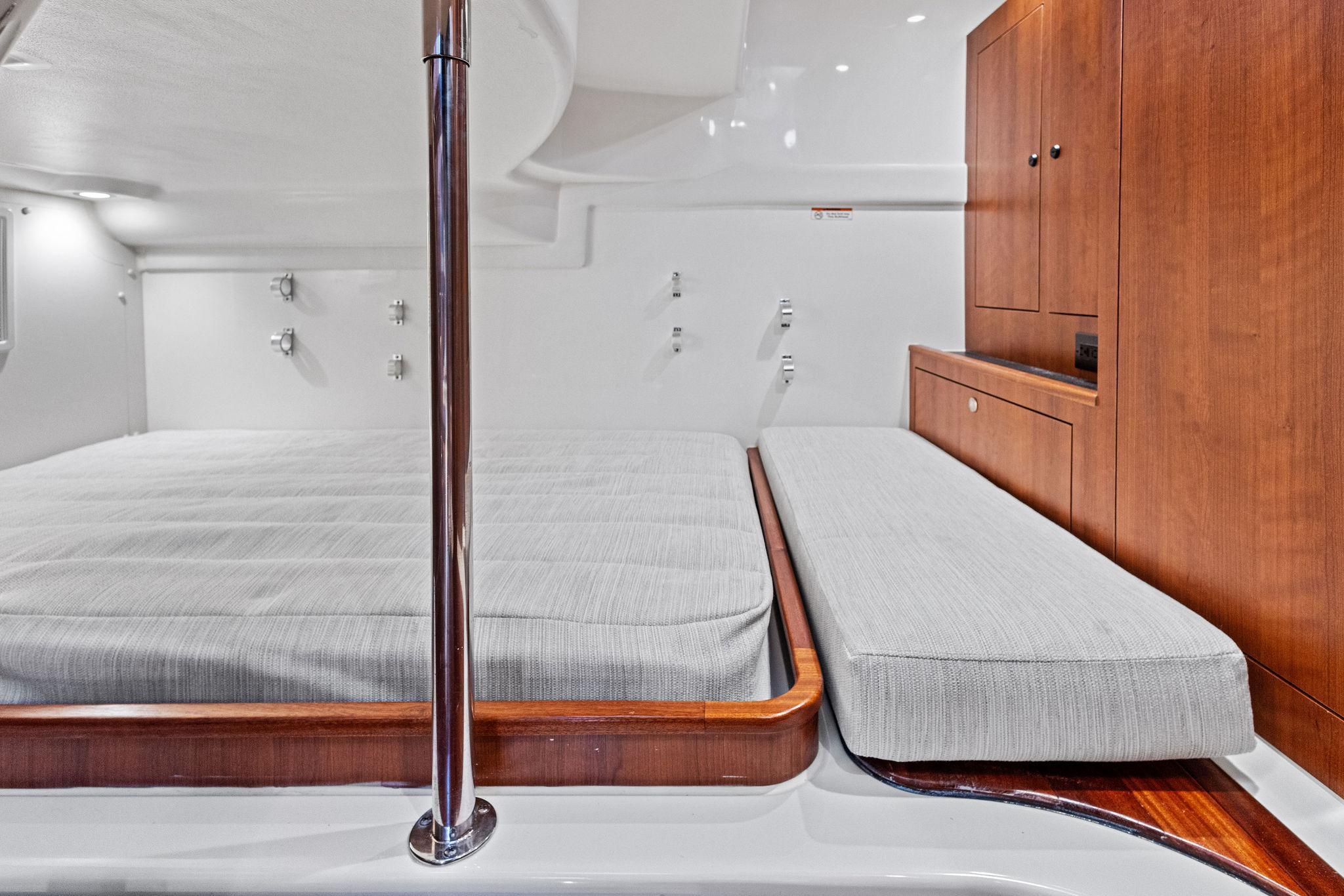 - Electrically Actuated Custom V-Berth Seating with Fixed Cushions that Converts into Queen size Berth