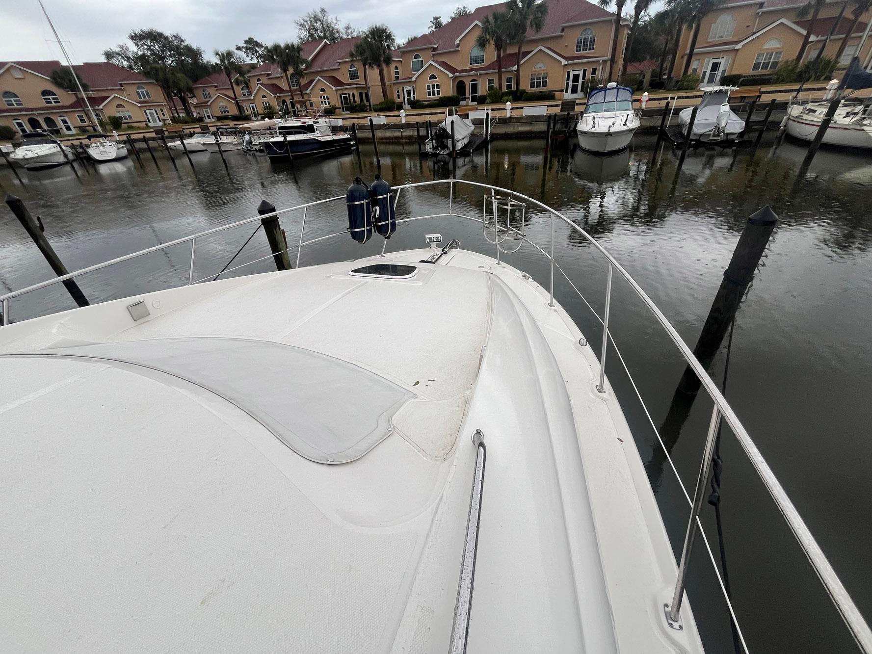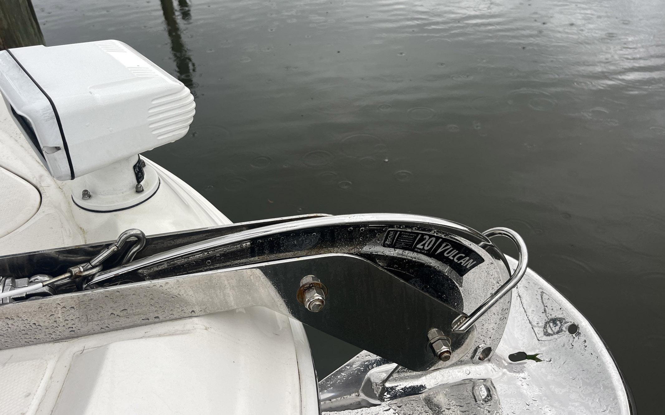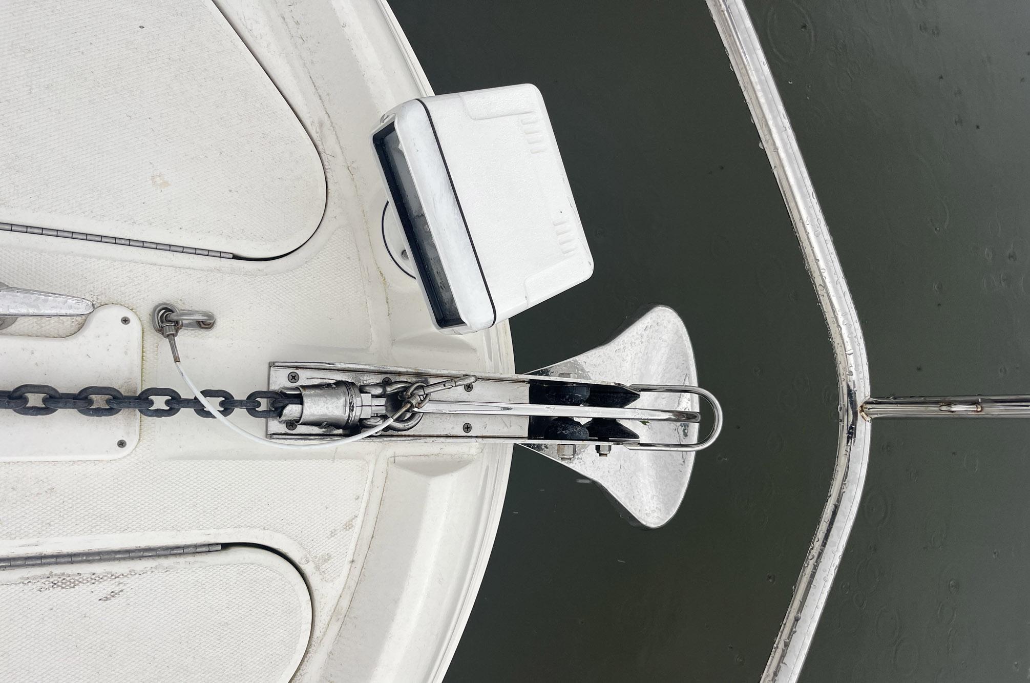 The foredeck on MAGNOLIA BELLE is accessed from the sidewalks on either side, through the clear wing-doors. The foredeck has fender racks, a spotlight, and lockers on either side of the bow pulpit. A removable cover on the windshield provides privacy. The bow also features a new stainless steel Vulcan Rocna anchor, and an anchor windlass. A hatch in the deck leads into the forward stateroom.