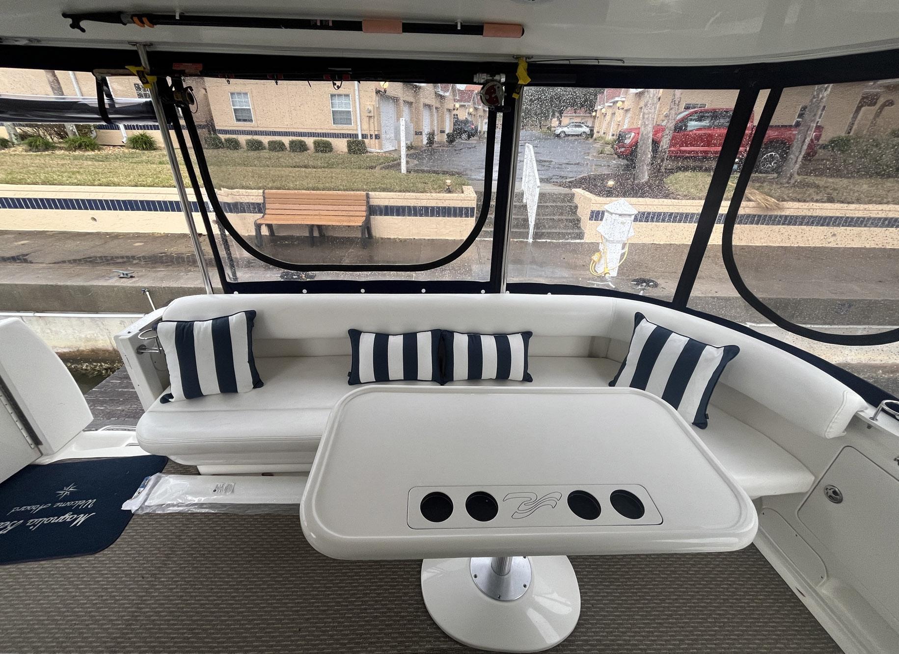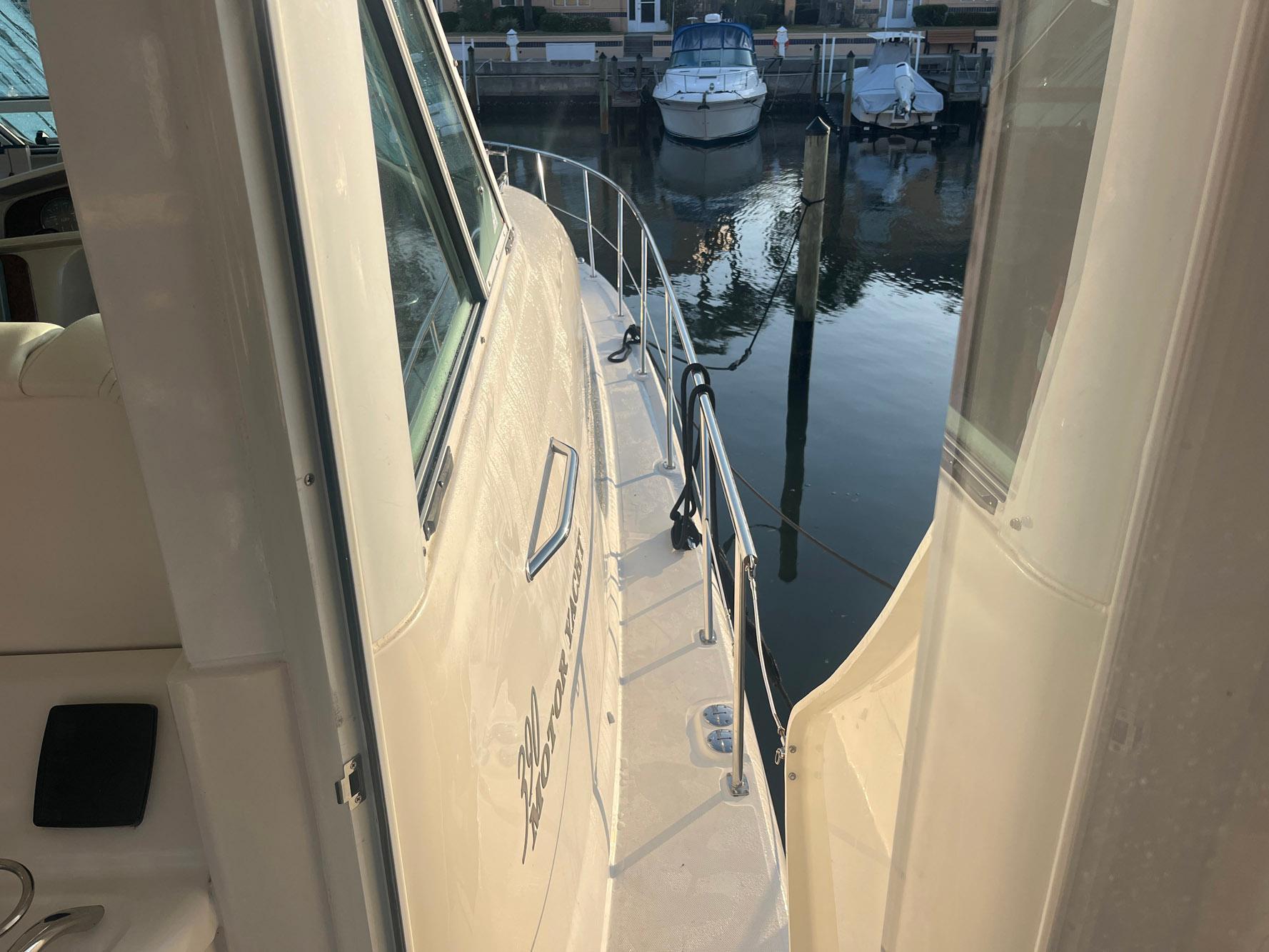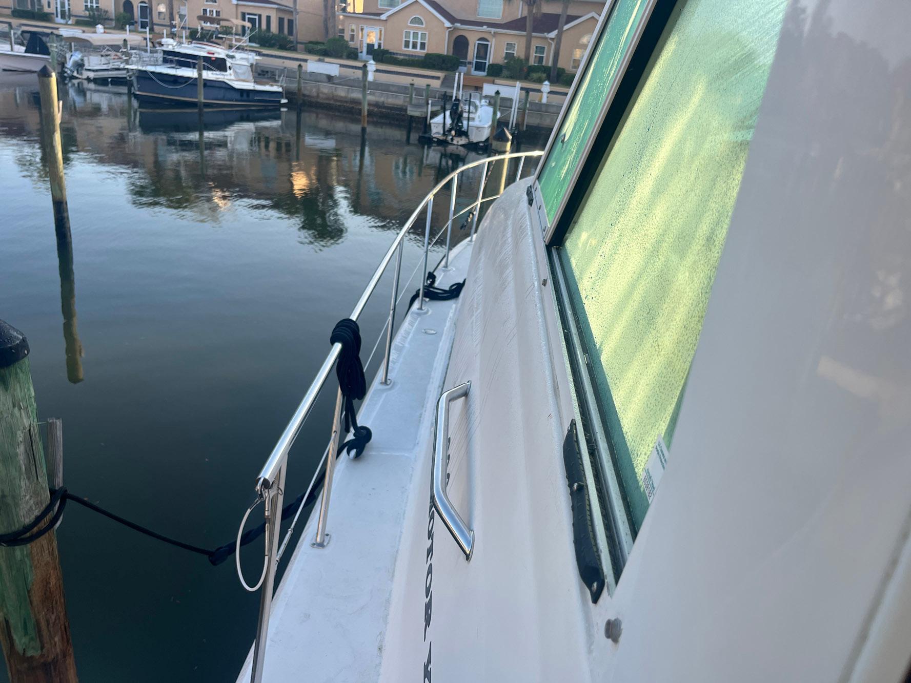 The foredeck on MAGNOLIA BELLE is accessed from the sidewalks on either side, through the clear wing-doors. The foredeck has fender racks, a spotlight, and lockers on either side of the bow pulpit. A removable cover on the windshield provides privacy. The bow also features a new stainless steel Vulcan Rocna anchor, and an anchor windlass. A hatch in the deck leads into the forward stateroom.