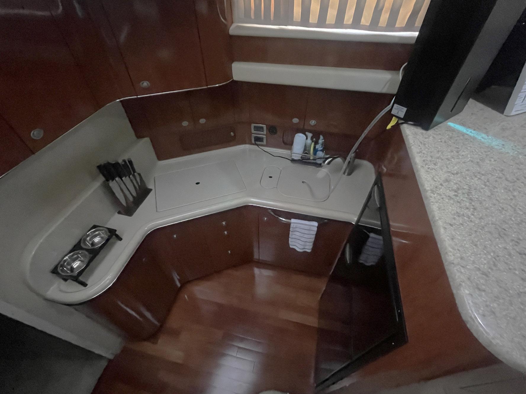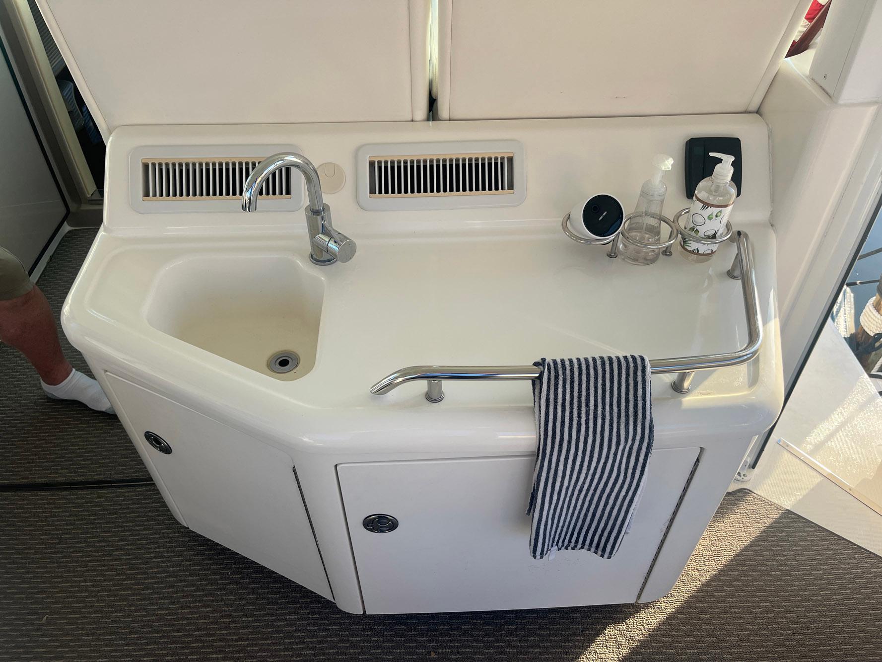MAGNOLIA BELLE boasts a well-appointed galley forward of the salon, to starboard. There is a large counter between the salon and galley. The Corian countertop features a molded sink with covers and a single-handle faucet for easy use. There is an in-counter covered trash receptacle. Cooking amenities include a 2-burner electric cooktop range, along with a 120V microwave/convection oven. A Vitrifrigo 12V/120V upright refrigerator with freezer offers ample storage for provisions. Thoughtfully designed upper and lower cabinetry provides abundant storage, including designated spaces for plates and glasses, while extra storage under the steps ensures everything stays neatly organized. The sole is hardwood. The door across from the galley, to port, provides access to the guest/day head. Headroom: 6'5".