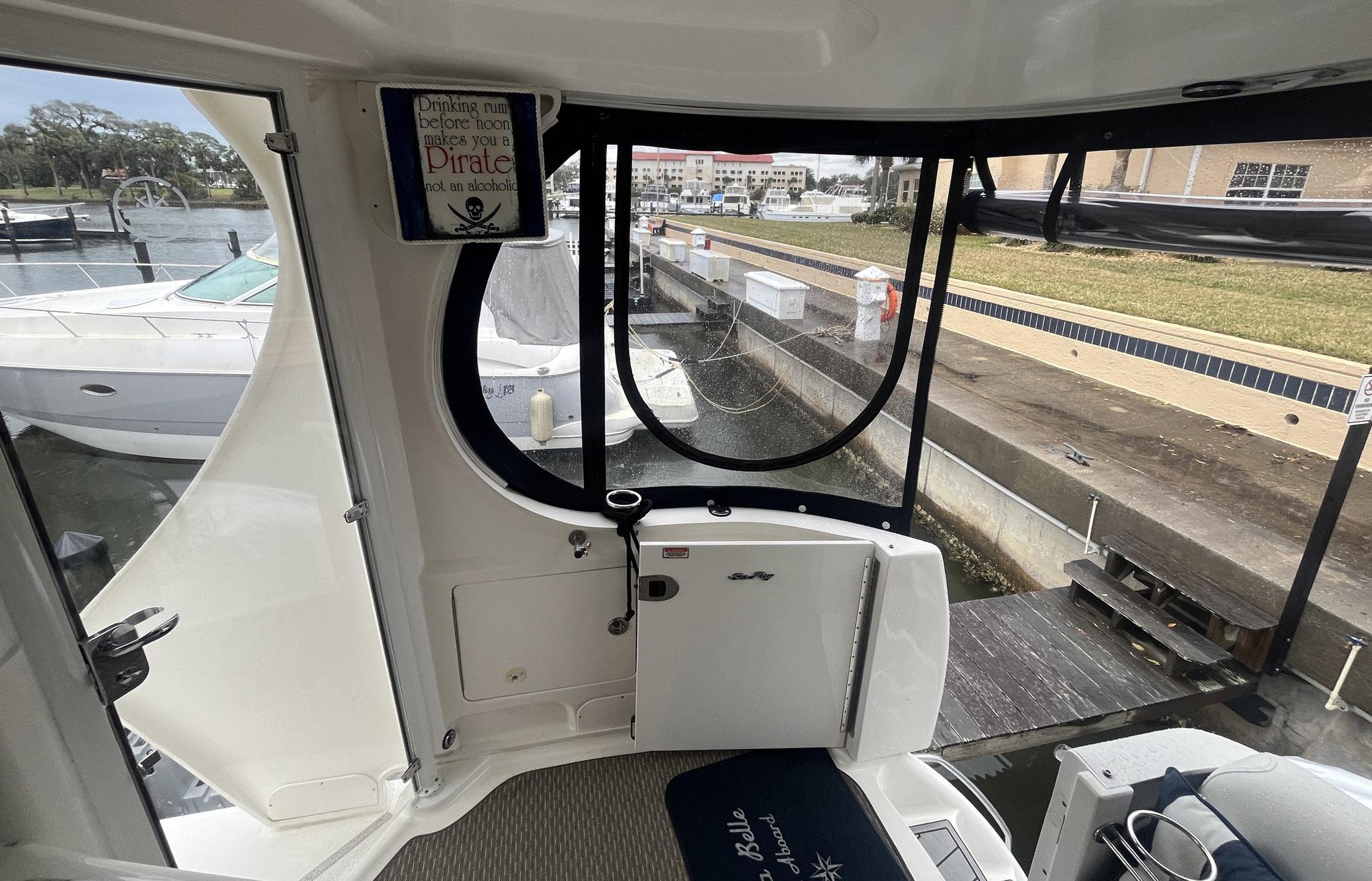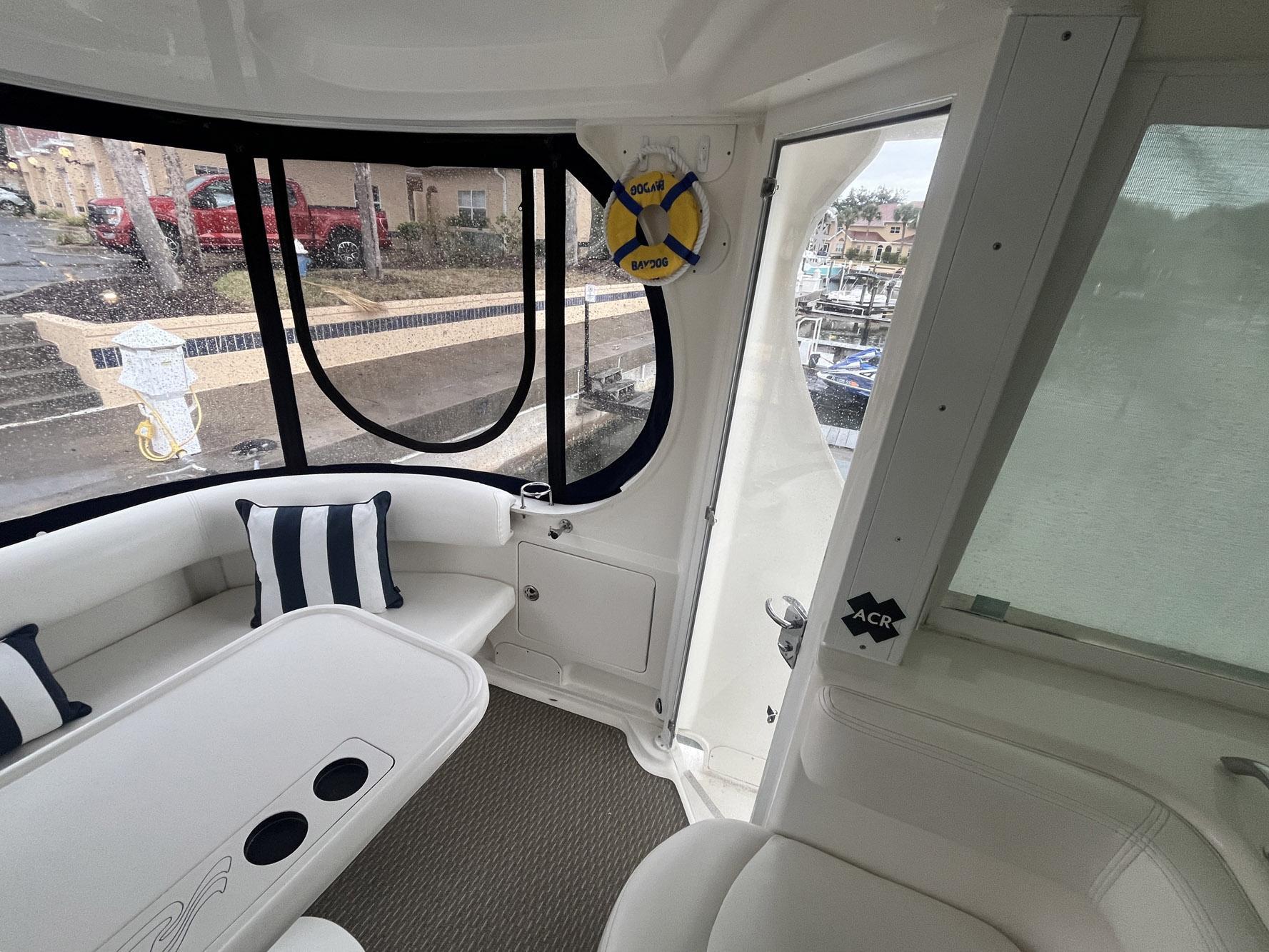 Boarding MAGNOLIA BELLE is via the openings in the handrails for side entry, or the integrated swim platform, with a stairway leading to the enclosed aft deck with ample seating, a wet bar, and wing doors for easy side deck access. The well-equipped helm is forward on the aft deck.