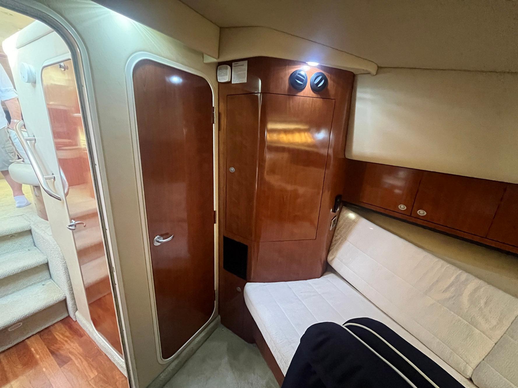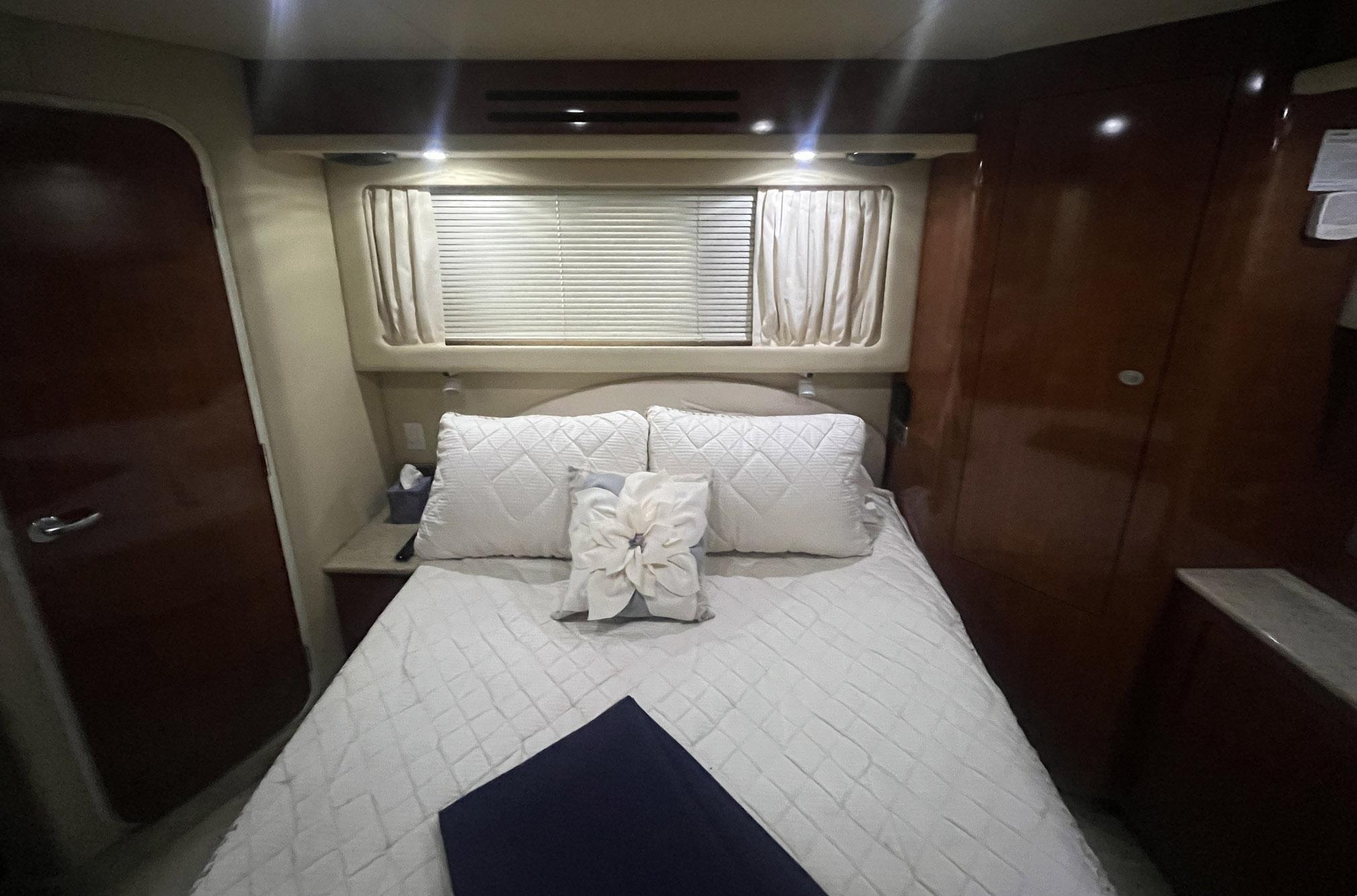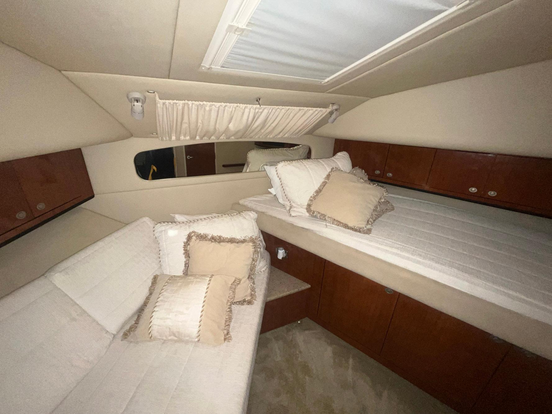 The Sea Ray 390 has a climate controlled aft deck/helm area with a hard top and Isinglass windows, which can be opened to allow in fresh air. The full beam aft deck features comfortable seating, a table for alfresco dining, a carpeted sole, a wet bar and refrigerator, and clear wing doors that open to the side decks. The helm area is on the same level as the aft deck, allowing the skipper to interface with the crew and guests. MAGNOLIA BELLE is equipped with a SeaLift Manual Tender Lift, to facilitate the launching and retrieval of the tender. Headroom: 6'7".