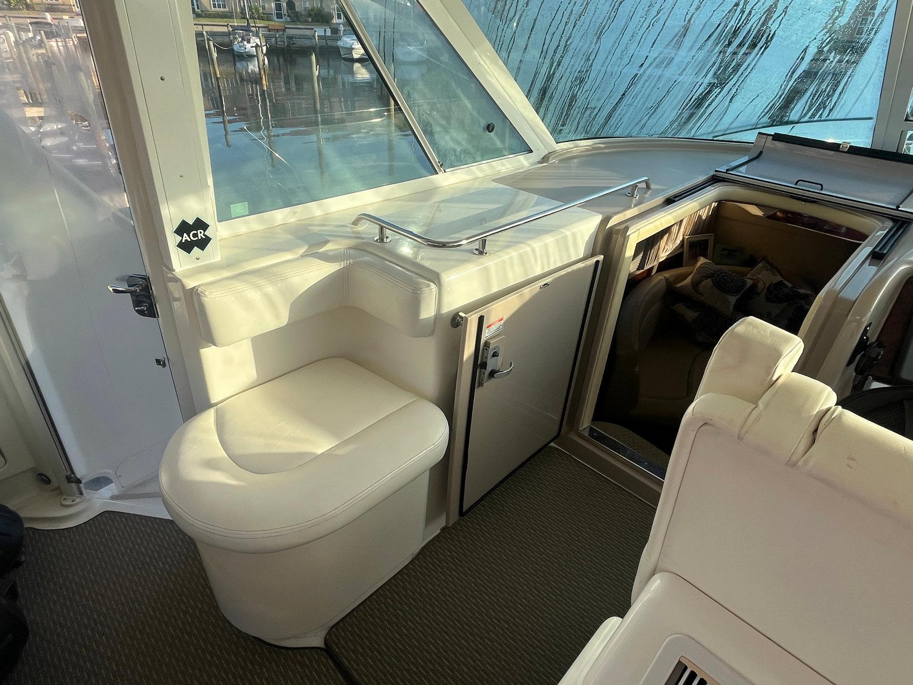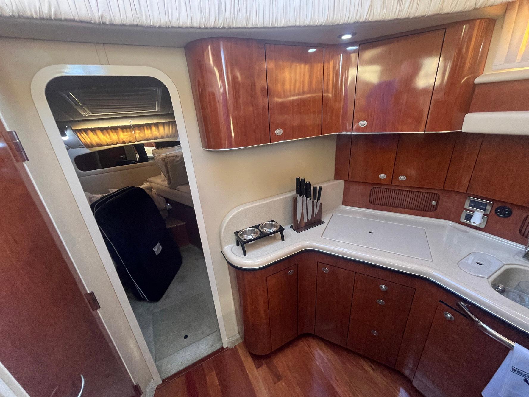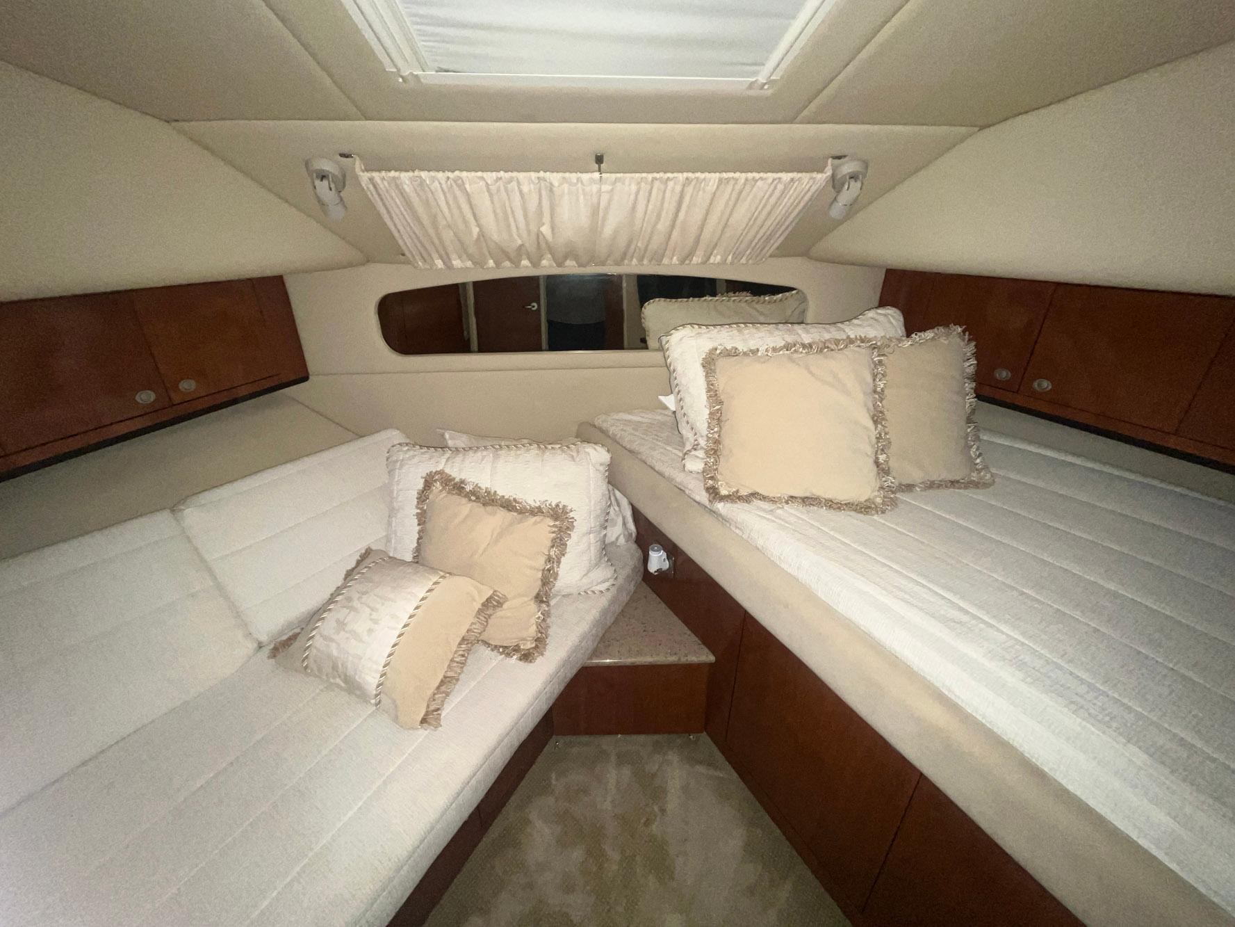 The Sea Ray 390 has a climate controlled aft deck/helm area with a hard top and Isinglass windows, which can be opened to allow in fresh air. The full beam aft deck features comfortable seating, a table for alfresco dining, a carpeted sole, a wet bar and refrigerator, and clear wing doors that open to the side decks. The helm area is on the same level as the aft deck, allowing the skipper to interface with the crew and guests. MAGNOLIA BELLE is equipped with a SeaLift Manual Tender Lift, to facilitate the launching and retrieval of the tender. Headroom: 6'7".