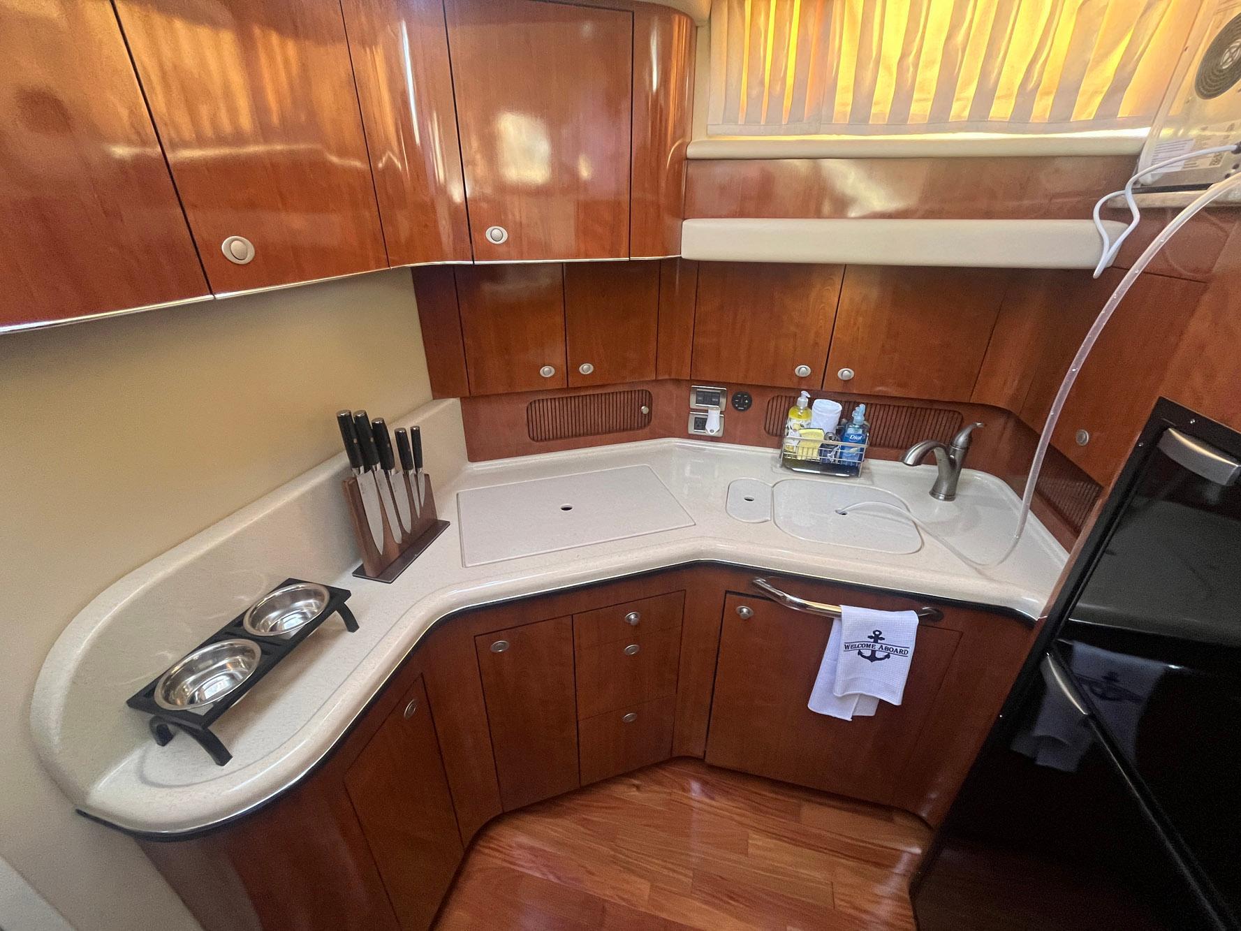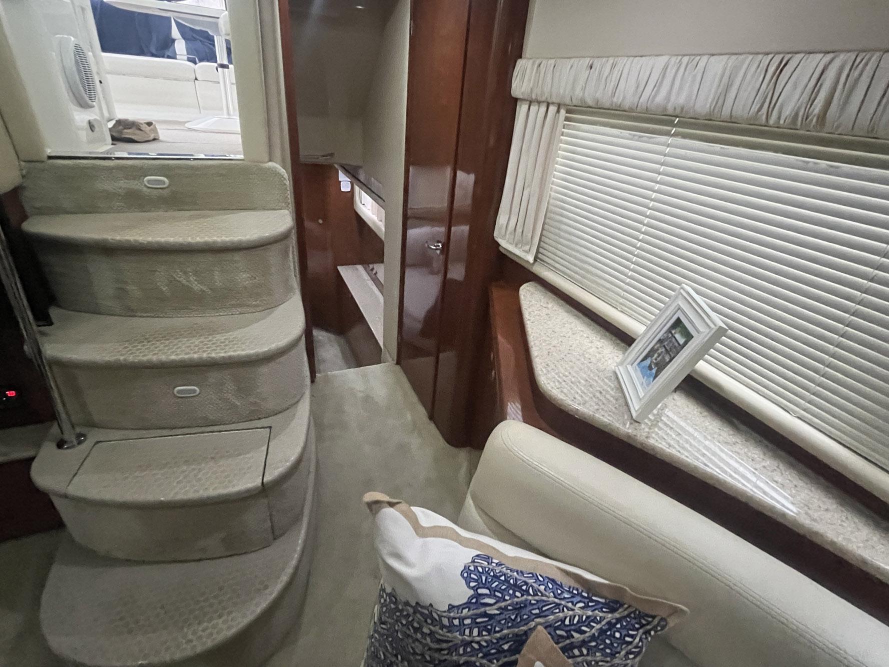 Steps to port of the helm station lead to the interior cabin space below. The bright and spacious salon features comfortable seating, cherry wood cabinetry, and an entertainment center, seamlessly flowing into the fully equipped galley down to starboard.
