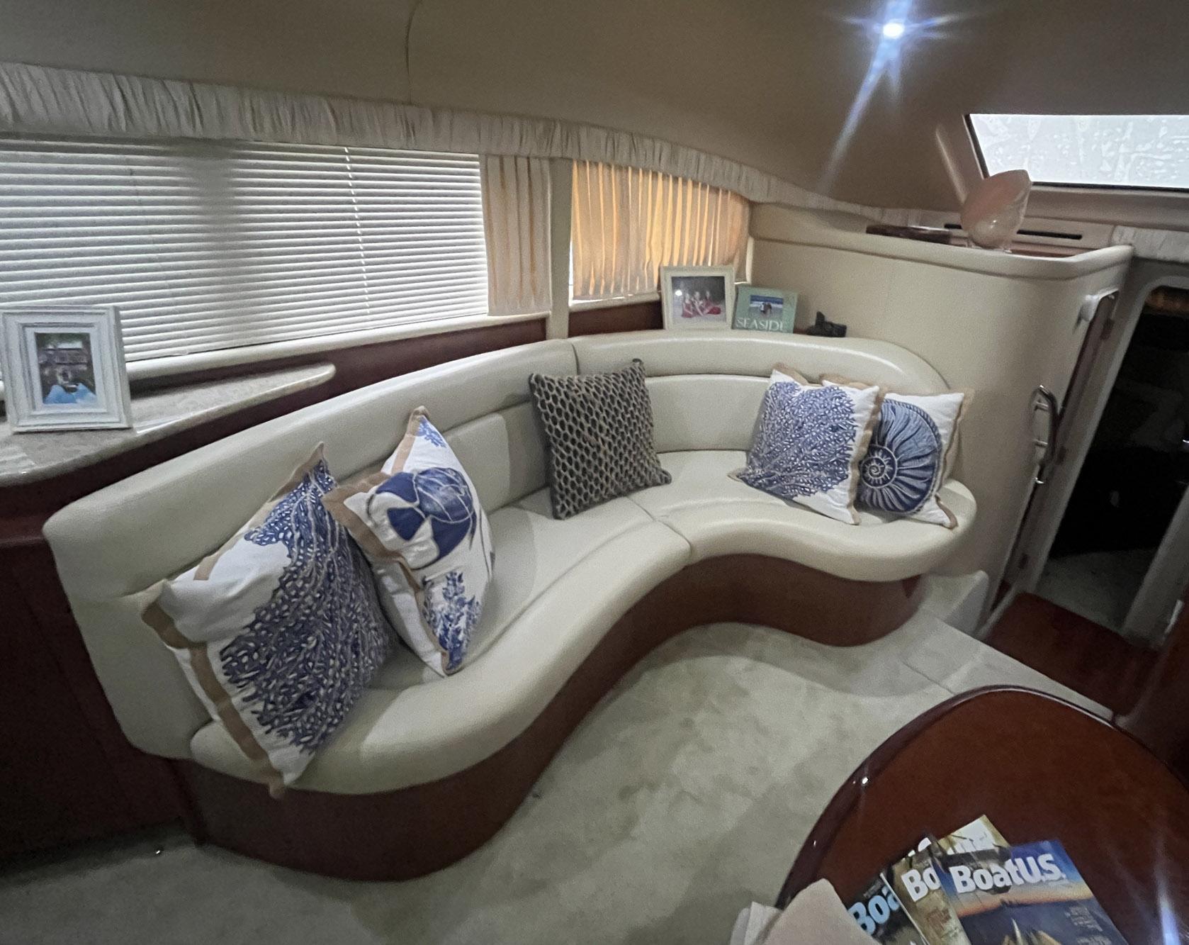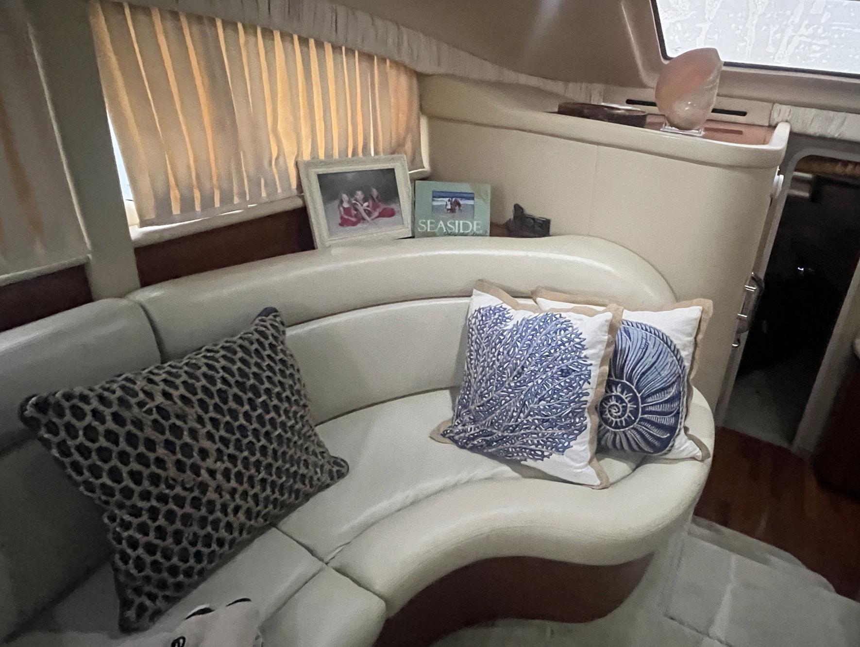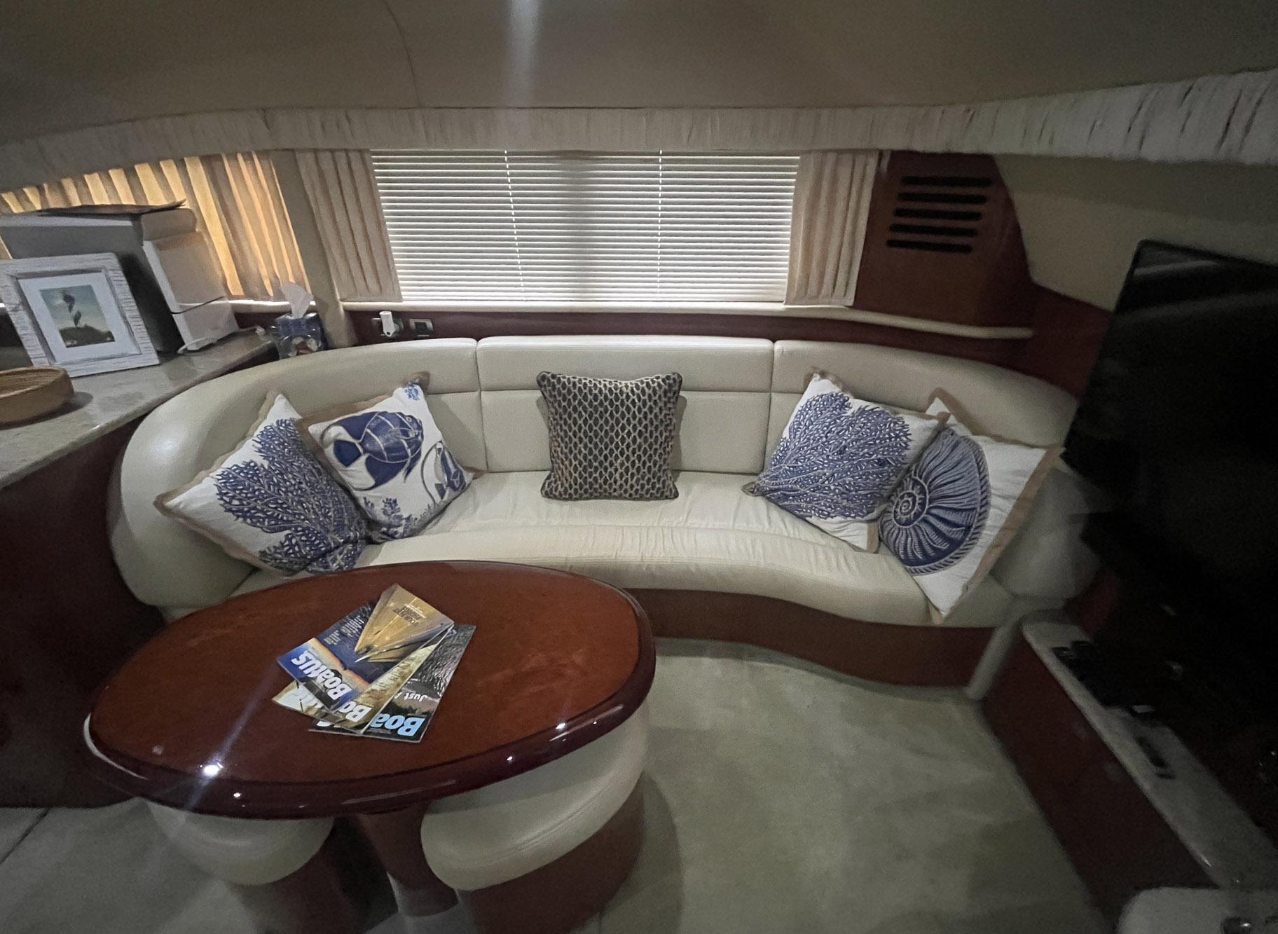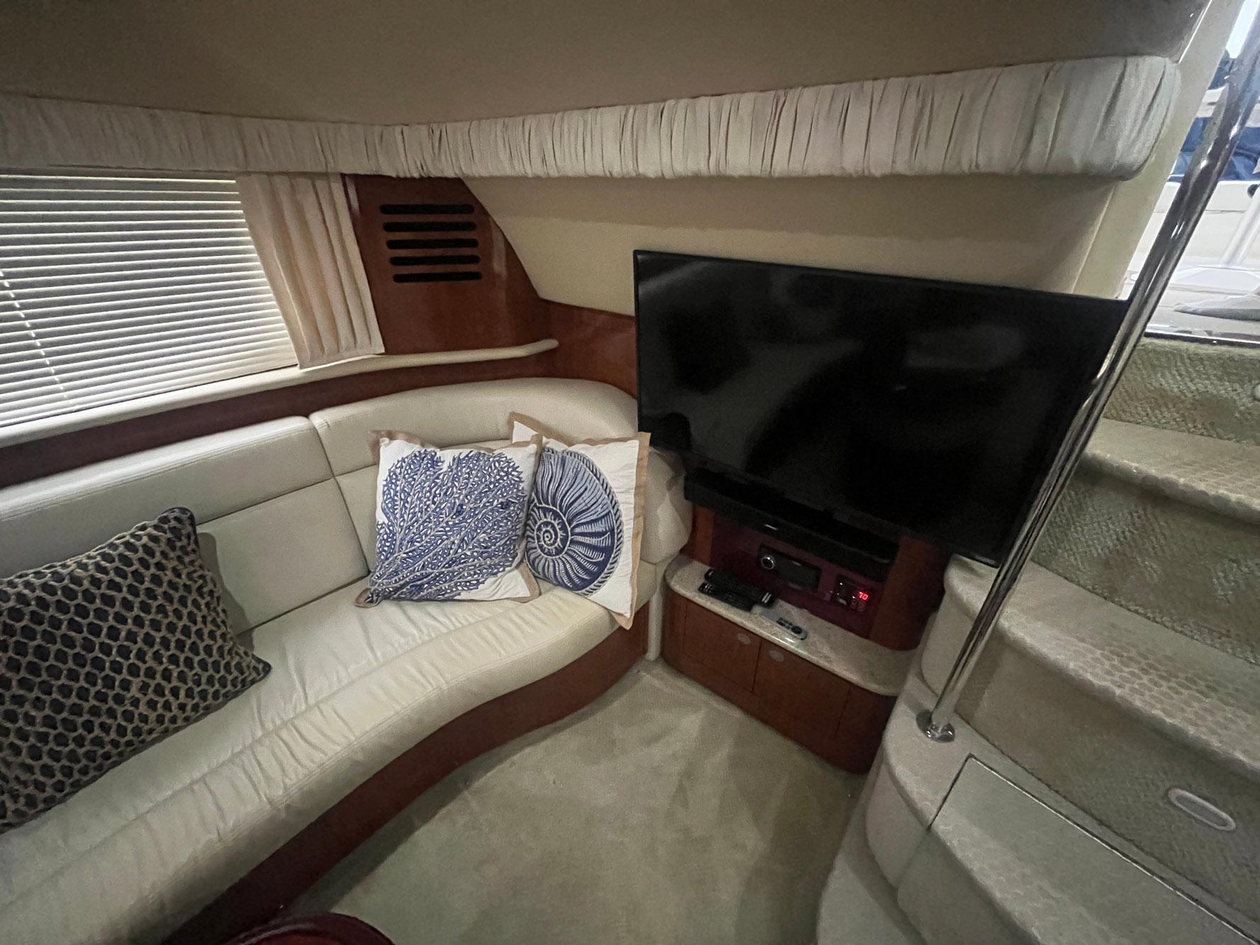 The salon on MAGNOLIA BELLE is a few steps down from the aft deck. The steps have a sliding door for privacy and safety. A curved Ultraleather settee is to port. A second curved Ultraleather settee is to starboard. A high-gloss wood table is in front of the settee to starboard with two stools that conveniently store beneath. Elegant blinds and valances enhance the space. The sole has neutral carpeting. The carpets were professionally cleaned recently, and the snap-on protective carpet covers convey with the vessel. A large flat screen TV is aft in the salon. A floor hatch provides easy access to the engine room. Headroom: 6'3".