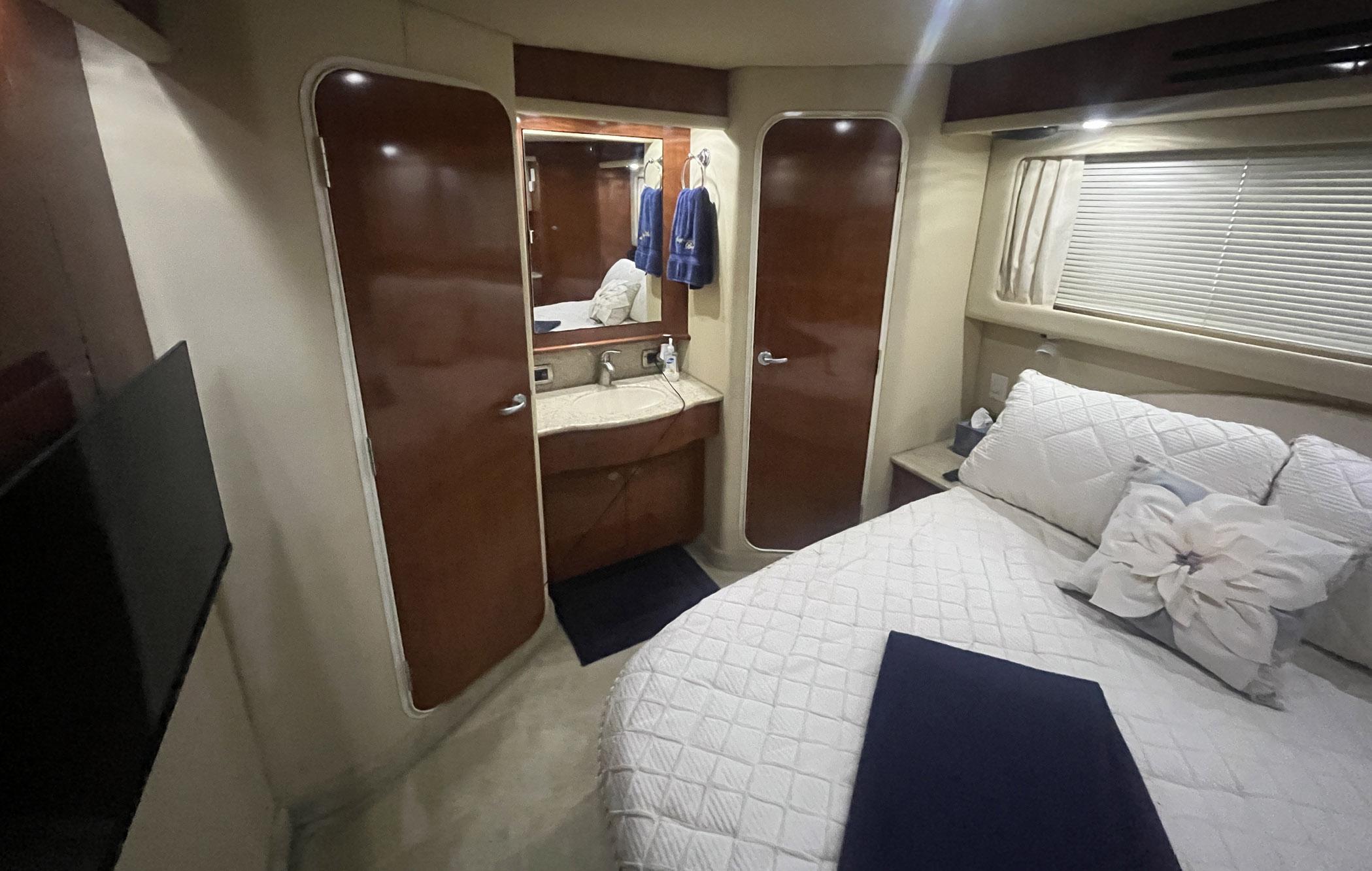 The full-beam aft master stateroom has a queen-sized island berth, generous storage, and an en-suite shower, vanity, and separate water closet. The forward guest stateroom offers a double berth with one convertible queen bed and an additional twin with ensuite access to the forward head, with an enclosed shower stall.