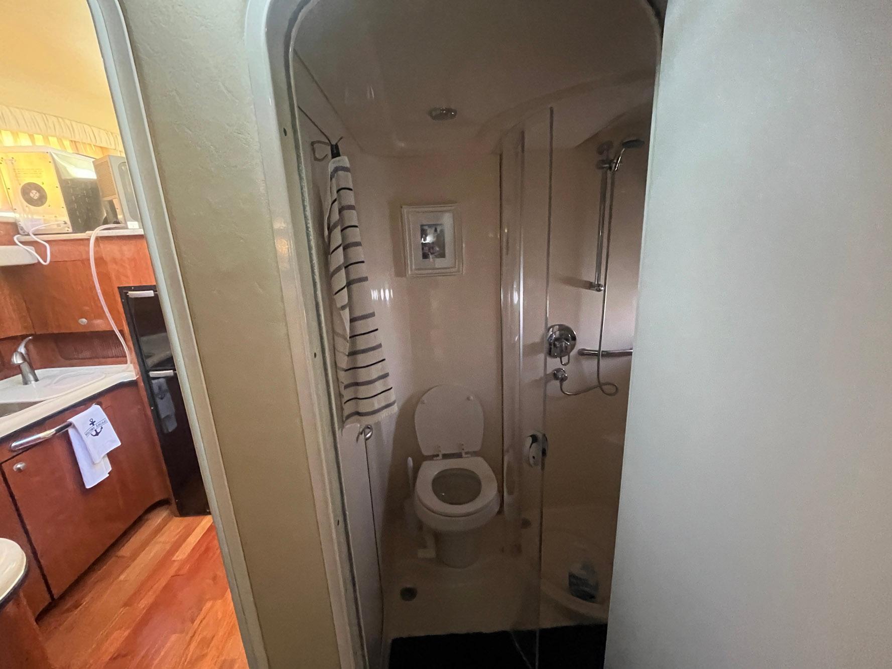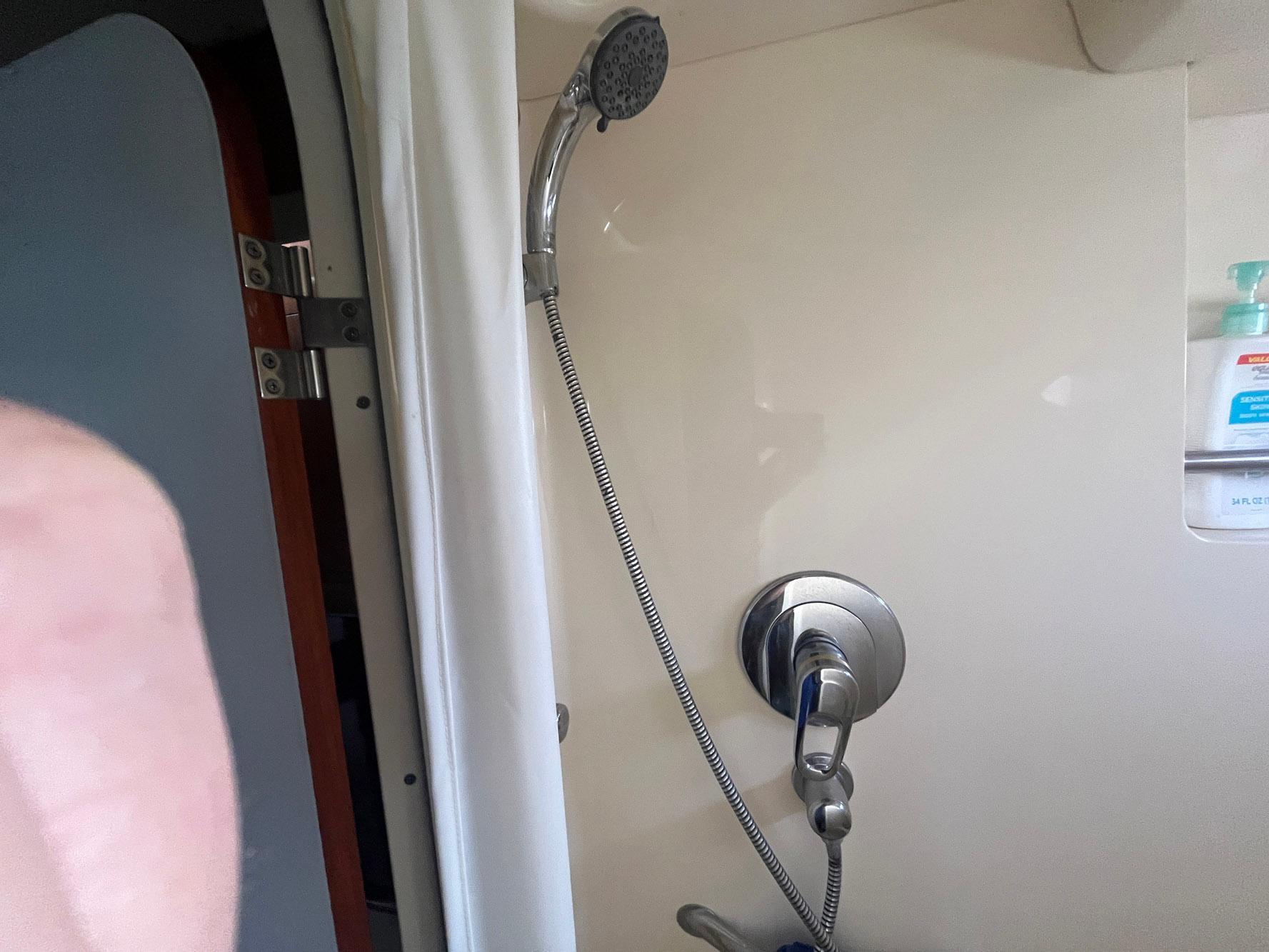 The fiberglass stall shower, with a shower curtain, integrated shower seat, opening portlight, a toiletries storage nook, and adjustable shower wand is situated forward of the vanity. Headroom: 6'4".