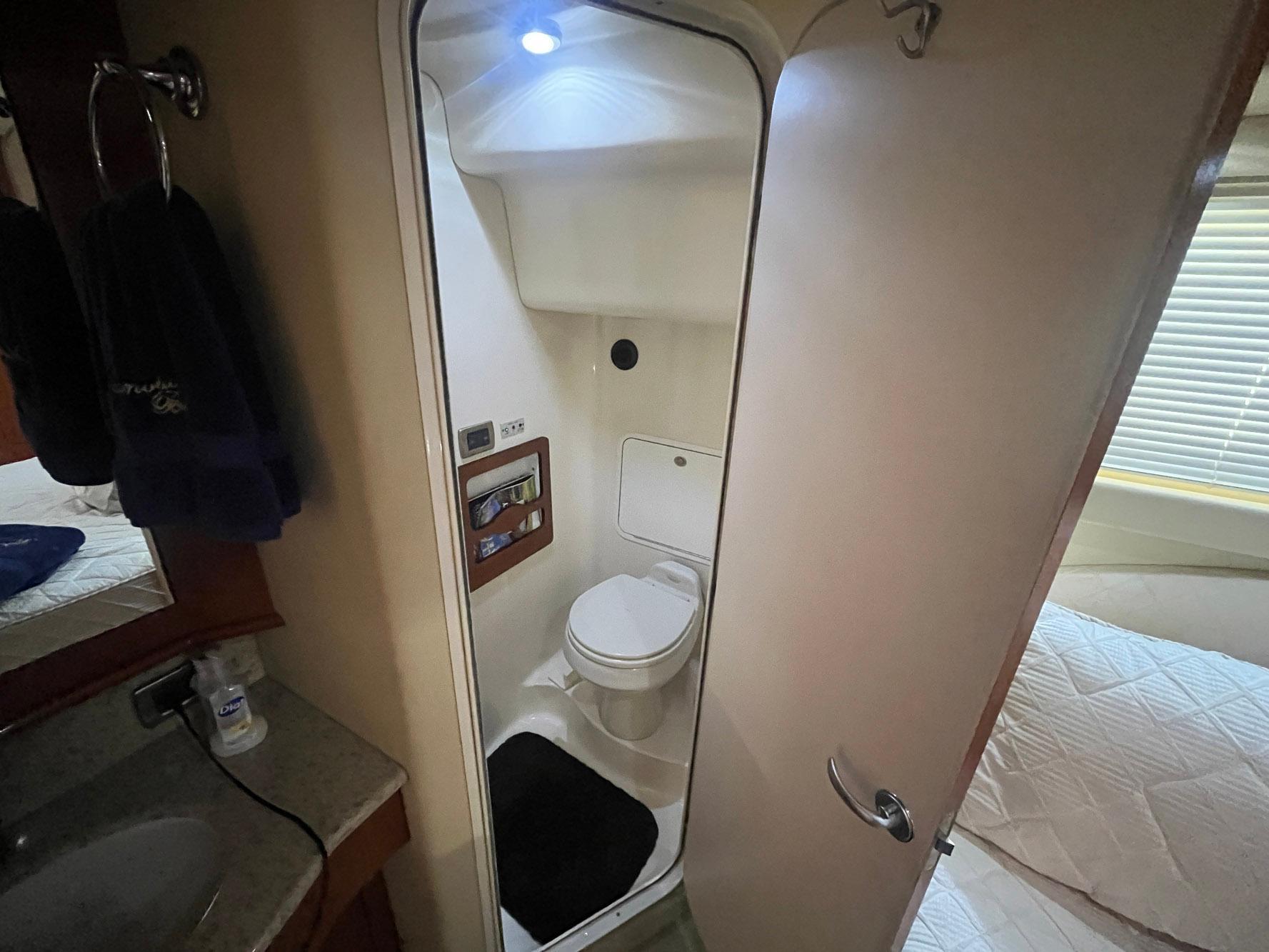 The split ensuite master head on MAGNOLIA BELLE is thoughtfully arranged, on the starboard side of the master stateroom. The vanity is positioned between the stall shower and water closet. It is equipped with a molded sink in the Corian countertop, a mirrored storage cabinet above, and additional storage below. There are 110V outlets for small personal appliances.