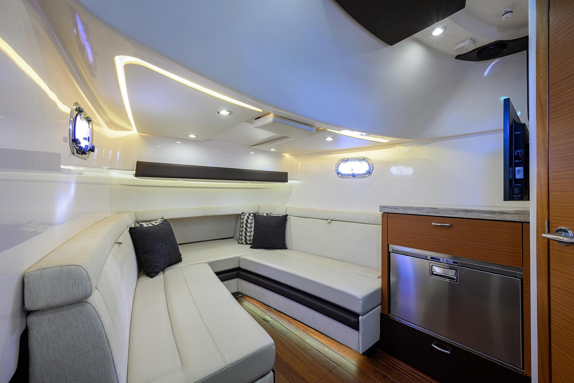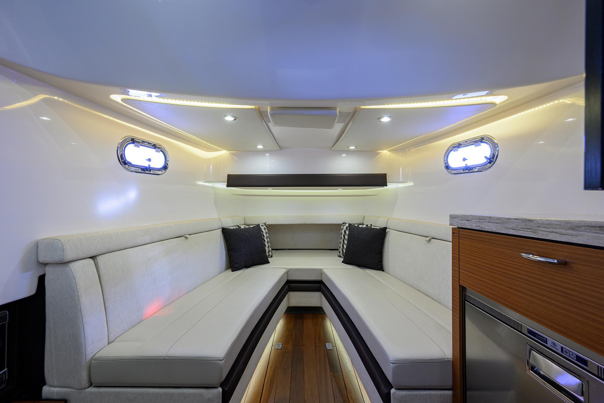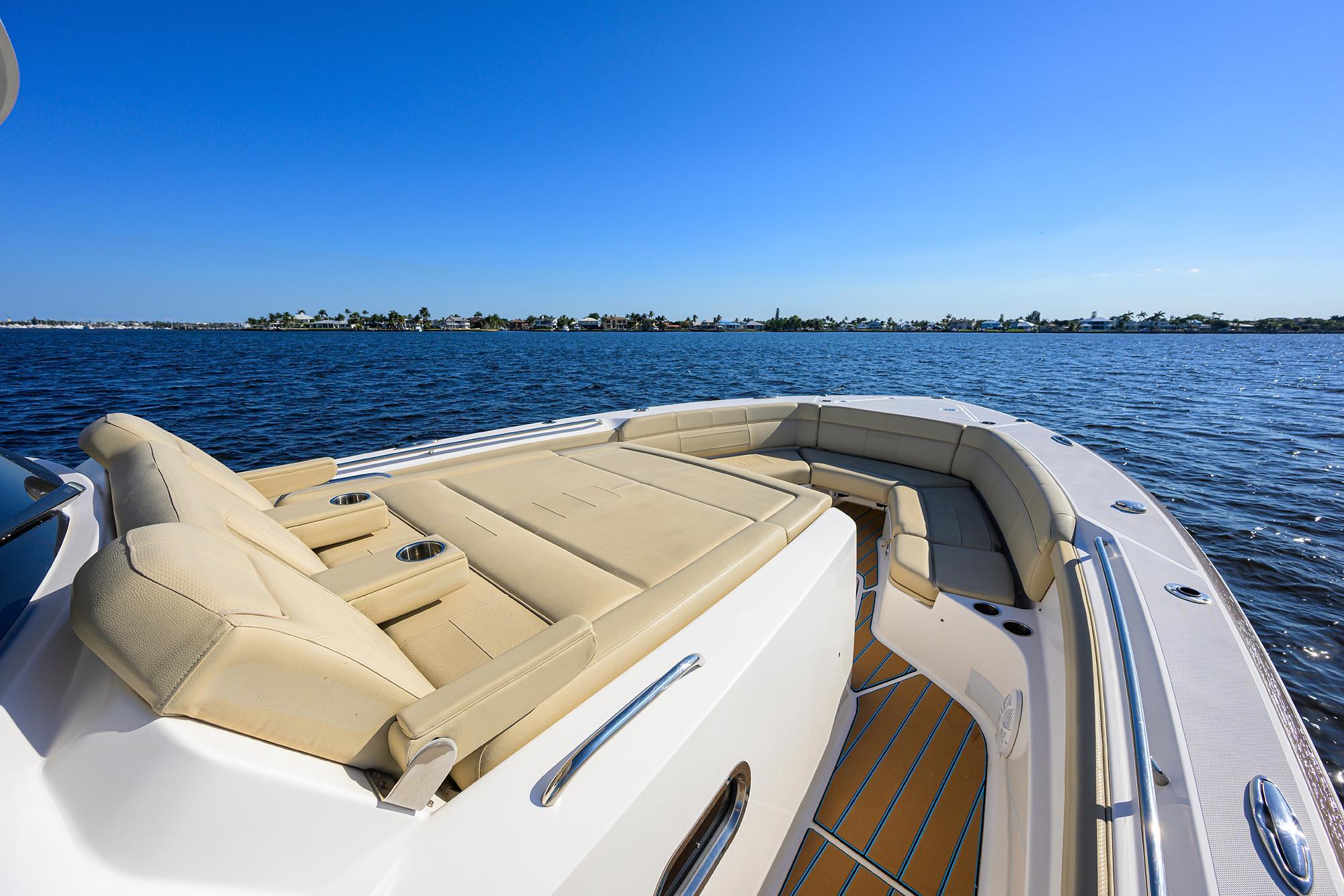 Pick your pleasure aboard the S 408, lounge, entertain, fish and dive all in the comfort of uniquely engineered social zones. The bow features a full sunpad along with lounge seating complimented by a convertible table. For the Captain a three-wide helm arrangement offers plenty of room and adjustment to enjoy operating the boat with friends and family are close by. Aft in the cockpit, complete with mezzanine seating, you can fish hard and entertain when dockside with amenities like the transom freezer box and electric grill. And with the privacy of an enclosed head and light kitchen amenities overnight for a short weekend getaway.