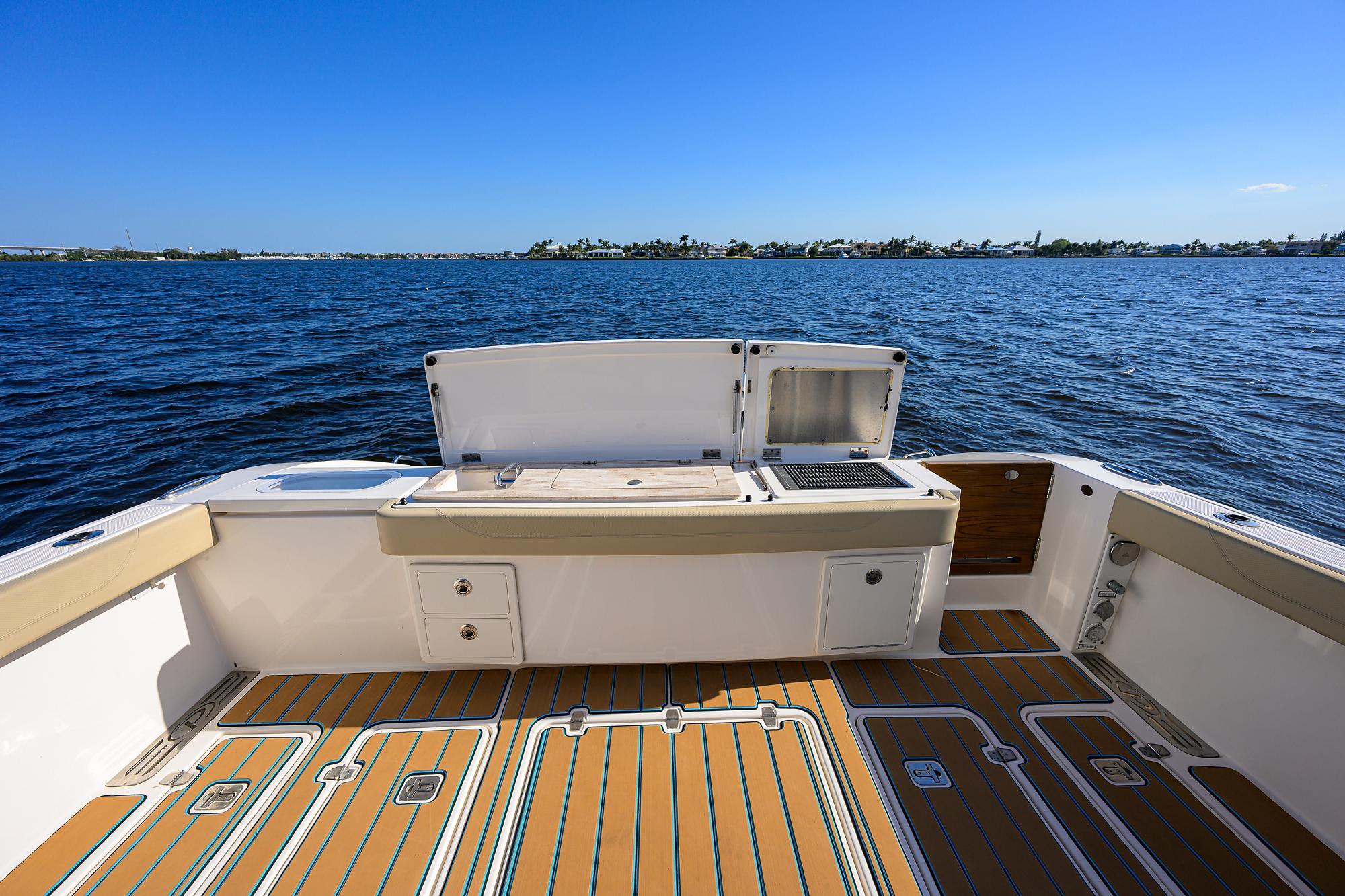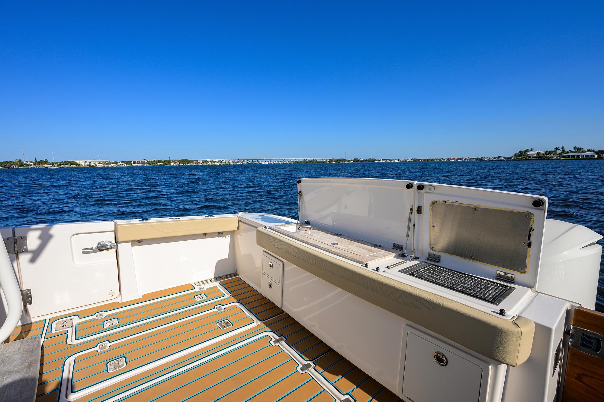 - Aft Cockpit Prep Center, Fiberglass Lids (2), Fish Box (47 Gallon) Insulated with Refrigerator/Freezer Coils and Digitally Controlled Thermostat in Cabin, Sink with Pressurized Folding Hot/Cold Faucet, Corian® Cutting Board, 240V/60 Cycle Electric Grill and Tackle Storage Drawers (4)