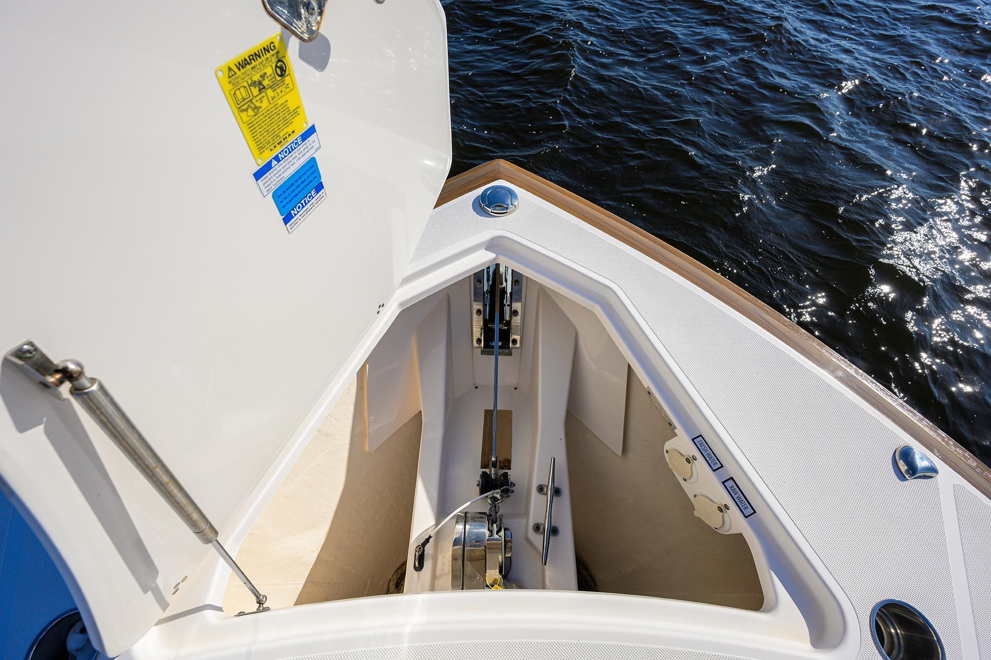 - Flush Mounted Integral Anchor Locker with Fiberglass Lid including: Horizontal Anchor Windlass with Switch at Helm and Remote at Anchor Locker