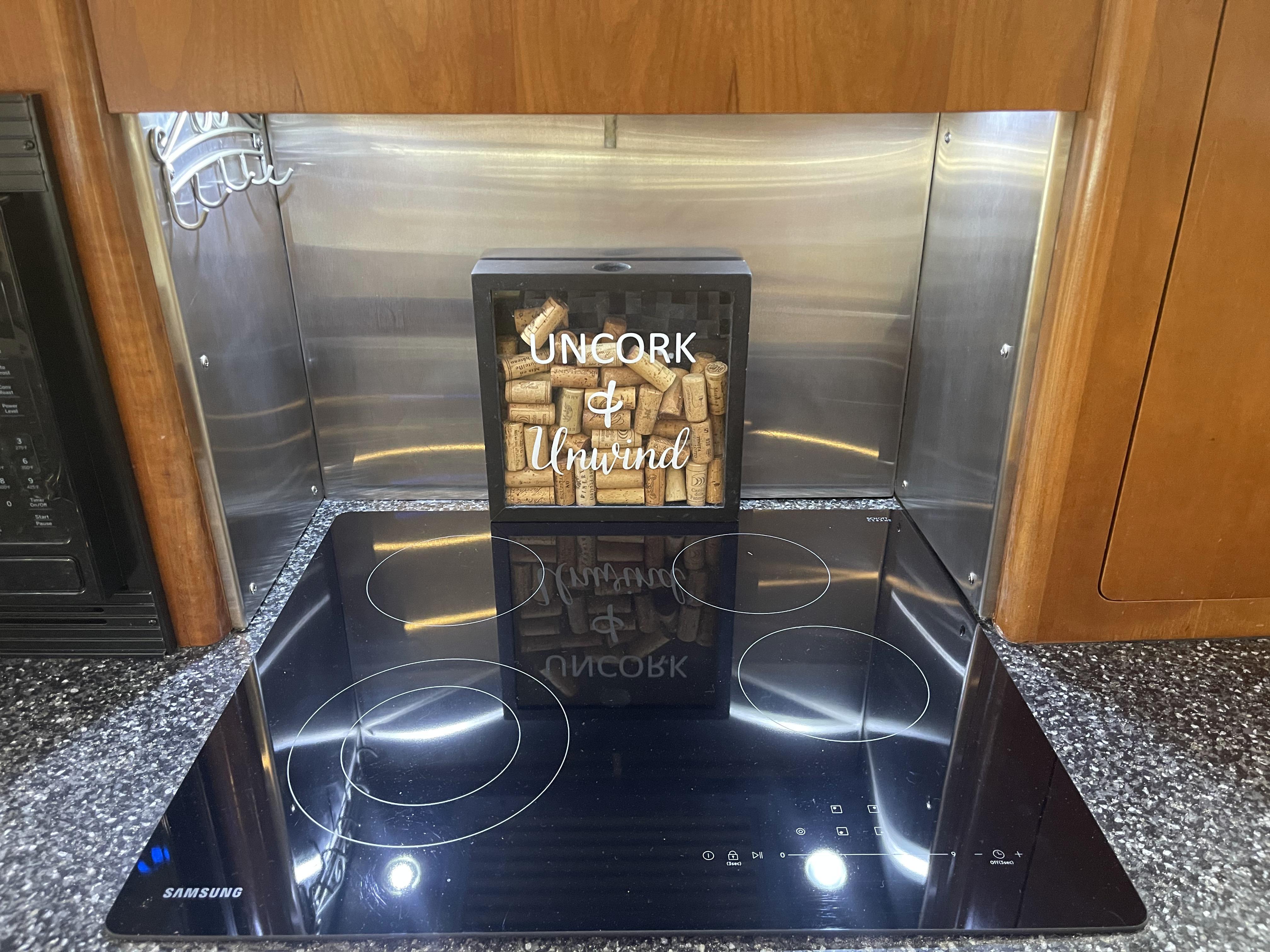 • Stainless cooktop surround with external vent hood fan and overhead lighting.