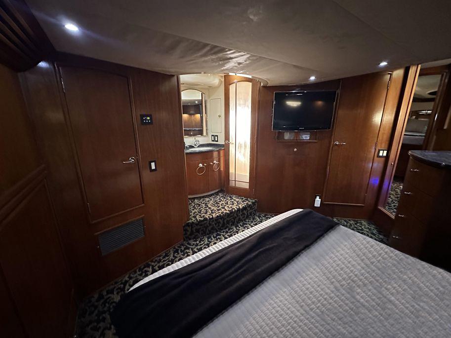 access to the guest head. This stateroom features a Tempurpedic bamboo mattress, an overhead escape hatch to the foredeck above, two spacious closets, and a Fusion audio sound system with overhead speakers.
