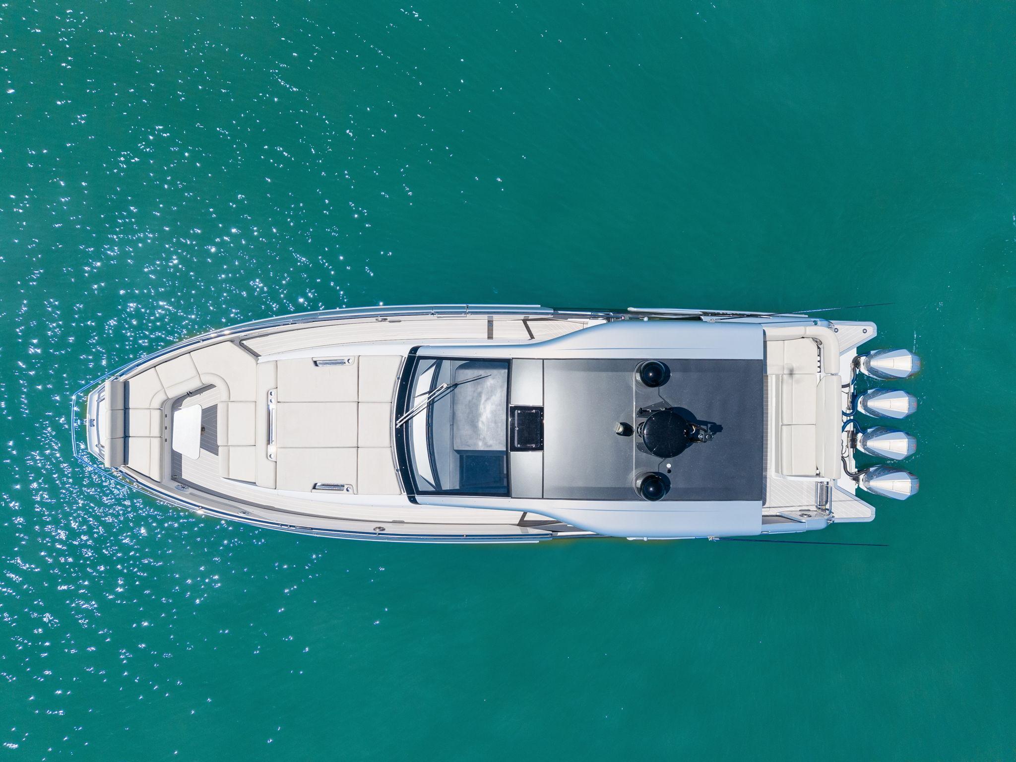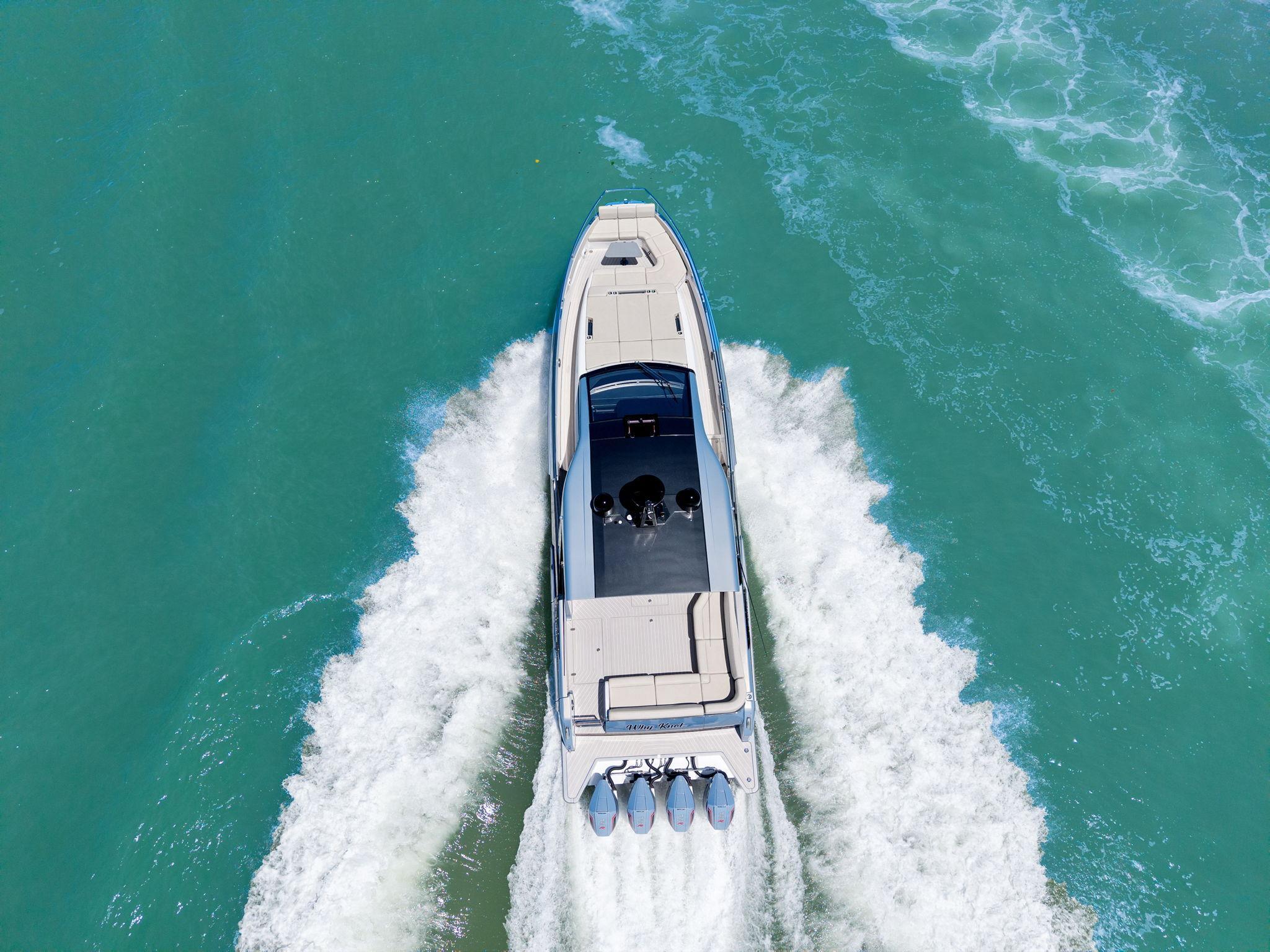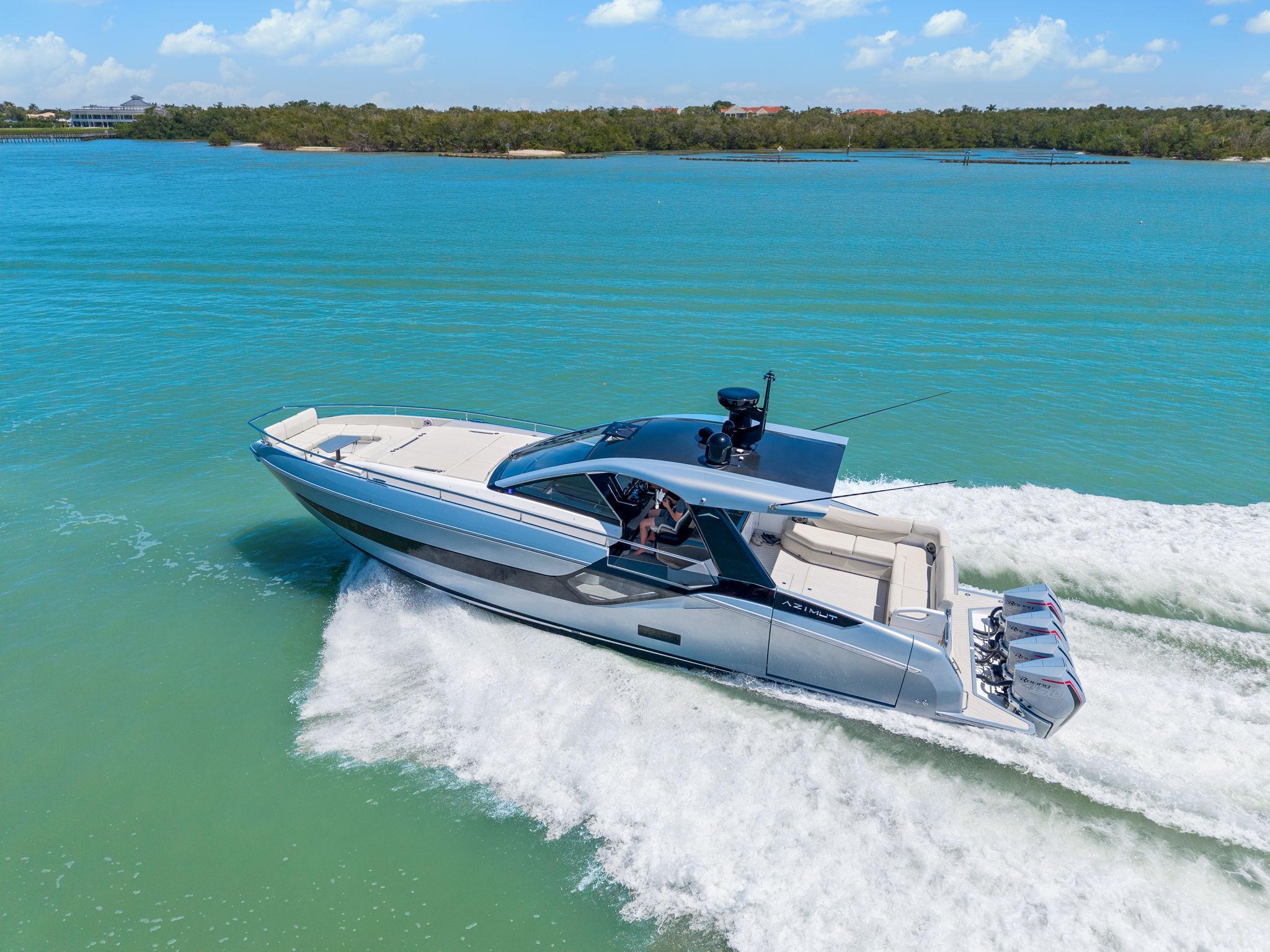 The 2022 Azimut Verve 47 combines Italian styling and American power with quad Mercury 450Rs, luxurious accommodations, and thrilling performance up to 50 knots.The sporty, dynamic external lines of the Verve 47 conceal surprisingly spacious volumes while the ample open-air areas are designed with comfort and versatility in mind. Sit back and prepare to be enthralled and seduced by its timeless modernity as you experience the invigorating, empowering sense of knowing you are free to have whatever your heart desires, wherever and whenever you choose to go.The asymmetrical split-level layout of the bow is designed to maximize space for outdoor living. Up top is an ample cushioned sunbathing area while just below is a versatile al fresco lounge-cum-dining zone with a six-person table surrounded by an inviting C-shaped divan.The concept behind the design of the exterior areas is to enable the owner and guests to fully enjoy the extraordinary privilege of life on the water. Versatility is to the fore, with a high-low table that can be completely removed from sight, a lateral open section and well-equipped cockpit cabinet creating an enticing, glamorous aft area that is simply made for long, convivial afternoons and evenings relaxing with friends and family.The American approach of wholeheartedly embracing the sporty nature of life at sea combines with renowned Italian style and design flair, and of course the unmistakable Azimut personality and attention to detail. The bow reinterprets the typical profile of offshore racing boats, but the innovative integration of the windows into the hull and gunwale creates an extraordinary sense of connection with the sea.