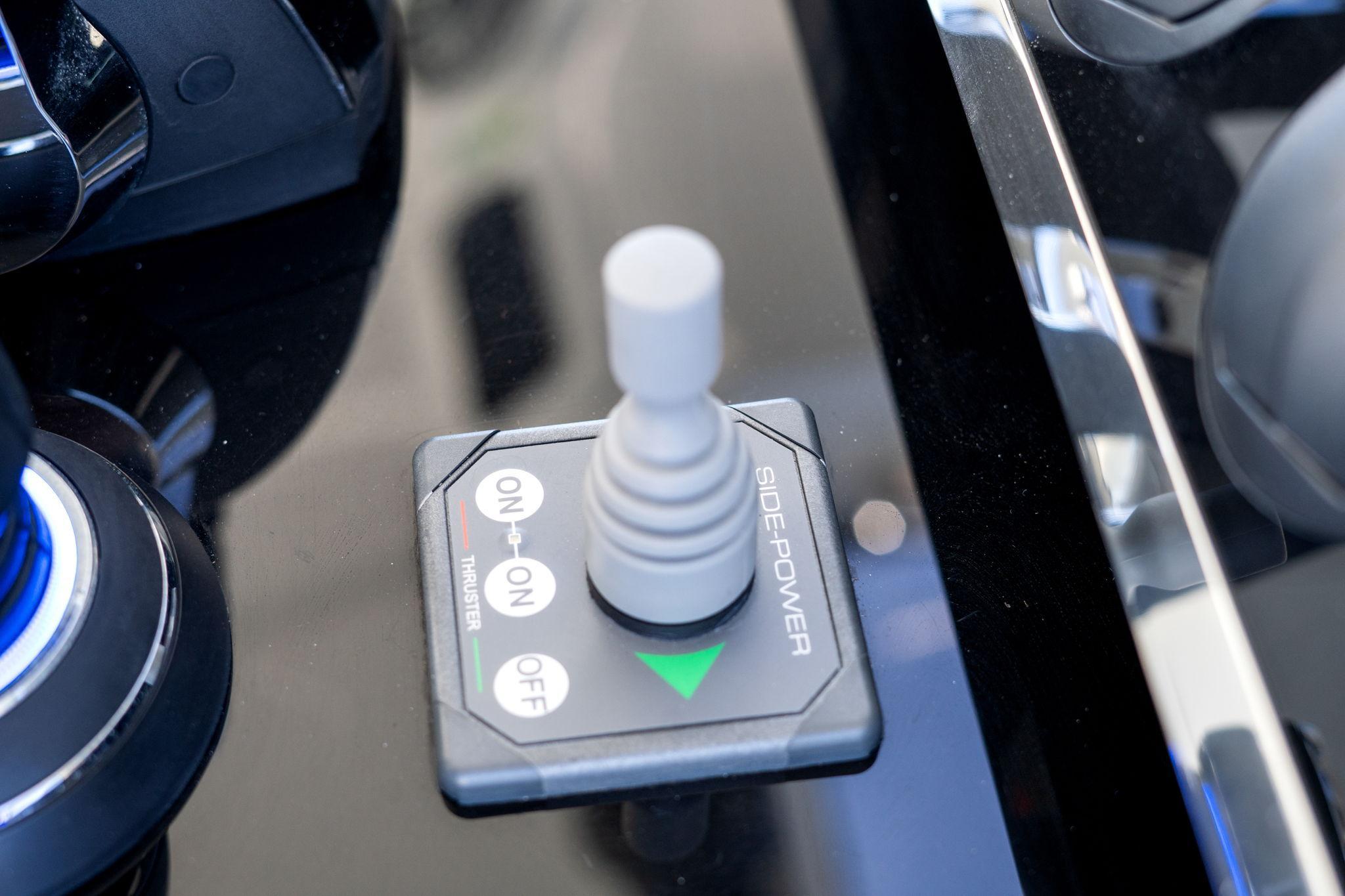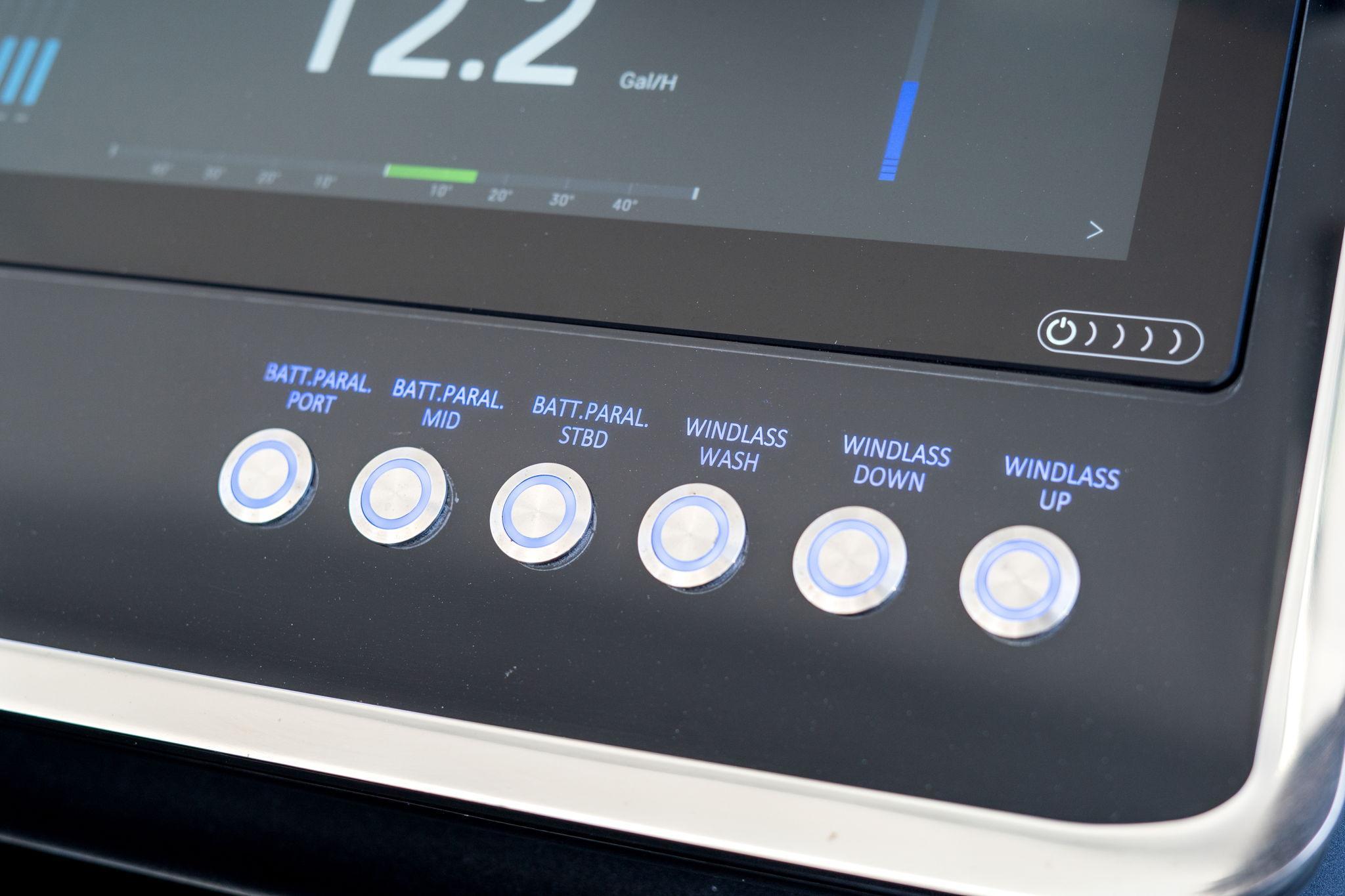 Raymarine touchscreen displays, joystick control, bow thruster, VHF, radar, and digital switching.
