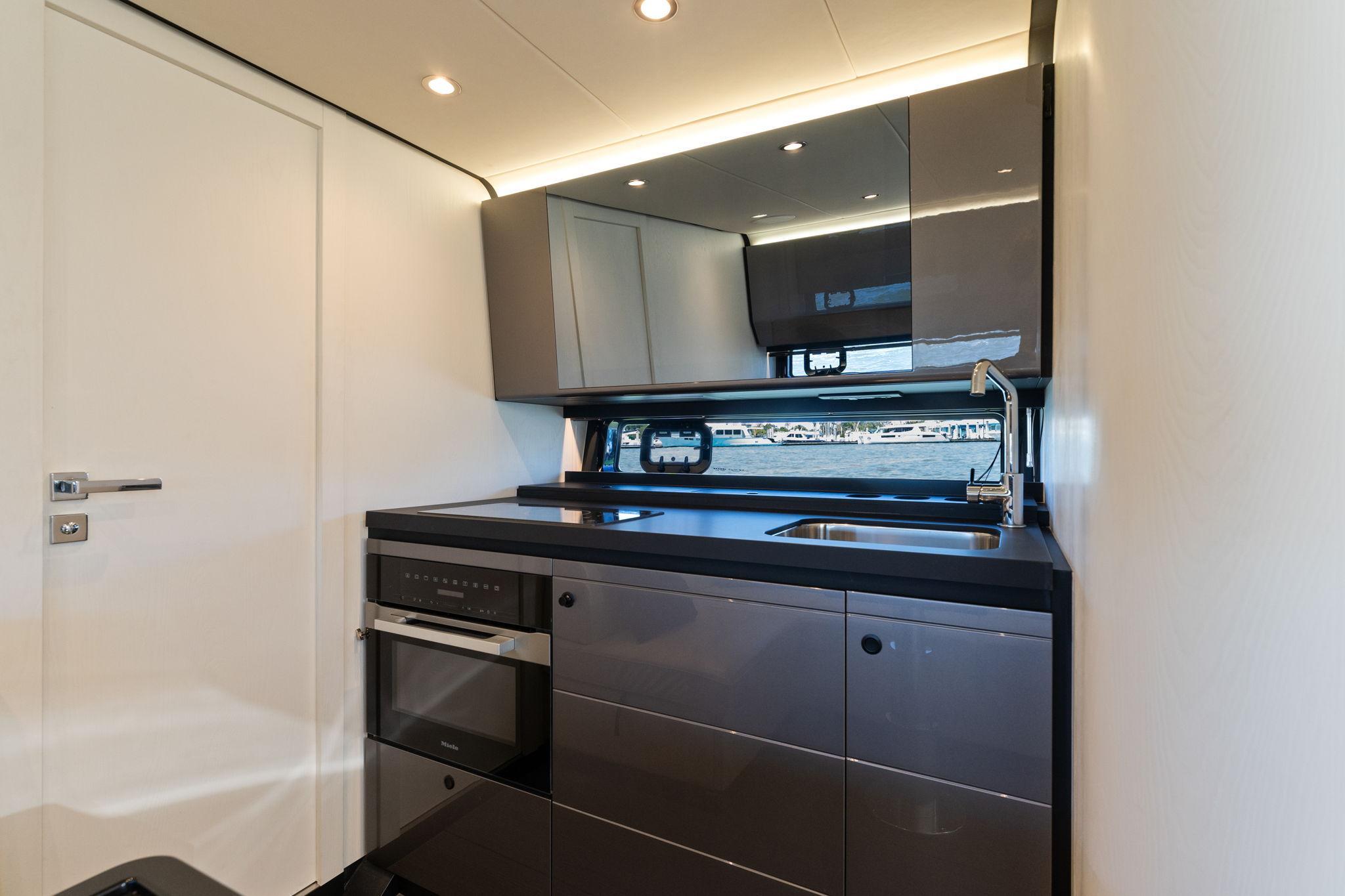 Full galley with cooktop, sink, refrigerator, storage, and modern cabinetry integrated into a bright, open-plan layout.