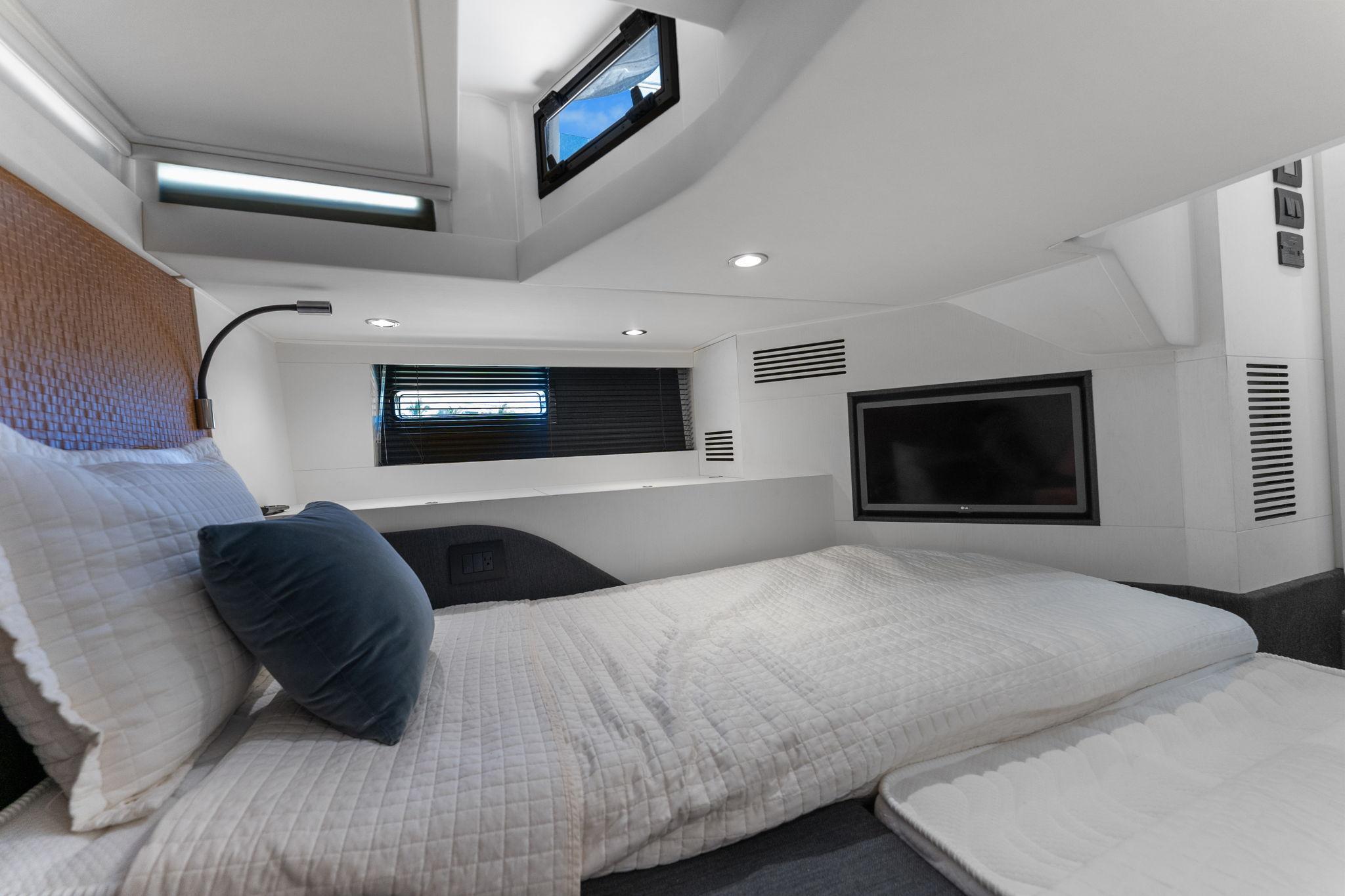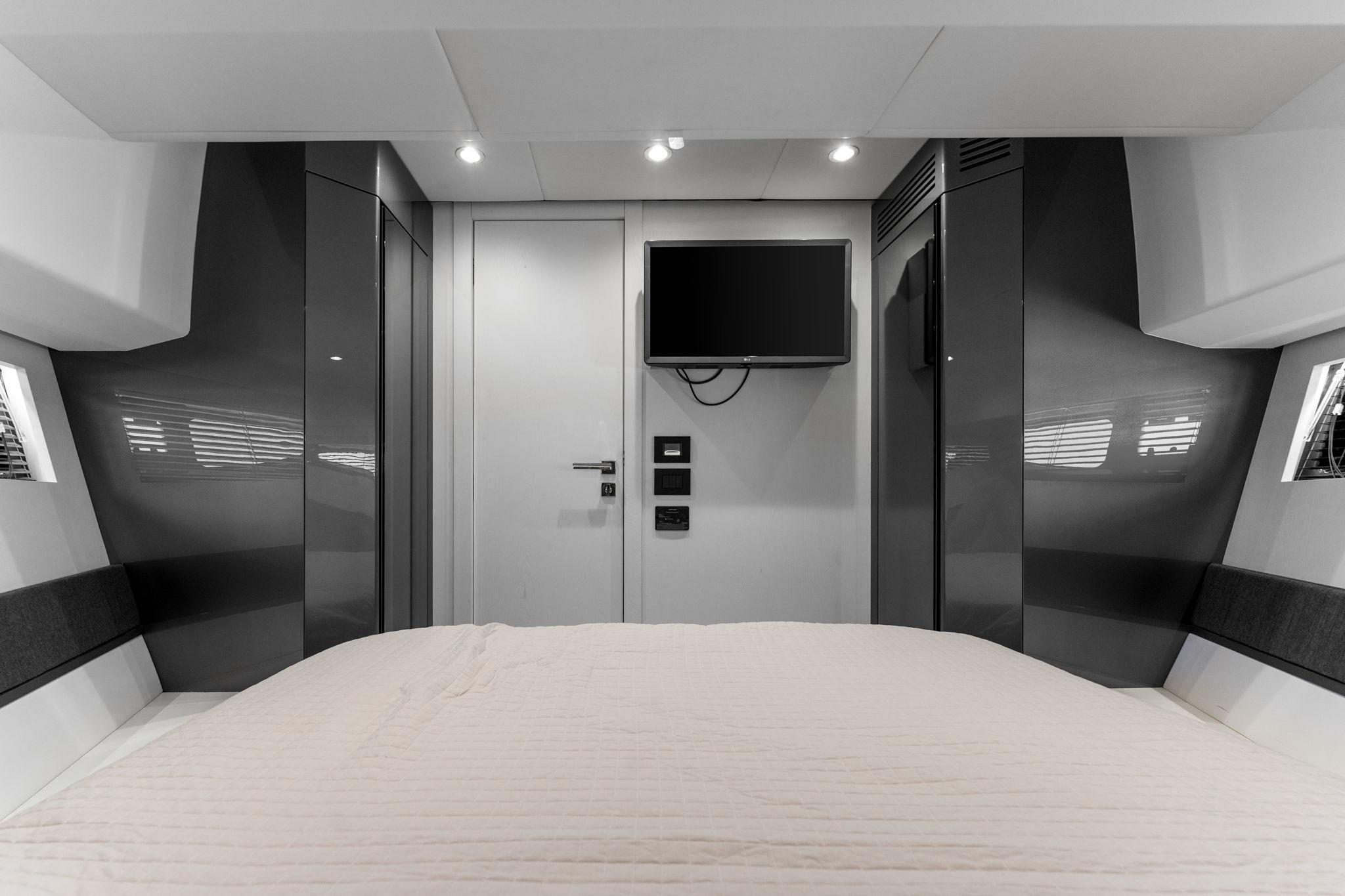 Forward master with queen berth, full-beam salon, modern galley, oversized windows, and skylights for abundant natural light.