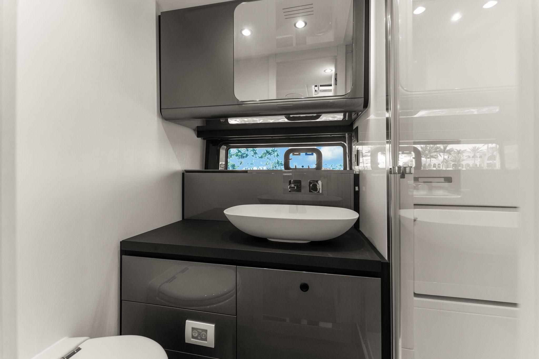 Guest head features full-size shower, modern vanity, designer finishes, and ventilation.