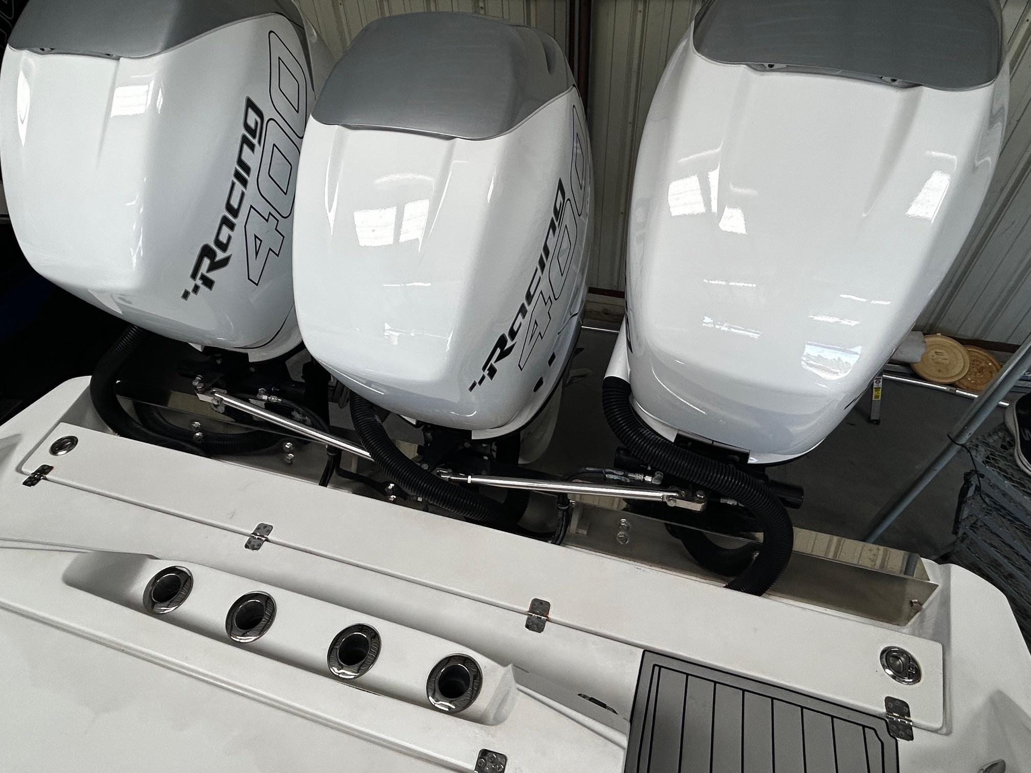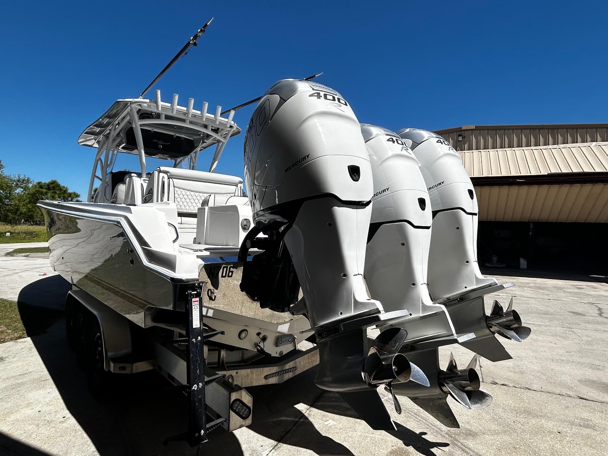 Price Reduced!2016 390 Sport with new updates and upgrades.Triple Mercury Racing Verado 400 R, DTS Throttles, Mercury Smart Craft System View 7, K-Planes, NEW Dual Garmin 16" GPS , 24" Garmin Radar, Auto Pilot, Garmin VHF, Spot Light, Upgraded JL Marine Sound System with a Fusion Head Unit, Bow Thruster, Marine Head, Fresh Water System, Battery Charger, Windlass, Bow Thruster, Frigid Rigid Cooler, LED Overhead & Cockpit Lightning, Underwater LED Light, Full Fishing Package with Live Well, Taco Outriggers, Rod Rack, Side Vu Sonar, etc. New Upholstery with Diamond Quilting, Second Row Seating, Forward-Facing Bow Seat Back Rests, Sea Dek Flooring. .Please call for details.... TRAILER SHOWN IS NOT INCLUDED.