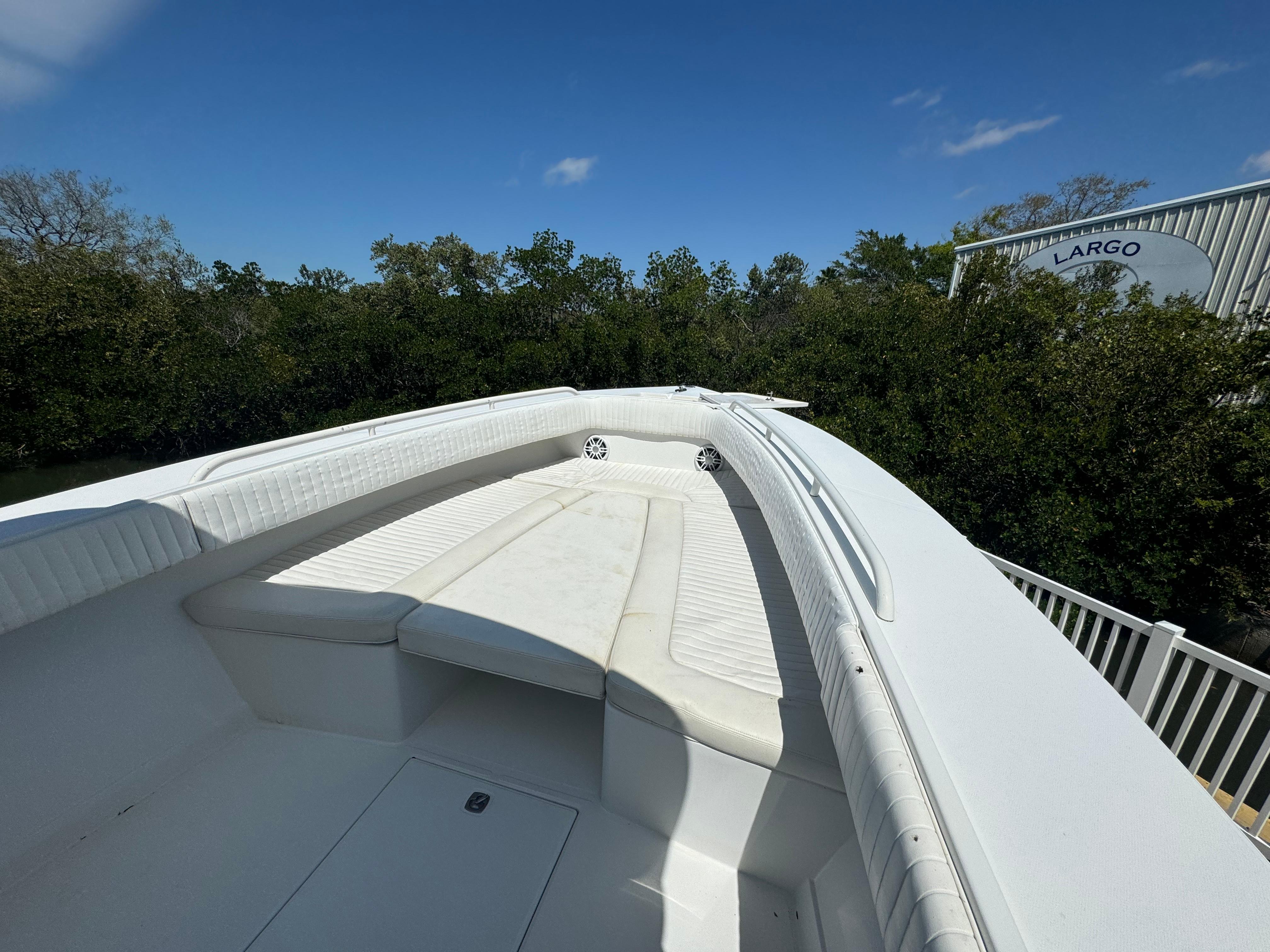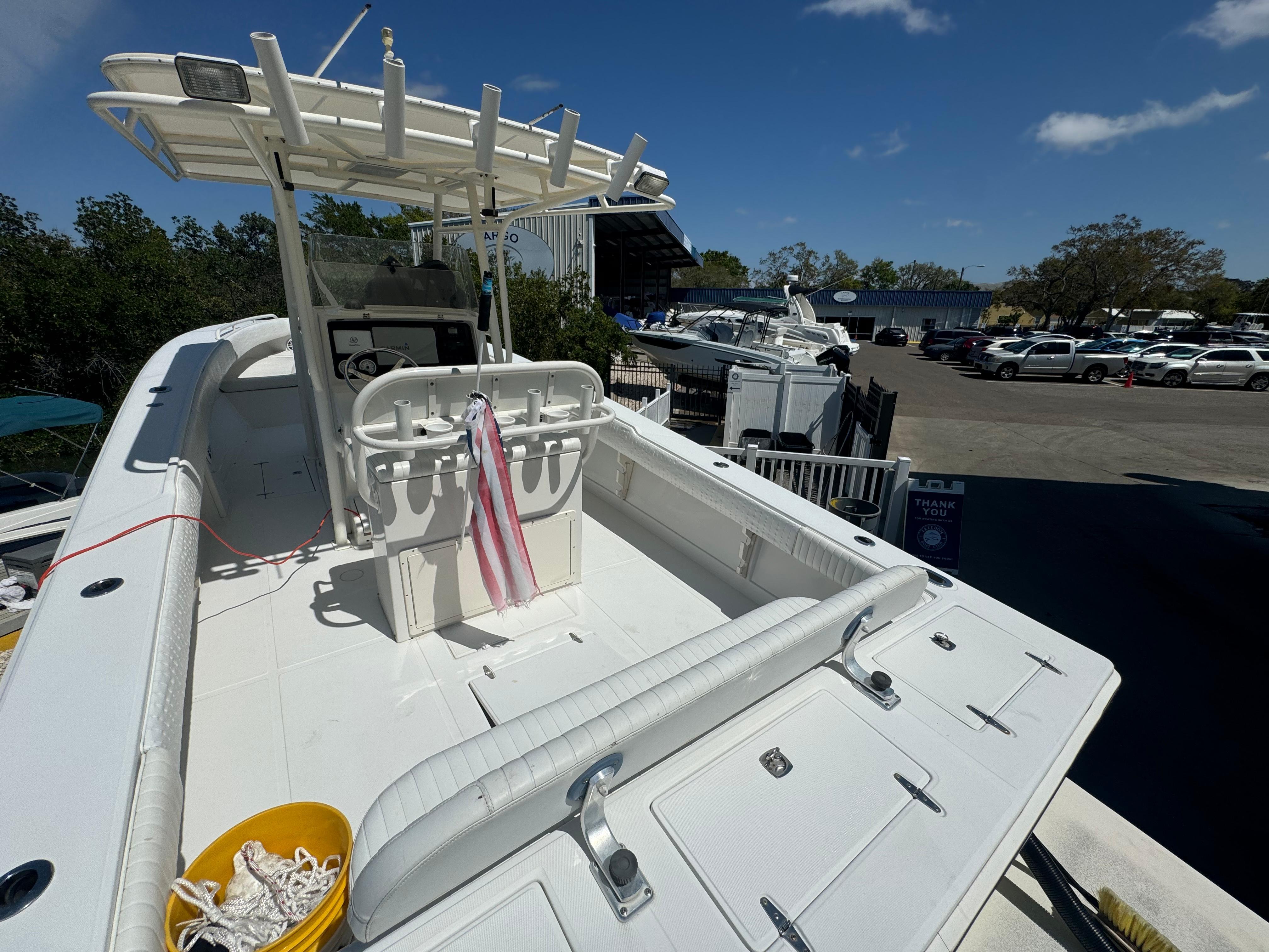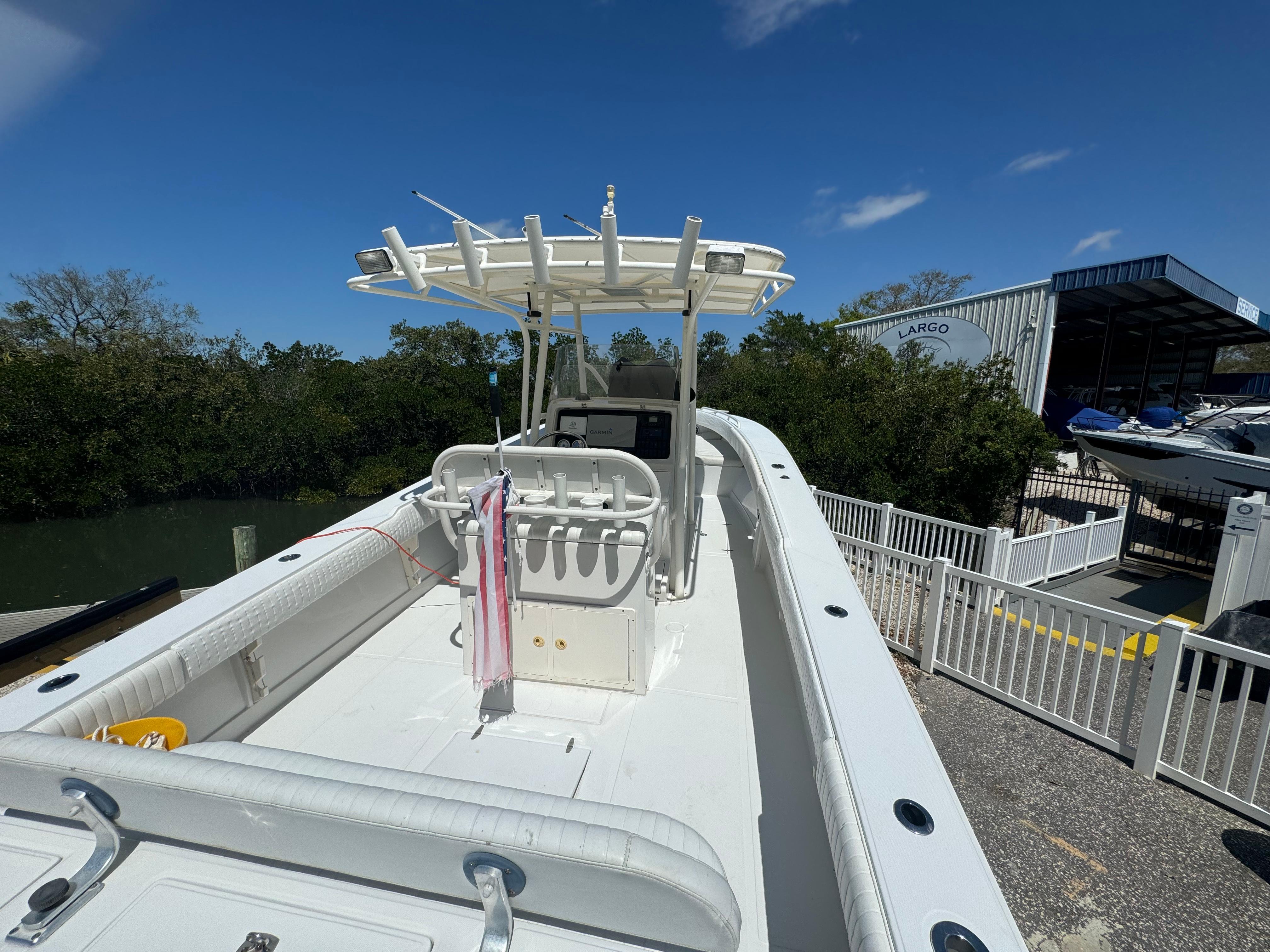Features: Transom rigging station with sink; transom livewell; lockable rod storage; fresh/raw water washdowns; roomy walk-in console with marine head and sink/shower; in-deck fish boxes; leaning post with rod holders; in-deck dry storage; cockpit bolsters; anchor locker; trim tabs. Tons of factory options were available.