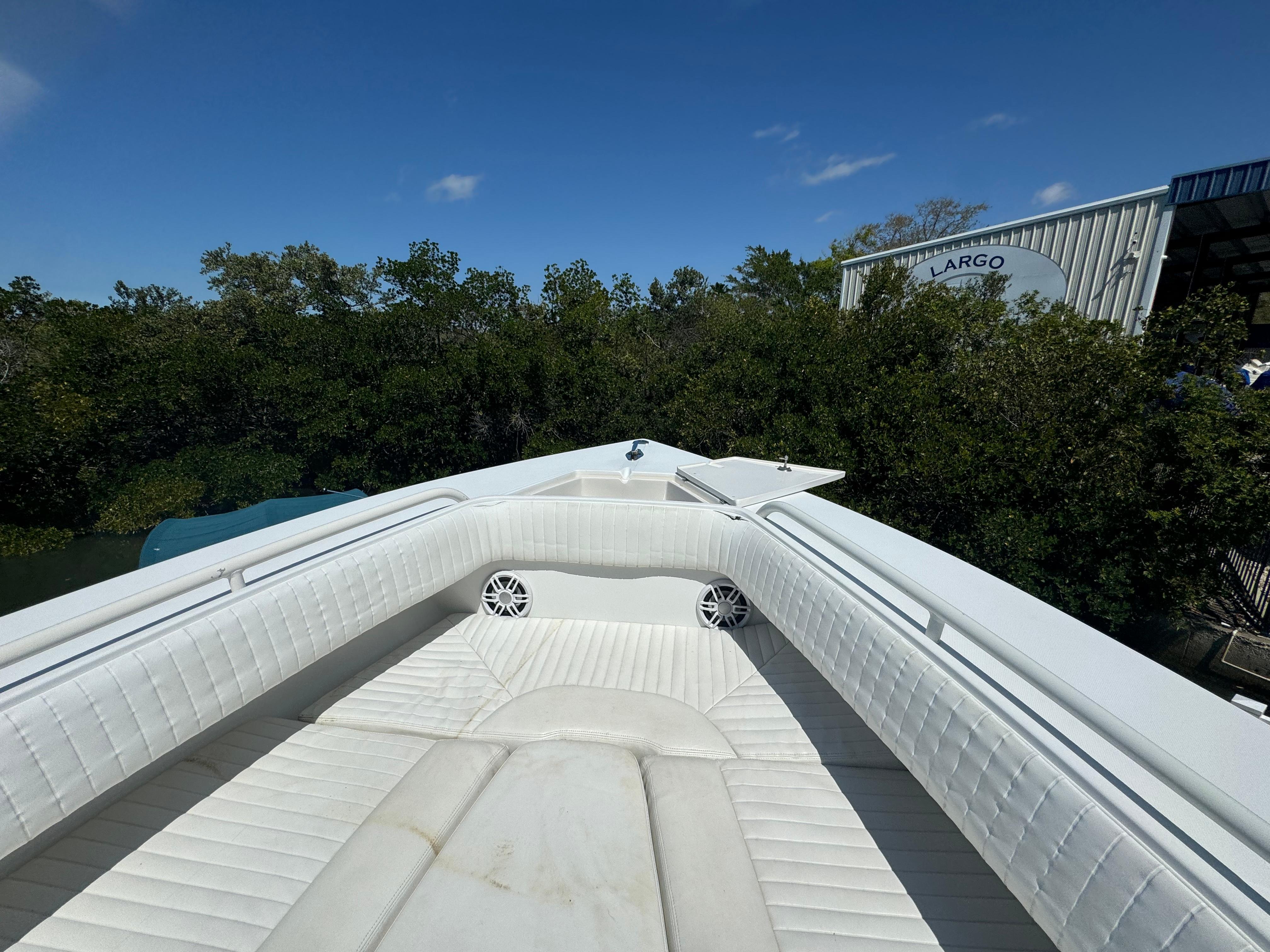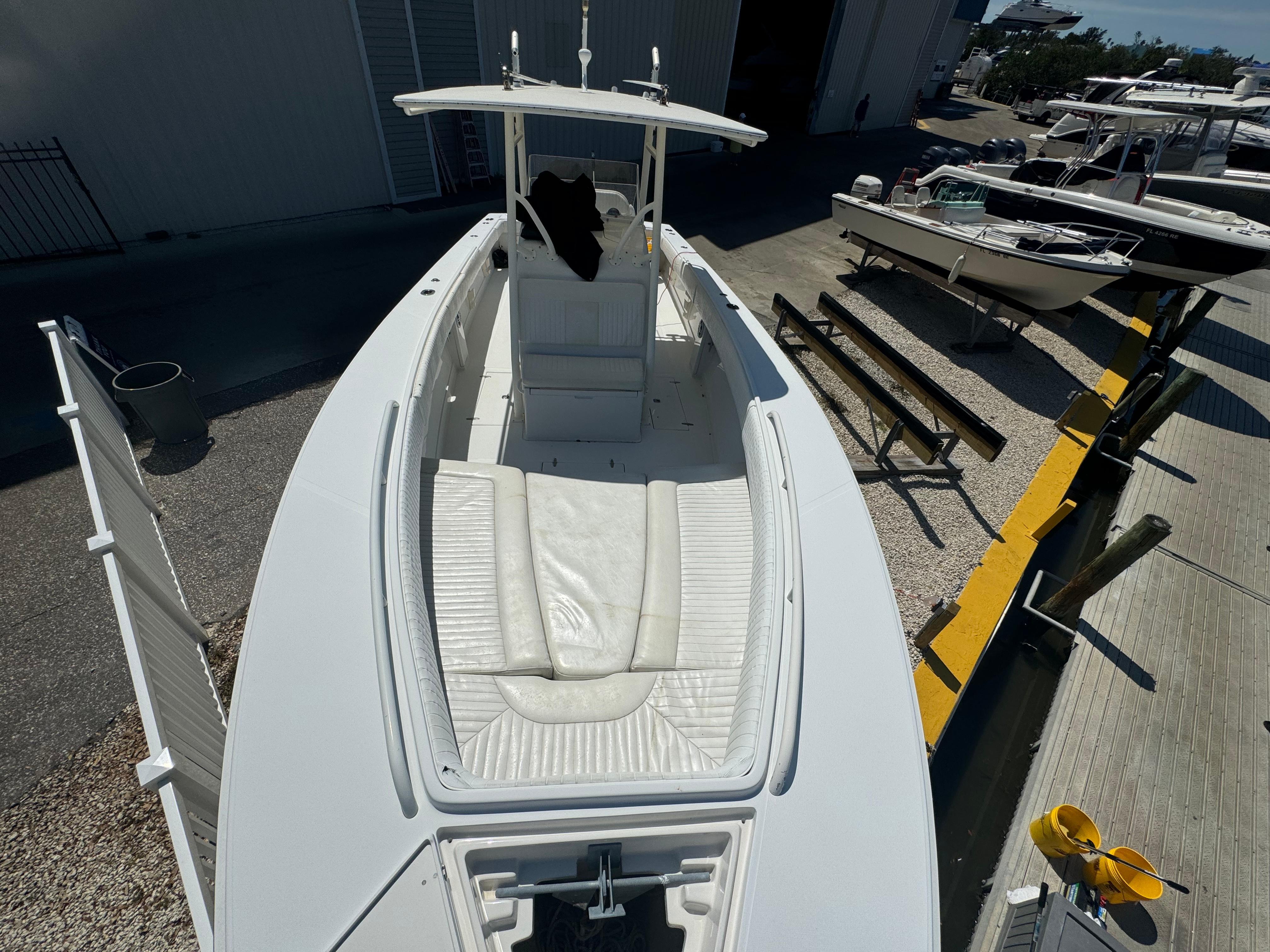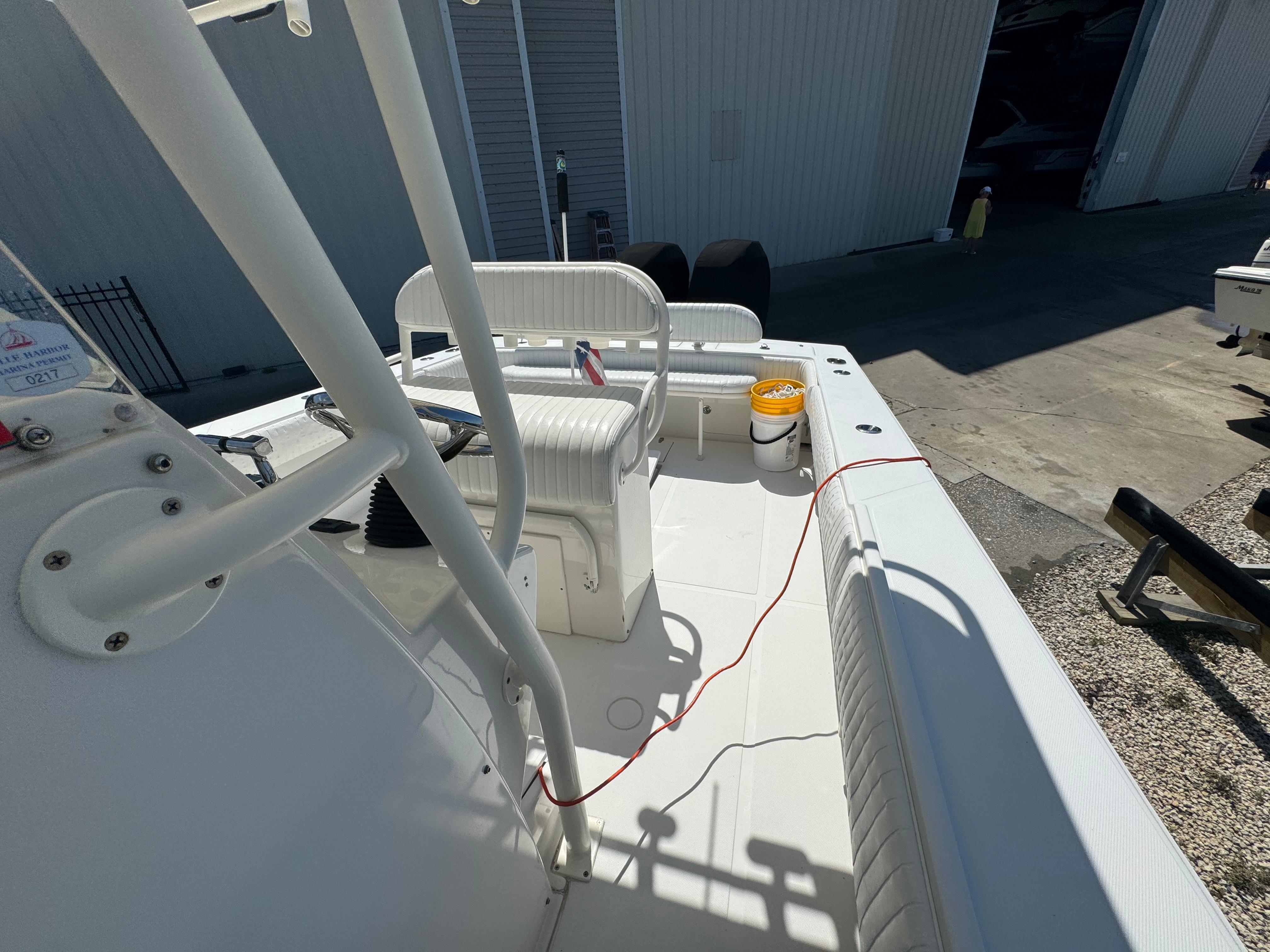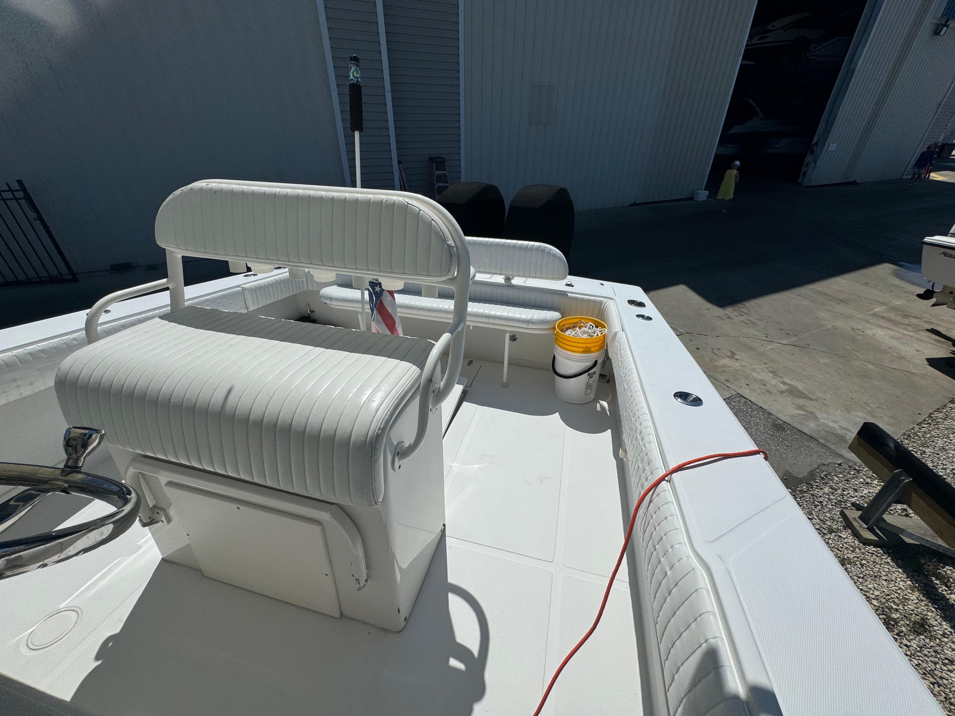 Features: Transom rigging station with sink; transom livewell; lockable rod storage; fresh/raw water washdowns; roomy walk-in console with marine head and sink/shower; in-deck fish boxes; leaning post with rod holders; in-deck dry storage; cockpit bolsters; anchor locker; trim tabs. Tons of factory options were available.