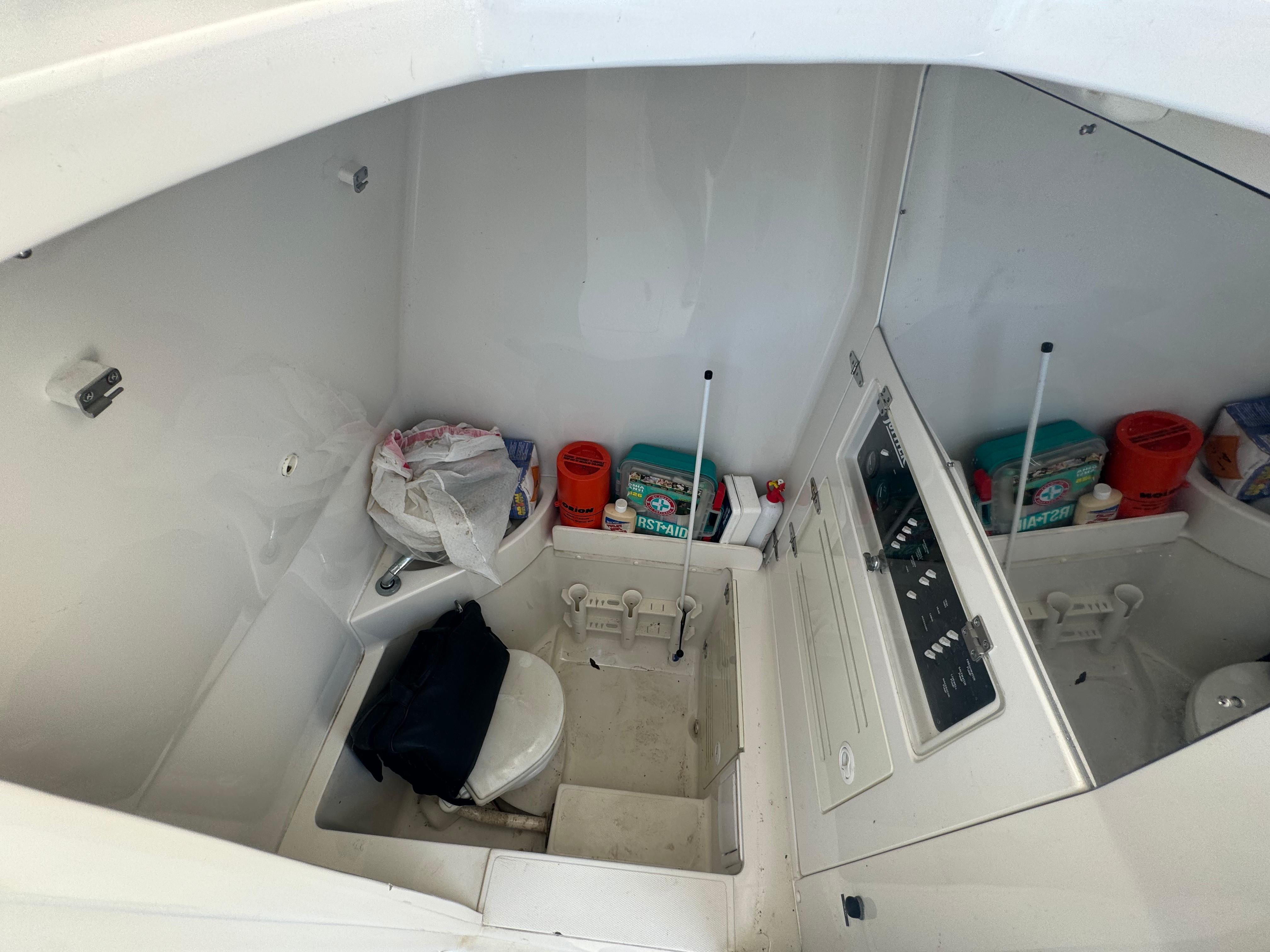 - roomy walk-in console with marine head and sink/shower