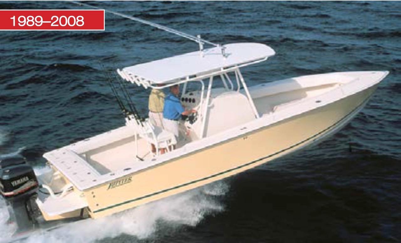 A hugely popular boat, the Jupiter 31 has ranked among the best boats in her class for many years. She was available in three configurations: open fisherman (pictured), cuddy cabin, and the popular forward seating model introduced in 2003. Originally a semi-custom boat, the 31 is built on a high-performance deep-V hull with moderate beam, cored hullsides, and a solid fiberglass bottom. No wood is used in the construction, and the bottom has a keel pad from the stern forward for extra lift. The outboard bracket was beefed up in 2003 to handle today?s high-horsepower 4-stroke engines.