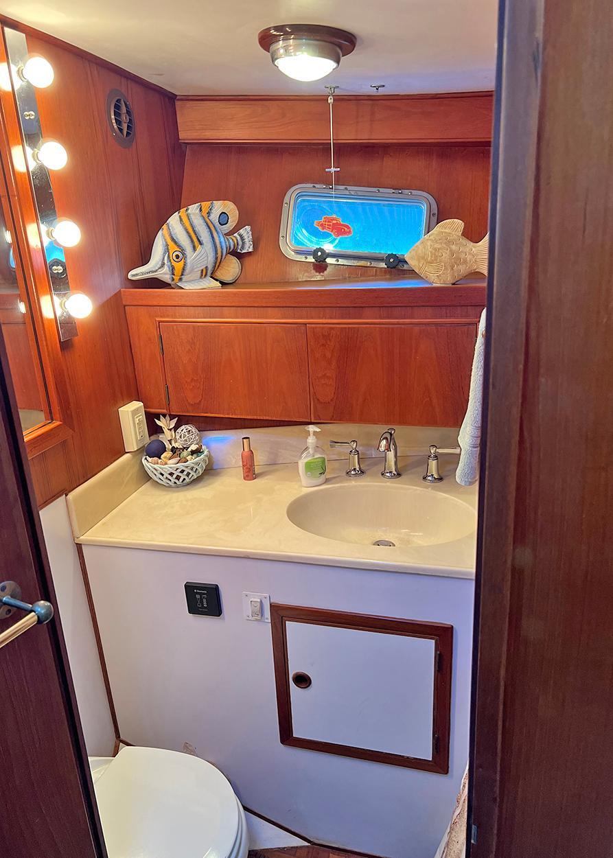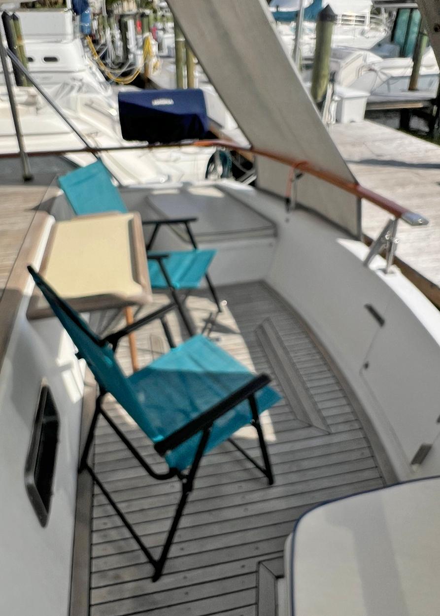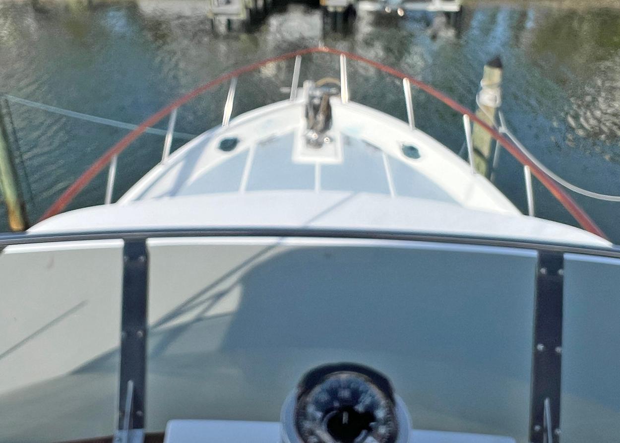 At the main deck level step inside through any of the three access doors into the main salon. Light, open, modern and sleek yet bathed in solid wood surfaces. The floors are teak, the table is a stunning burl wood, and the galley counter is granite. The L-shaped settee is in Ultraleather. There are shades and wall sconces. The Stidd captain's chair is forward to starboard with excellent visibility and deck access. The instrument suite is impressive with full instrumentation at both helms. Stepping forward is the forward stateroom with 8' headroom, twin berths,and a large cedar lined hanging locker to starboard. There is excellent ventilation thru the 4 opening ports and overhead hatch. The doorway to the engine room is aft. Across the hall is the head with stall shower.