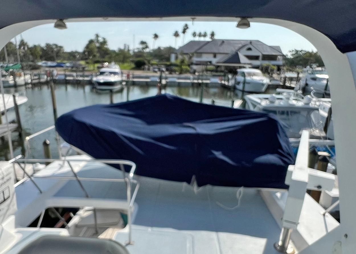 Board through either port or starboard side gate or at the transom door. The varnished rails and teak decks will be evident as are the wide and covered decks. The covered aft deck cabin area provides a delightful seating and lounge area with a platform for the toys aboard. There is a comfortable flybridge access here which is protected, easy and includes numerous handholds. This area is covered by a bimini forward of the radar arch. There is bench seating facing forward and room for additional deck chairs. The Zodiac is stored in this area when not deployed by the davit