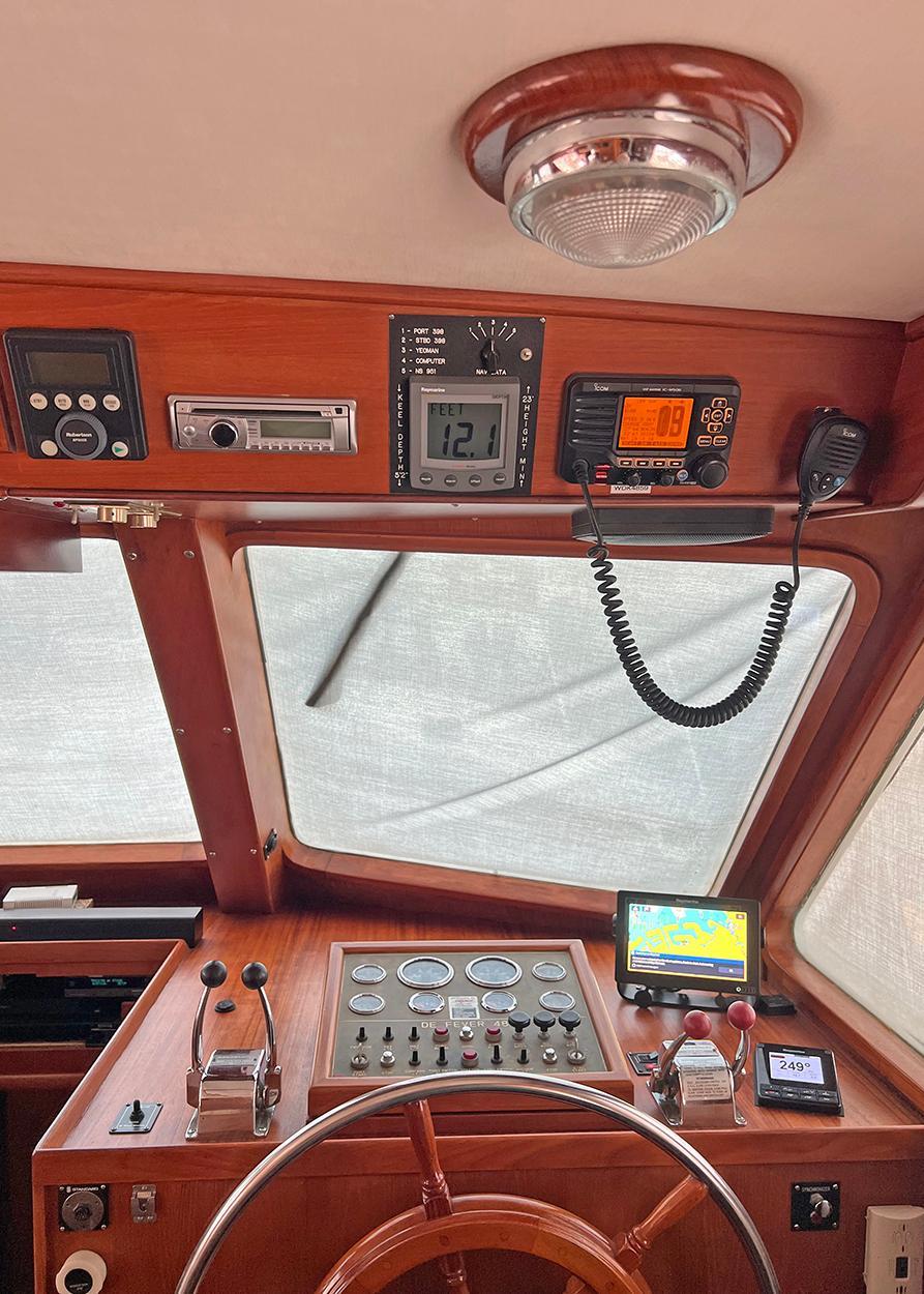 All new helm panels at lower and FB helm stations are equipped with full gauges at each. These include at each helm twin engine oil temp and pressure and transmission oil temp and pressure gauges.