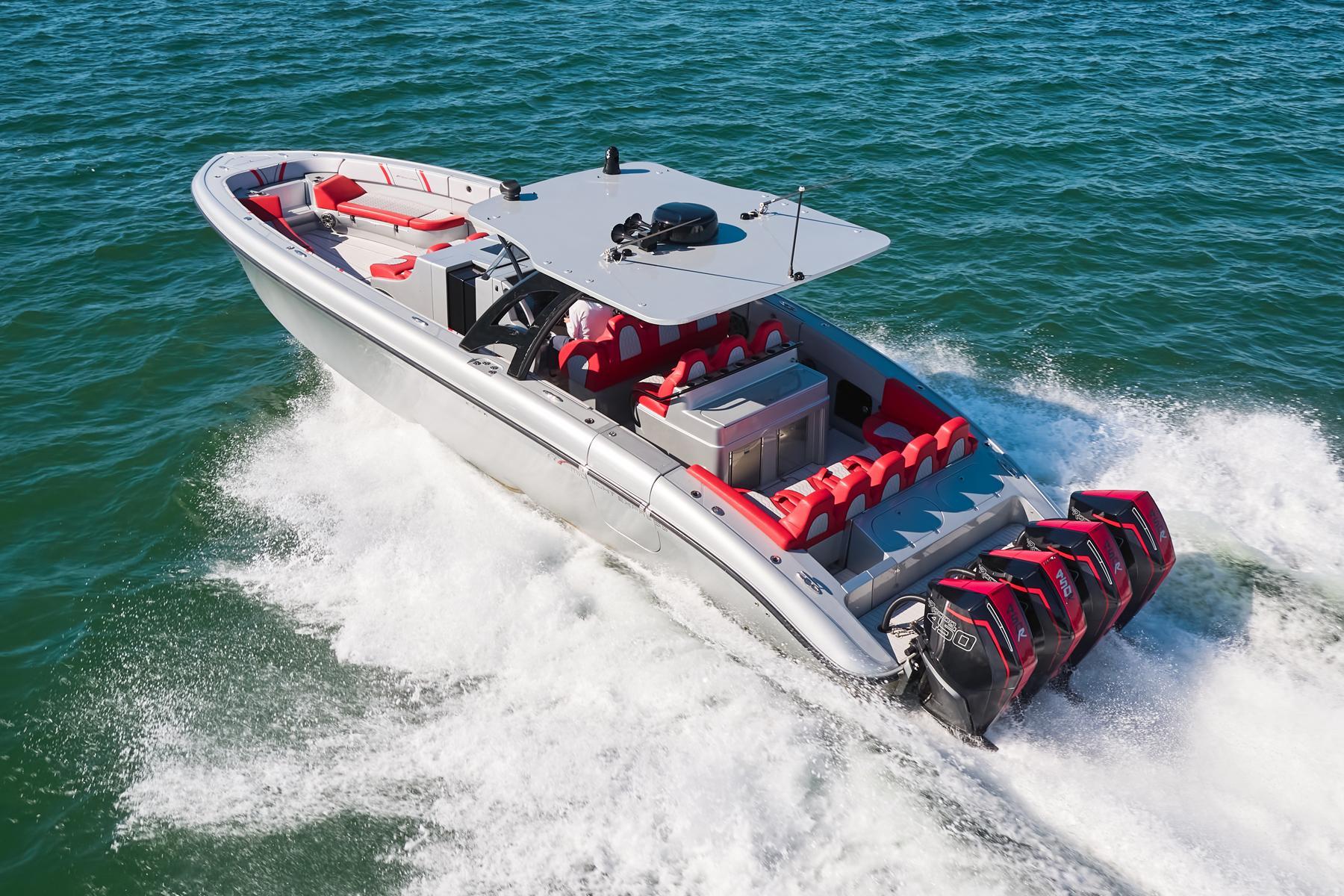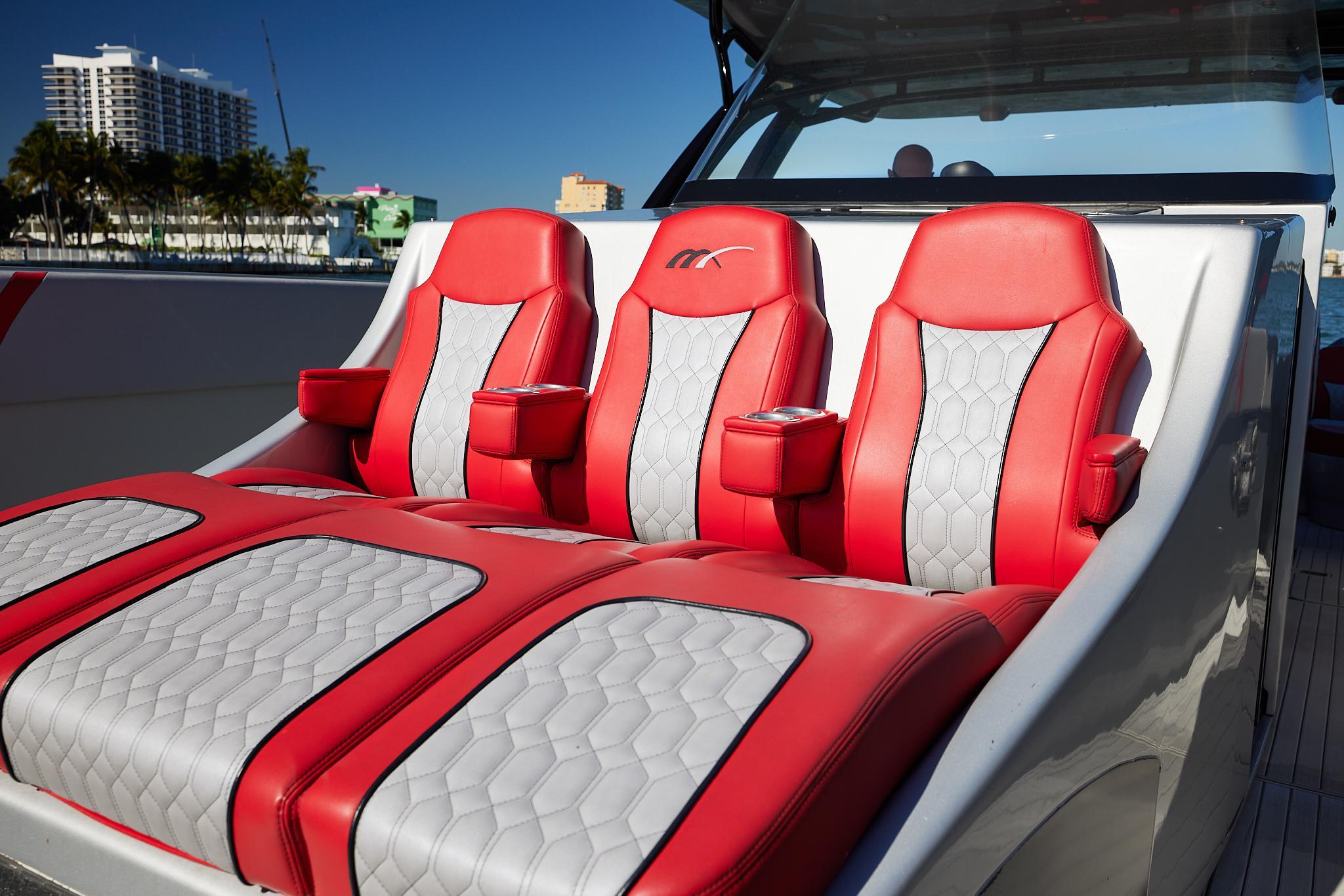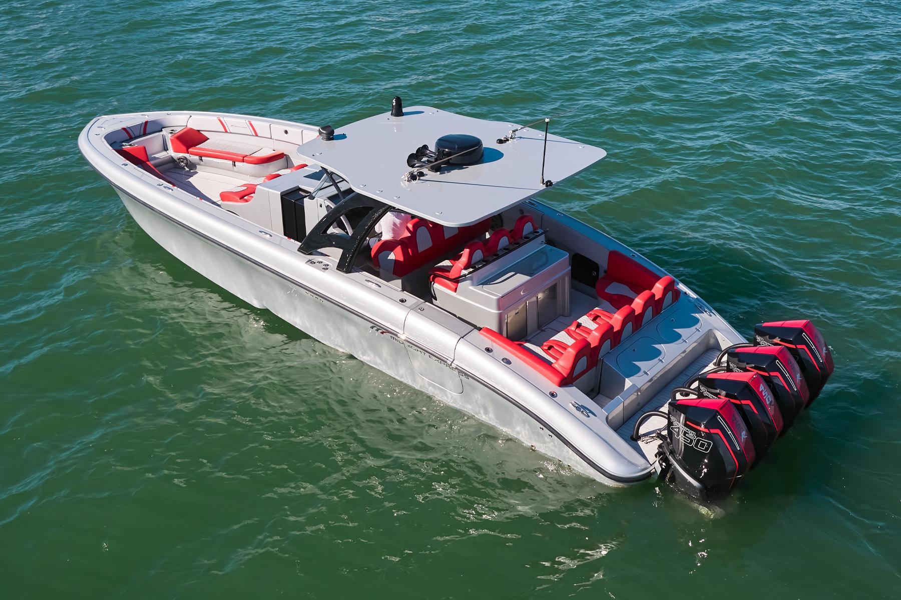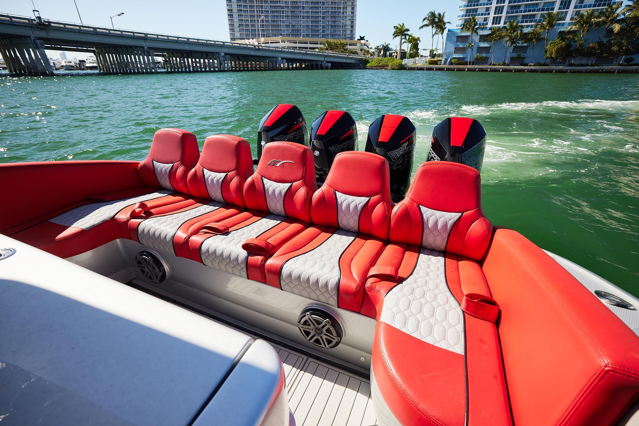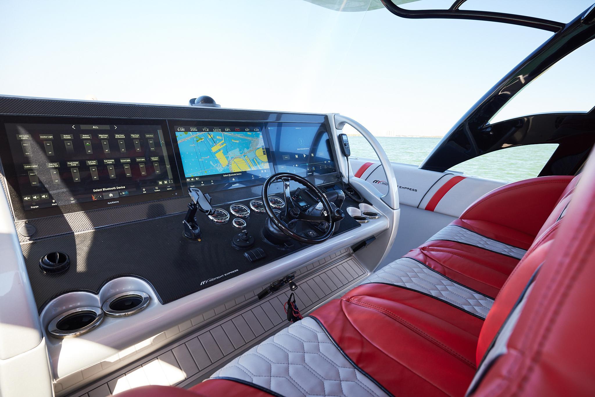 CUSTOM OPTIONS INCLUDE2017 43' Open Midnight Express with quad Mercury Racing 450R's motorsHull and Top optionsPainted all antennas on hard top to match boatPainted HullsidePainted Hull BottomPainted Deck (Rubrail to Floor, Including hatch openings on Deck)Painted all Small Parts including HardtopAdditional 150 Gallons of FuelInsulated 2 Rear Livewells behind rear seatGlass WindshieldSeakeeper 6Upgraded Upholstery (Headrests, Cross-stitch)Foam decking throughout Cockpit, Console and Transom WellSeatingAft-U-Lounge aft seat w\ storage and fiberglass baseForward-Forward Stylized Fiberglass U-seatElectric fiberglass table to convert into sunpad and drop flush into the floorHelmUpgrade to electric adjustment on seating (per row)2 - Refrigerator to aft of second helm seatMisc. Options \ ElectronicsQuick Anchor windlass system w\ 300' line, 10' galvanized chain and 33lb polished stainless steel anchor, and custom polished stainless steel anchor roller system and remote mounted on dashSpeed Controllable 80KG Bow thruster mounted with rocker switch control mounted on dash110V Distribution Panel6000 BTU Reverse Cycle Air CondPanda 5KW Diesel Generator with Additional Diesel Fuel Tank406 MHz EPIRB mounted on top of arch w\ hydrostatic releaseElectronicsGARMIN GPS OPTIONS-3 - Garmin 8622 Chartplotter Flush MountedSPREAD SPECTRUM CHRIP Depthsounder for Garmin Chartplotter with GSD26 and 2k ducer (in hull)GMI 20 Garmin Depth Sounder Screen4kw HD Dome Radar for Garmin ChartplotterGarmin AutoPilot GHP20 with smart pumpAIS 600FLIRSatelite weather GXM51 to GPSOTHER ELECTRONICSLED spotlight mounted on top with remote point pad on dashPremium JL sound system with 14 speakers (8.8”) in cockpit, (6) 12" sub woofers, MP3 Player Dock, 6 amplifiers, and 2 speakers in cabinHornblaster Outlaw 232LED cup holdersLED Under water lights