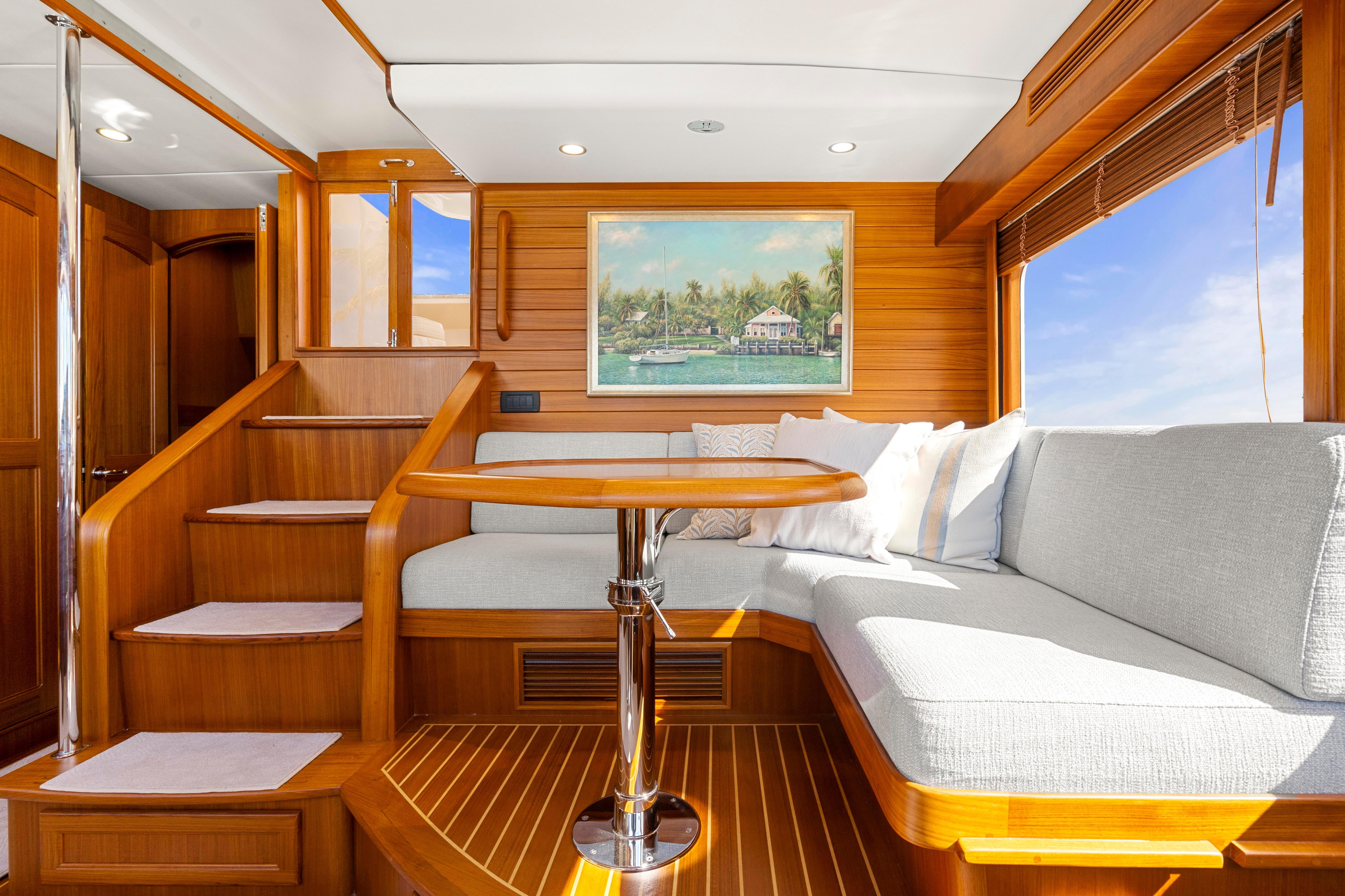 Visibility forward and to port and starboard is excellent, and the two sliding doors at either side open to the wide side decks. The traditional teak and holly sole is standard with fitted carpeting on top. To aft port is a raised corner settee and teak table which provides an excellent view while underway. To starboard of the pilothouse console are the steps leading down to the accommodations. At the aft starboard corner of the pilothouse is the day head. A Stidd helm chair and a large stainless steel teak-accented destroyer wheel completes the pilothouse of this ultimate cruising yacht.