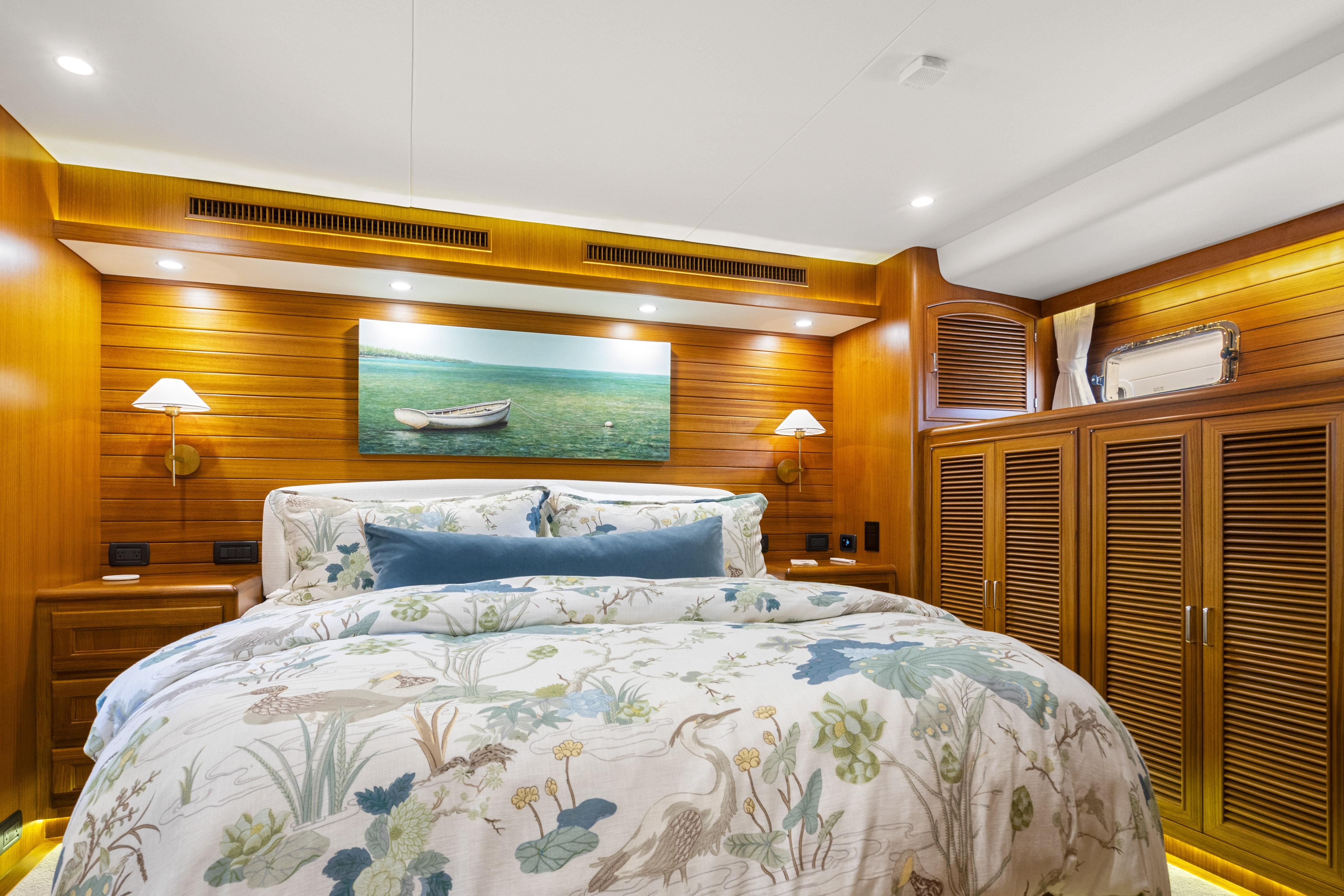 The mid-ship master stateroom takes advantage of the 18’8” beam and features a queen-sized island berth (with HMC mattress) that allows access from either side. The master berth can lift hydraulically to access expansive storage and a safe beneath while two nightstands are positioned at each side. A large bureau, with hanging lockers and drawers, resides to port and the stateroom’s en-suite head is located to starboard, along with a full-length mirror. At the forward wall is a mounted 32” HD TV, the cabin’s access to the central accommodations lobby, and a additional hanging locker with drawers below.