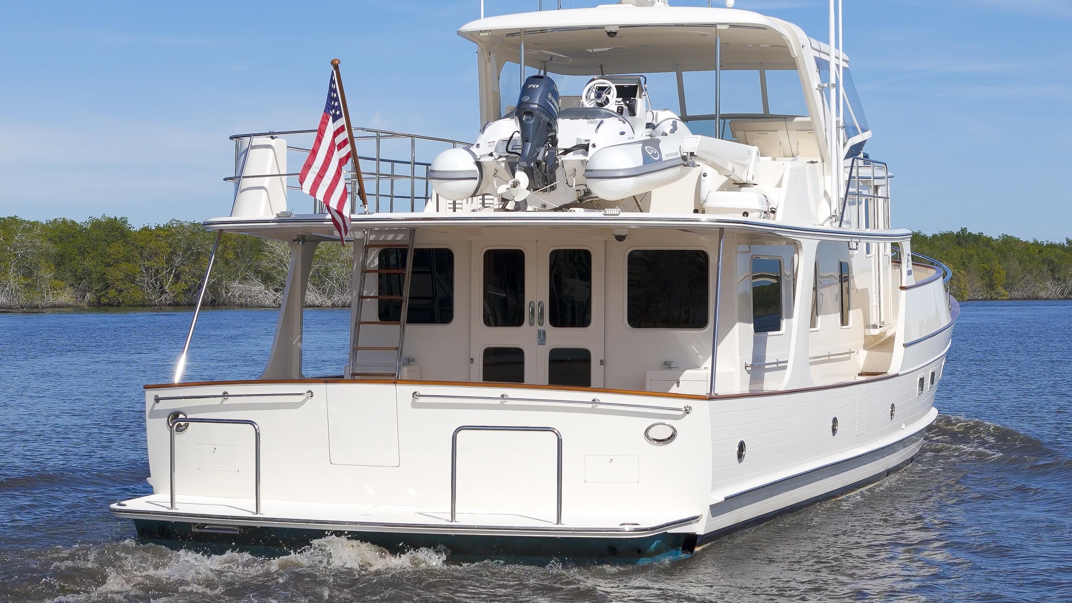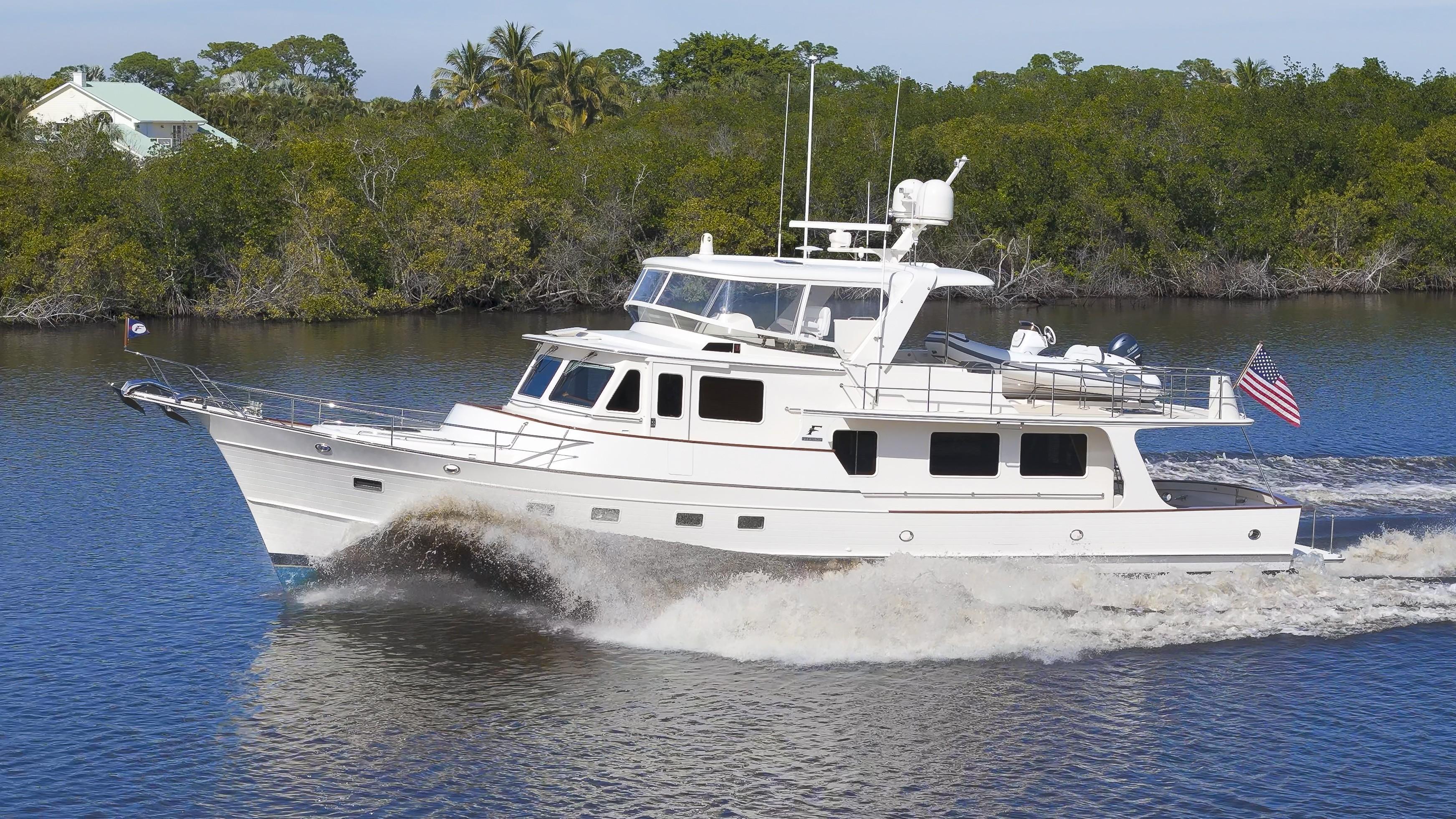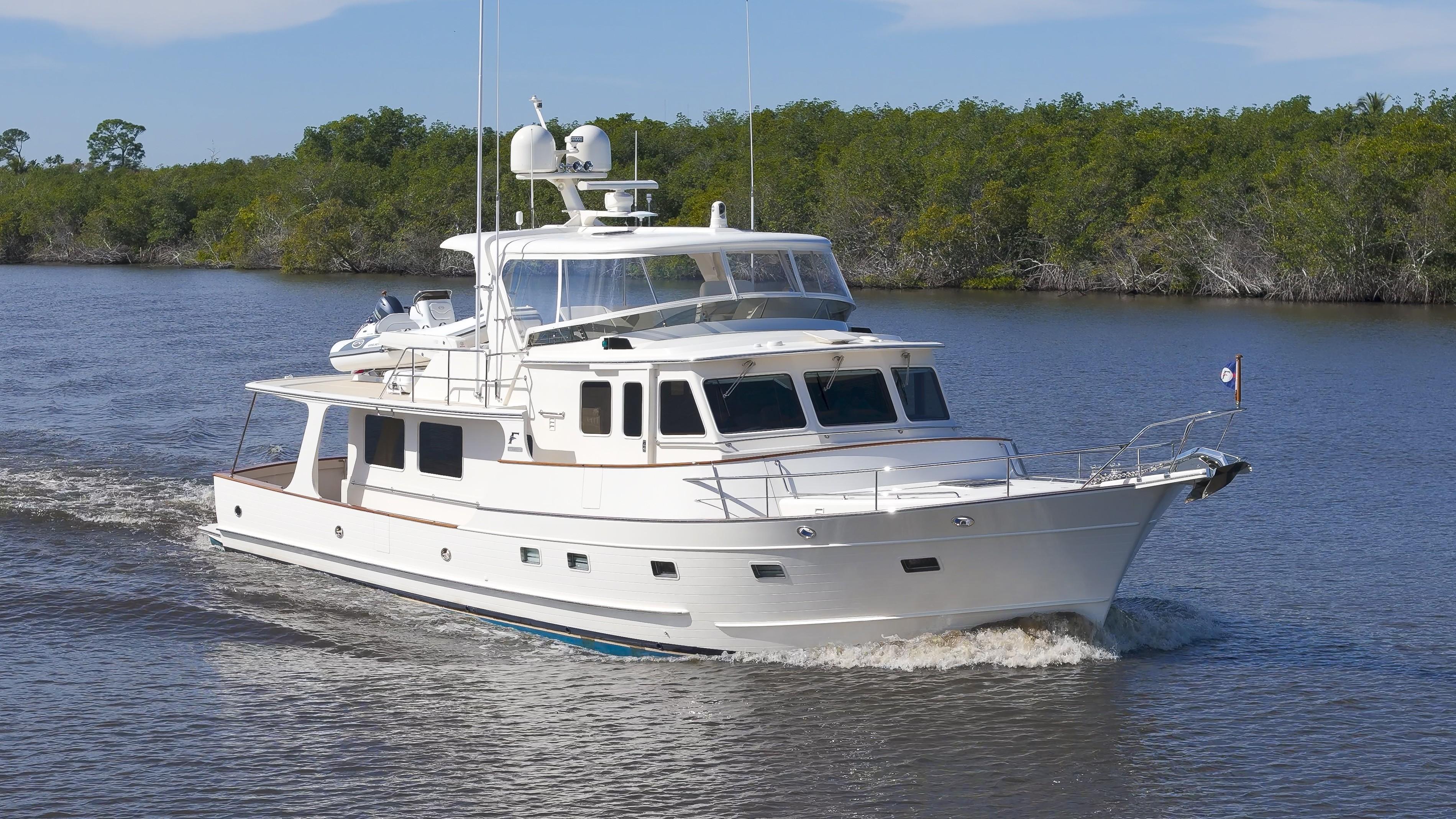 A nearly new mid-ship master layout Fleming 65 equipped with twin MAN V8-1000 engines at 1000 hp each and two Onan generators. Features include: fully ceramic coated exterior, Lithium Ion batteries, Humphree stabilizers with Zero Speed stabilization at rest, Twin Disc transmissions & engine controls, Twin Disc proportional hydraulic bow & stern thrusters, Twin Disc EPS (Express Positioning System) & EJS controls (Express Joystick System), Aqua-Drive system, pilothouse day head, Furuno TZTouch3 navigation electronics, Starlink satellite Wi-Fi, FLIR thermal camera, FCI watermaker, fiberglass hardtop with a partial forward flybridge enclosure, and a 14’ Walker Bay tender with a 70hp Yamaha outboard. Interior accommodations include 3 staterooms with 2 heads: bunks at the port guest cabin, a forward VIP stateroom with a queen berth, and a en-suite mid-ship master stateroom with an island queen berth.