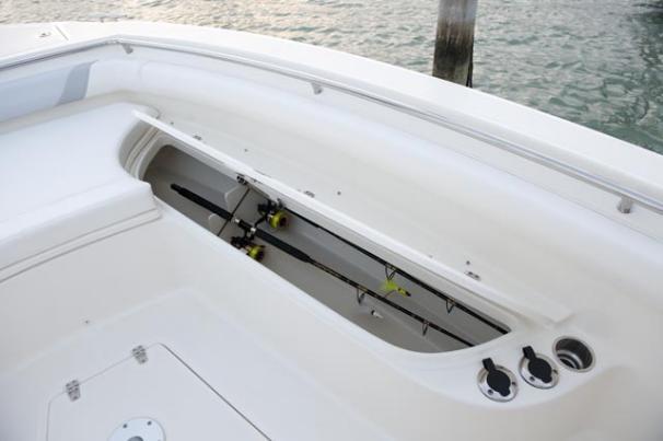 - Lockable forward rod storage (port and starboard, 3 rods each)