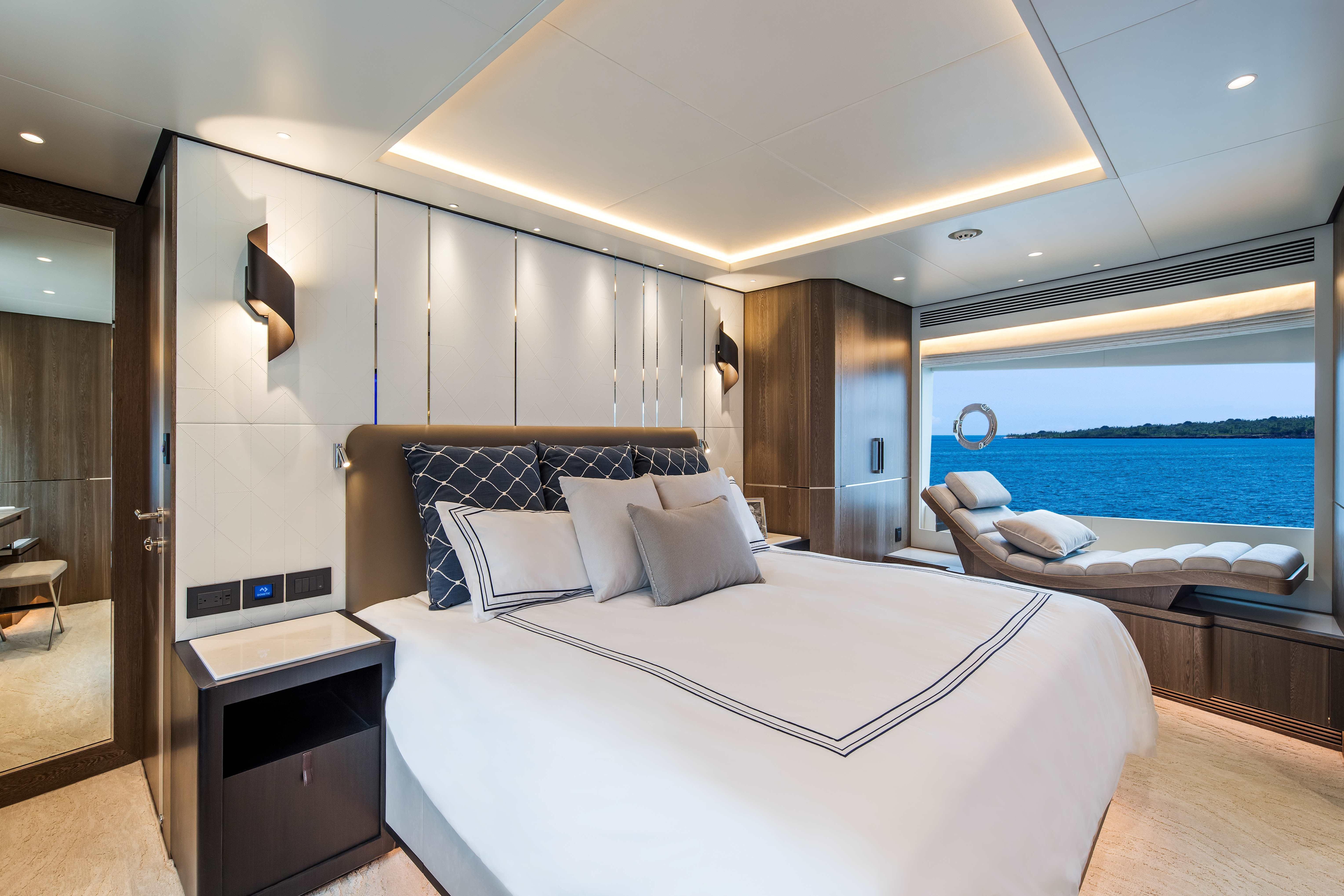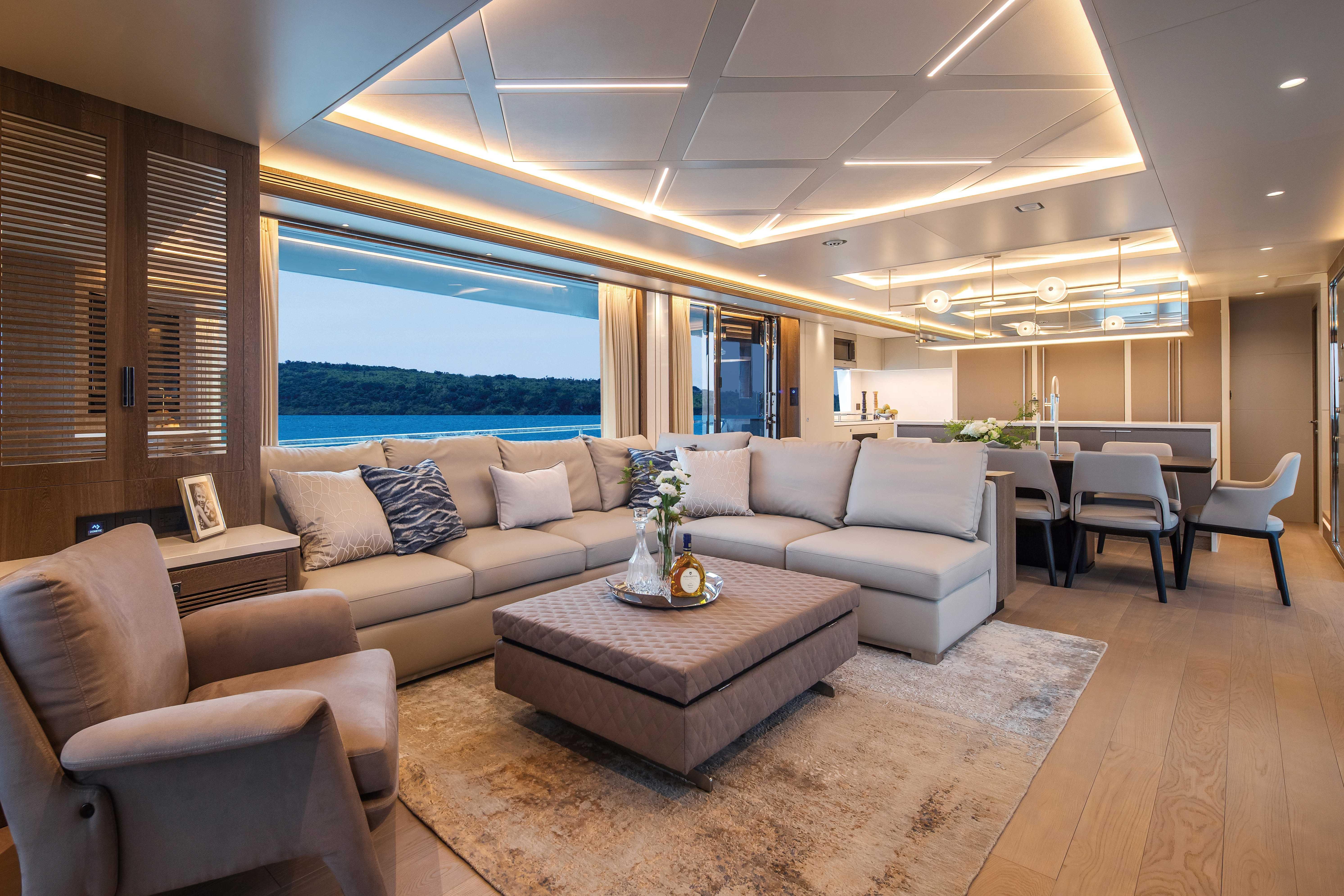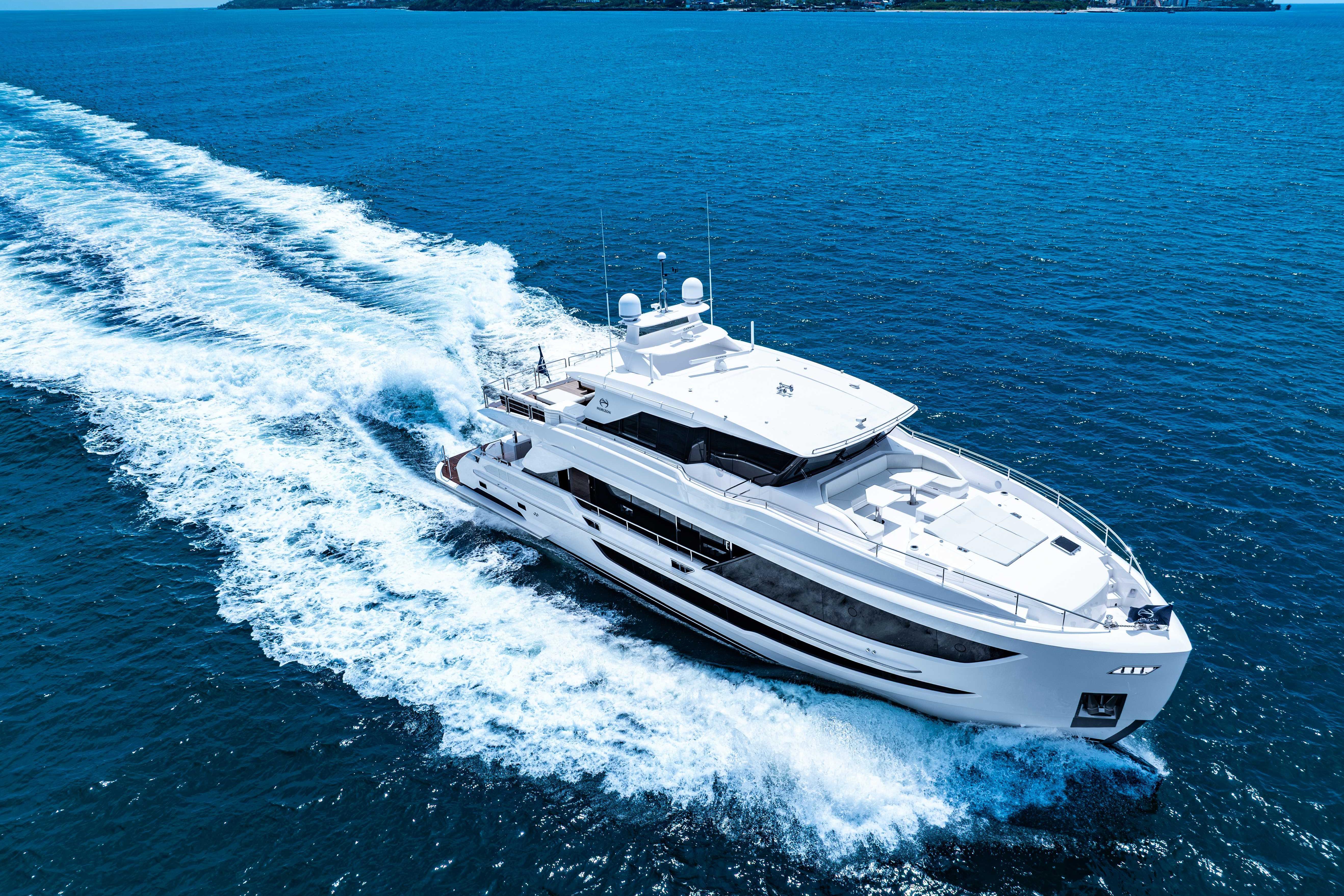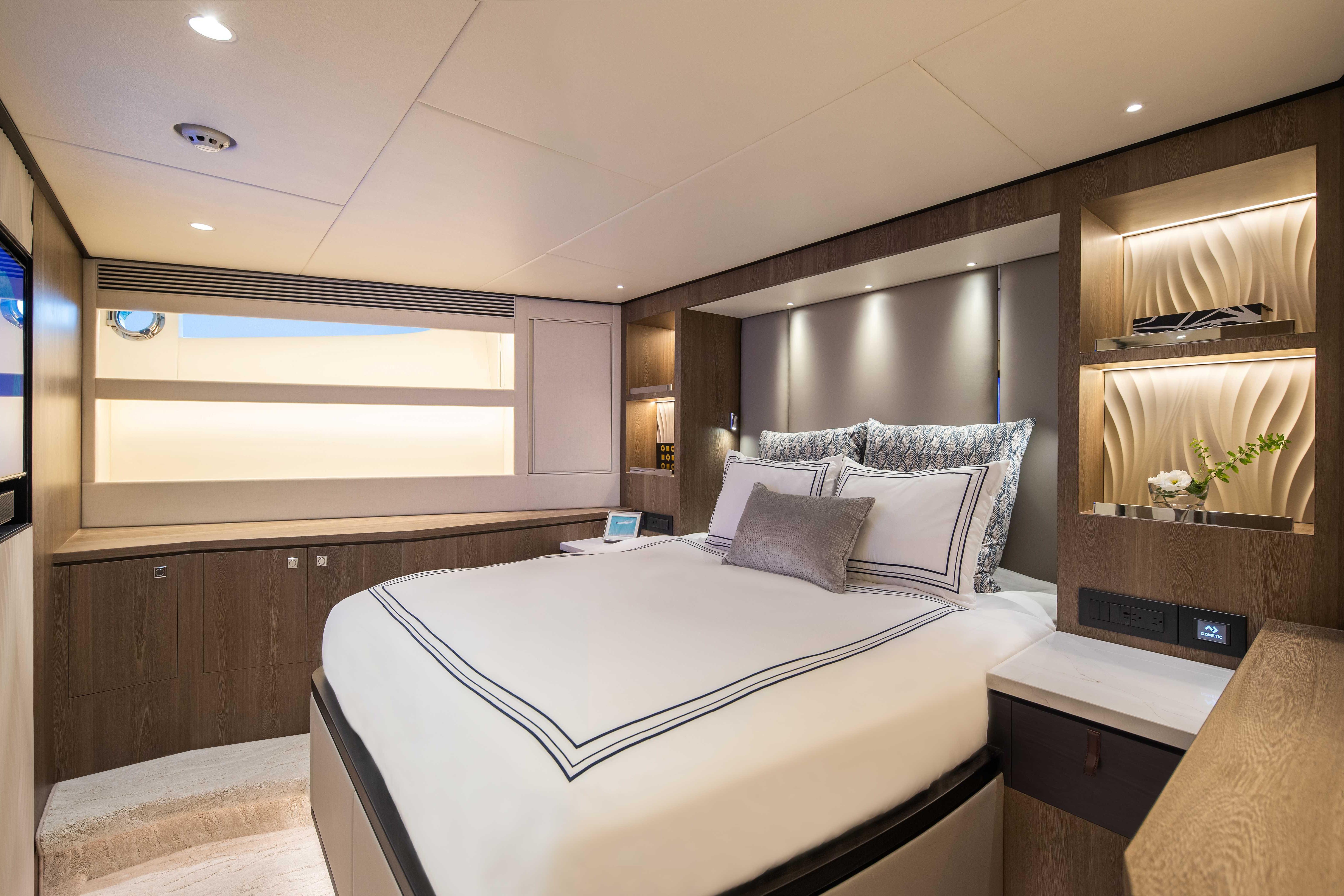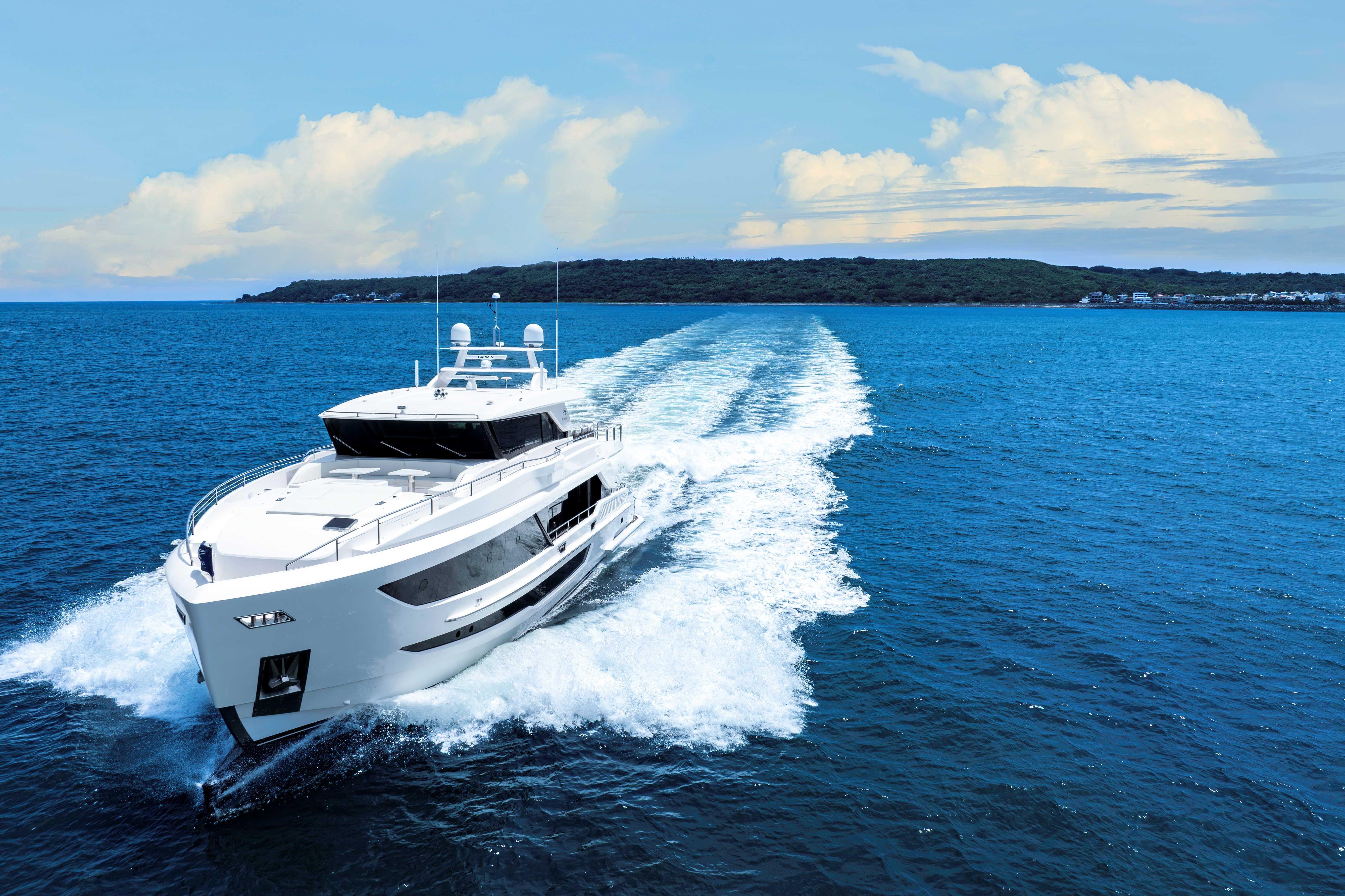 Horizon FD90 Split-Use SkyloungeThe most popular model in the acclaimed FD Series, the FD90 embodies the space, layout, and performance that define the Fast Displacement range. The FD90 features an expansive 23’ 3” beam, spacious on-deck Master with four guest staterooms, a convertible laundry room, all ensuite and two crew cabins below deck, and large windows in the salon. Fitted throughout with ingenious amenities and endless options for customization, the FD90 is quickly becoming one of the world’s most sought-after mid-range motor yachts.