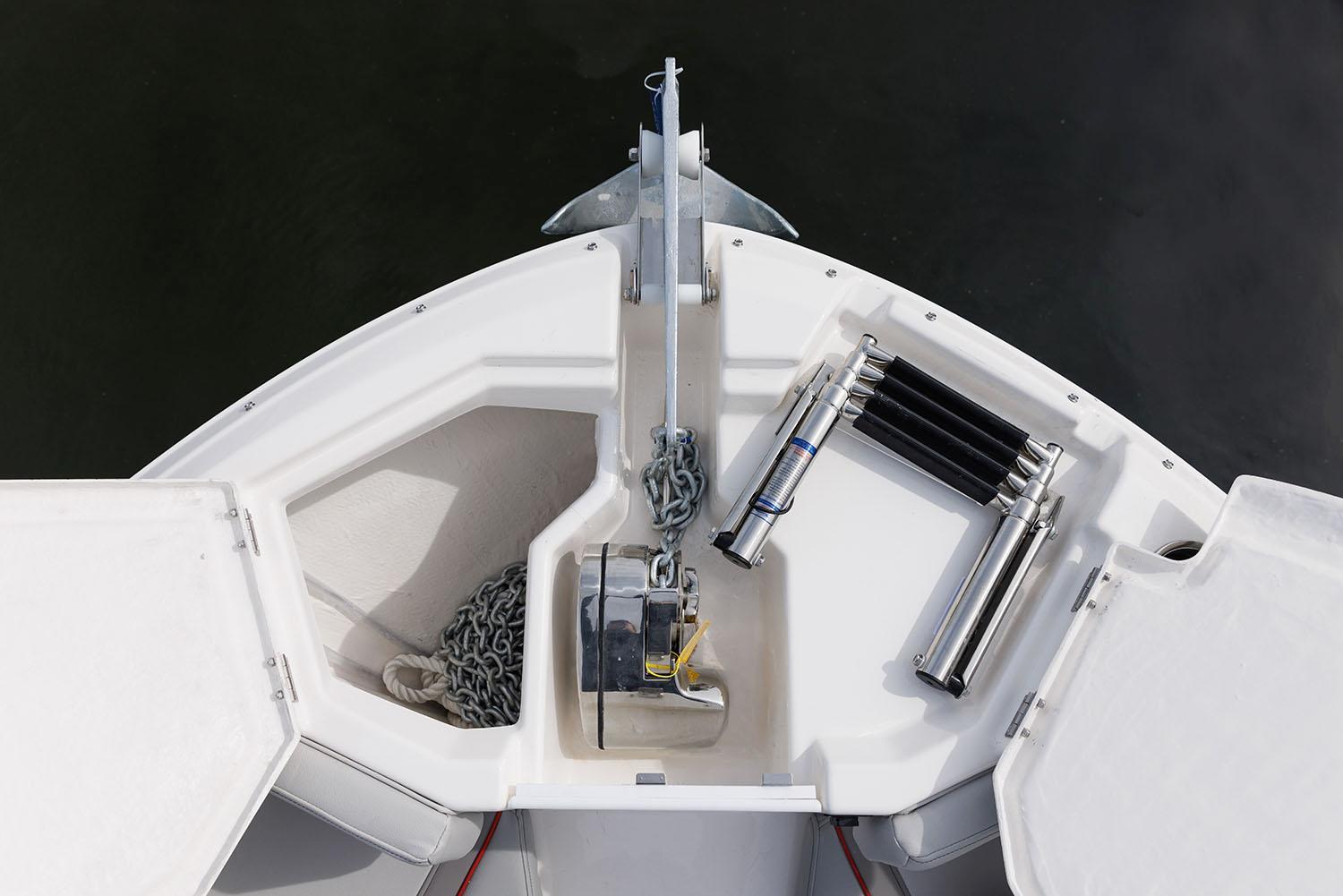 In the cockpit, it’s an angler’s paradise. With 6 rod holders topping the gunwale, 8 rocket launchers, flood lighting, EVA traction decking and a large livewell, you’ll be ready for any fight. Pop-up cleats retract for a snag-free cockpit. Below deck you’ll find a built-in fish box and additional storage in the lazarette. The self-bailing deck and raw water washdown make cleanup a simple task.