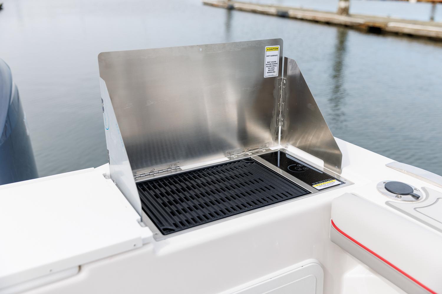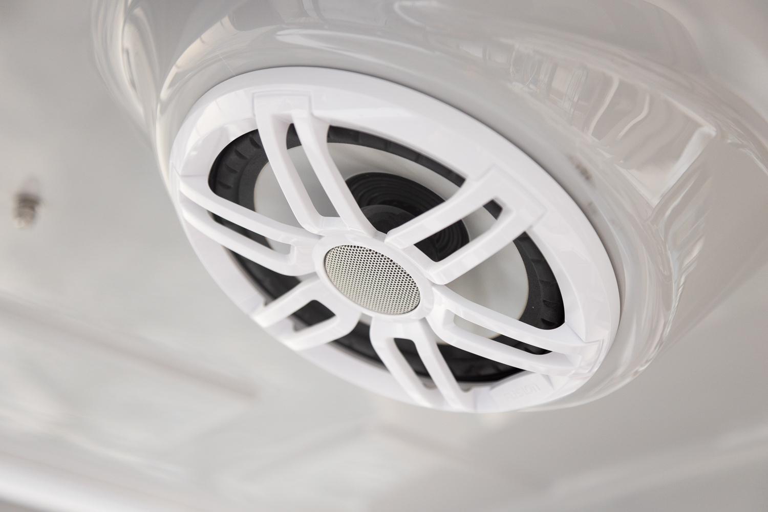 The cabin is a comfortable escape from the elements. Air conditioning and reverse cycle heating allow you to keep the interior at the perfect temperature. The large V-berth converts to lounge seating for additional entertaining space. In the cabin you’ll also find a Bluetooth equipped, multi-zone Fusion stereo system, refrigerator/freezer, LCD flatscreen, 110v outlets, rod storage and opening portlights. From the main cabin, you’ll find a fully enclosed head with an electric flush toilet and shower.