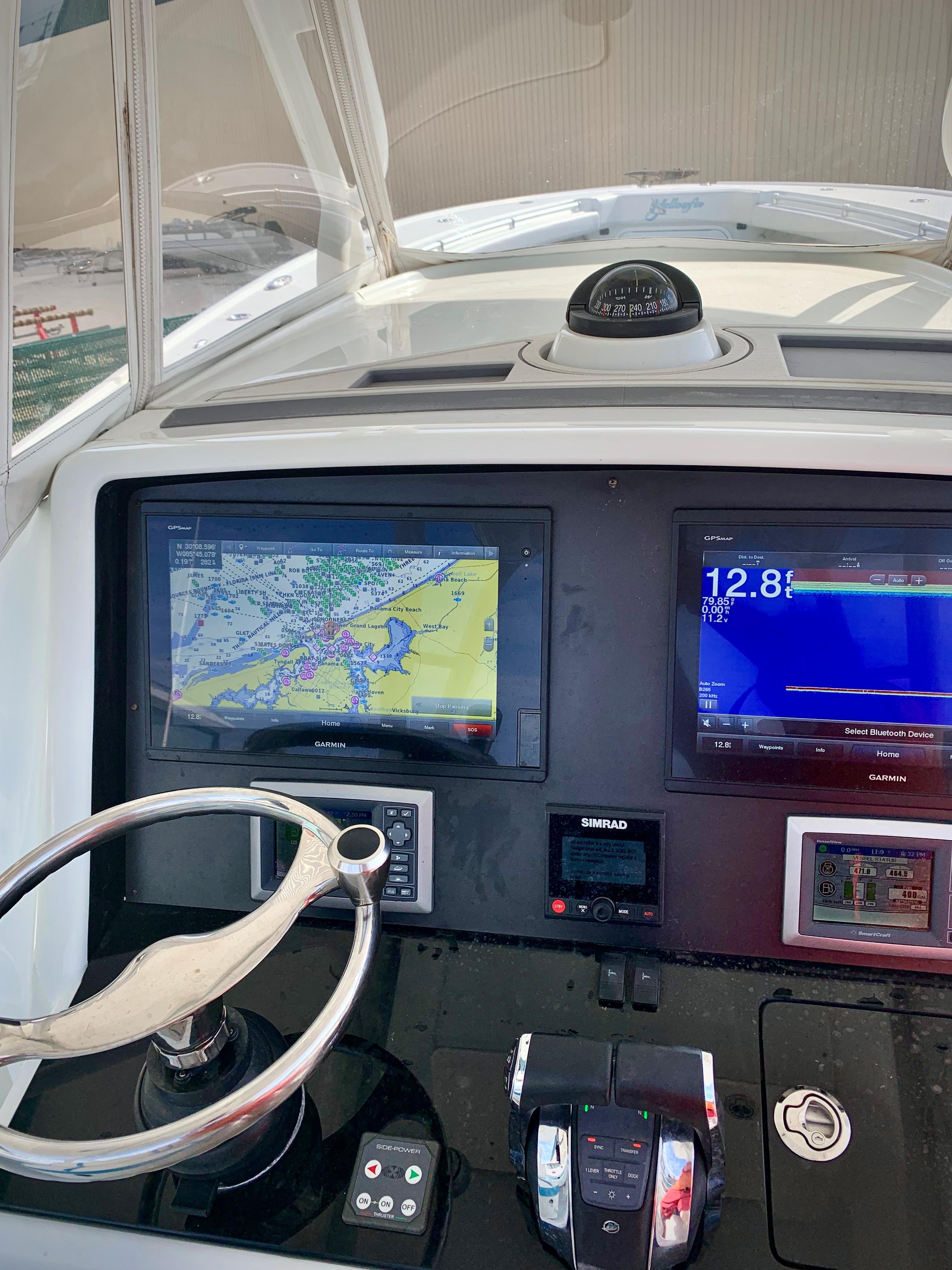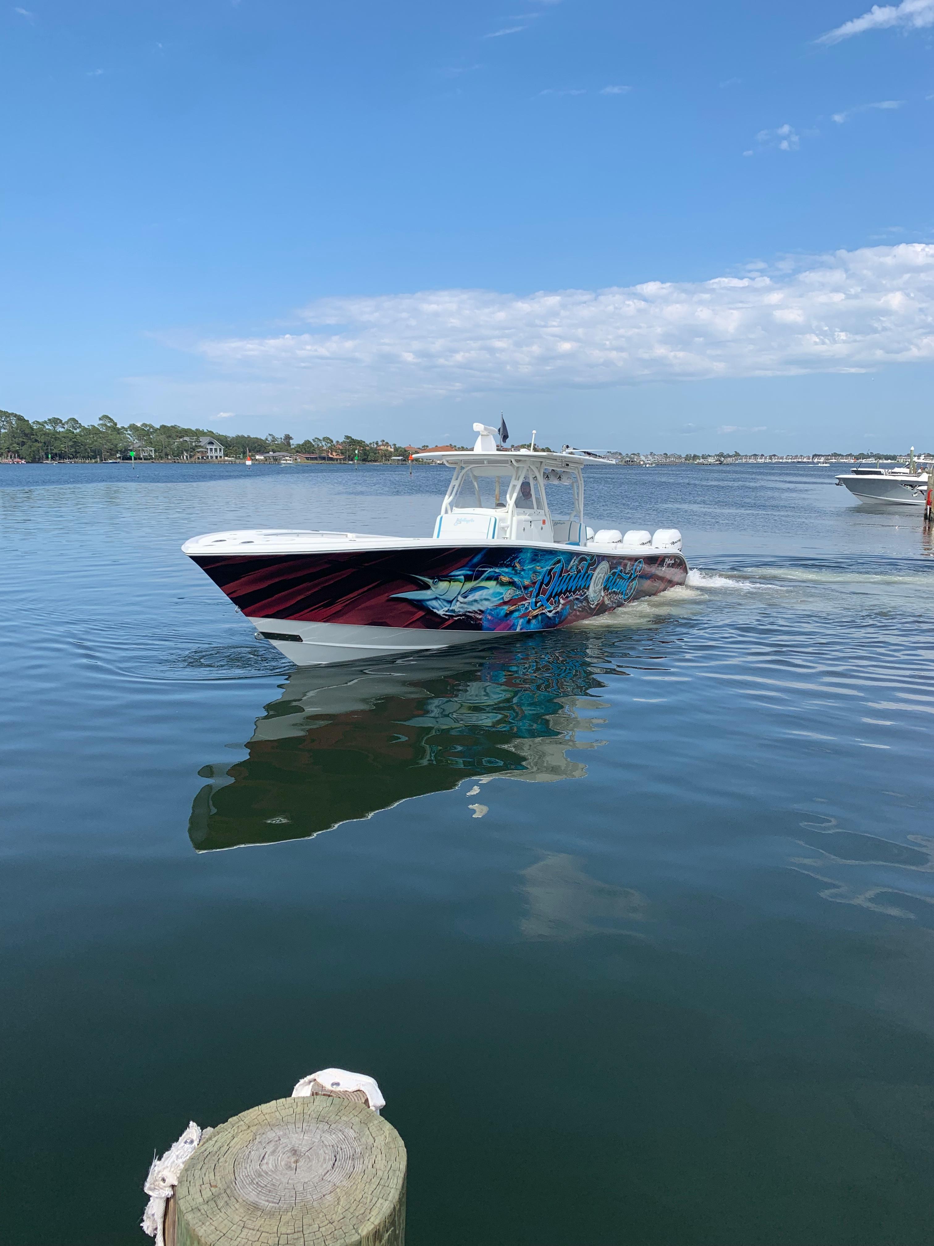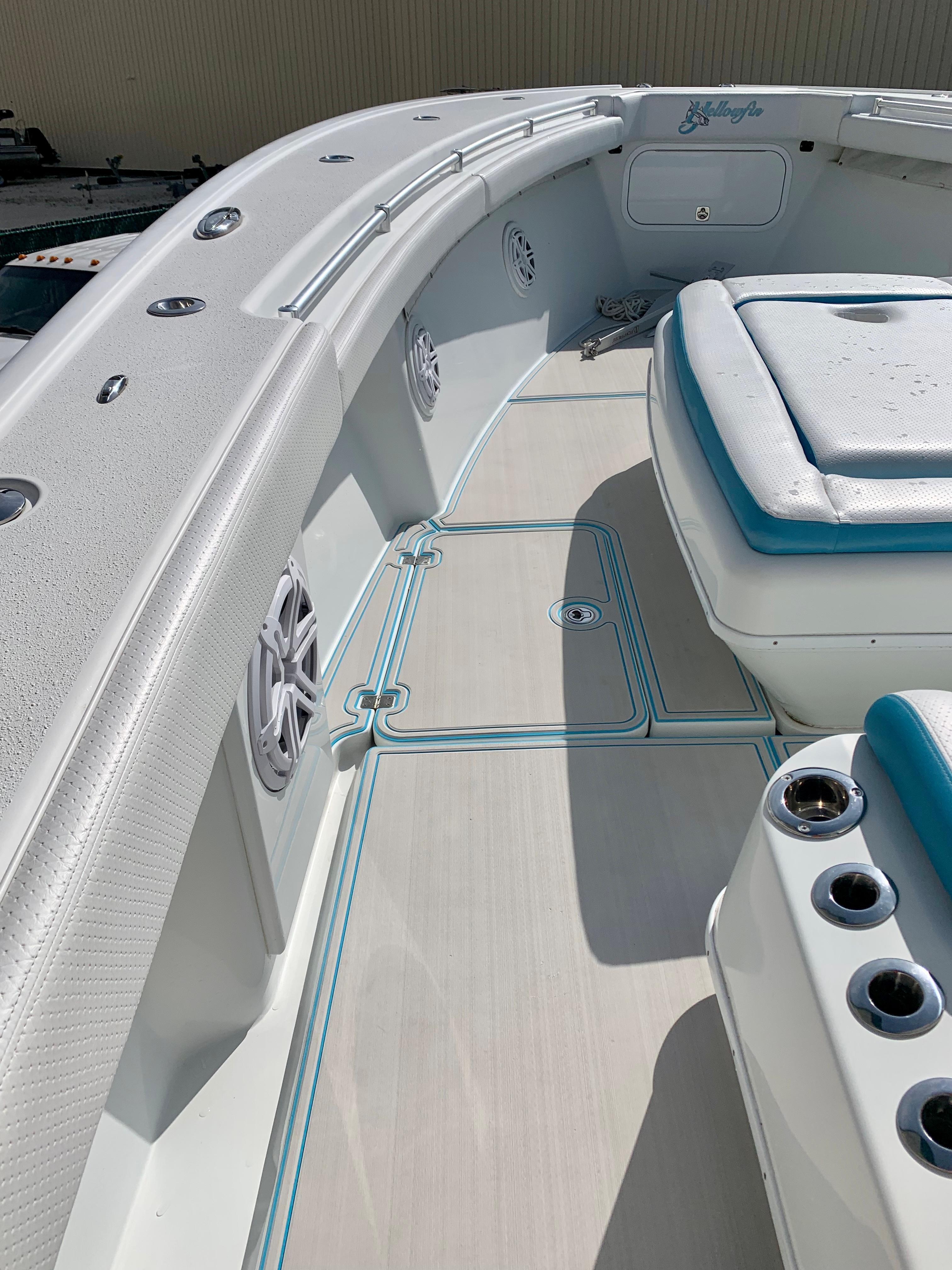 New in 2023 sea deck , New custom wrap, and all new cushions, with massive JL audio stereo, system , Garmin touch screen displays, 2KW transducer with amp. and always kept under cover her entire life.. Super clean , low hours 465 on 2018 Mercury Verrado’s and a meticulous Owner she has it all, she is truly turn key ready to fly with the top speed of 76 mph. She cruises 50 in style and comfort economically…. there’s not a cleaner, nicer 39 on the market today truly a turn key boat. … motivated seller .. Trades considered… Bring all offers